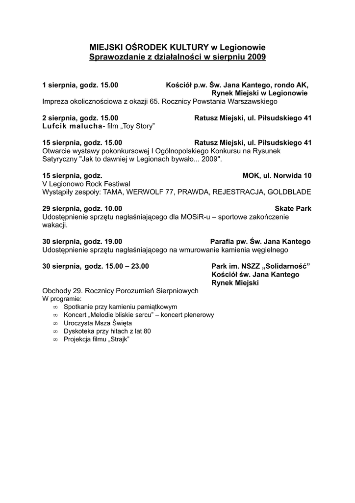 MIEJSKI OŚRODEK KULTURY w Legionowie Sprawozdanie z działalności w sierpniu 2009 1 sierpnia, godz. 15.00 Kościół p.w. Św. Jana Kantego, rondo AK, Rynek Miejski w Legionowie Impreza okolicznościowa z okazji 65. Rocznicy Powstania Warszawskiego 2 sierpnia, godz. 15.00 Lufcik malucha- film „Toy Story” Ratusz Miejski, ul. Piłsudskiego 41 15 sierpnia, godz. 15.00 Ratusz Miejski, ul. Piłsudskiego 41 Otwarcie wystawy pokonkursowej I Ogólnopolskiego Konkursu na Rysunek Satyryczny "Jak to dawniej w Legionach bywało... 2009". 15 sierpnia, godz. MOK, ul. Norwida 10 V Legionowo Rock Festiwal Wystąpiły zespoły: TAMA, WERWOLF 77, PRAWDA, REJESTRACJA, GOLDBLADE 29 sierpnia, godz. 10.00 Skate Park Udostępnienie sprzętu nagłaśniającego dla MOSiR-u – sportowe zakończenie wakacji. 30 sierpnia, godz. 19.00 Parafia pw. Św. Jana Kantego Udostępnienie sprzętu nagłaśniającego na wmurowanie kamienia węgielnego 30 sierpnia, godz. 15.00 – 23.00 Park im. NSZZ „Solidarność” Kościół św. Jana Kantego Rynek Miejski Obchody 29. Rocznicy Porozumień Sierpniowych W programie: • Spotkanie przy kamieniu pamiątkowym • Koncert „Melodie bliskie sercu” – koncert plenerowy • Uroczysta Msza Święta • Dyskoteka przy hitach z lat 80 • Projekcja filmu „Strajk”