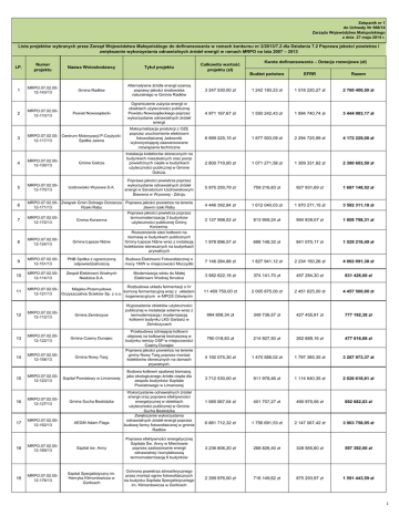Załącznik nr 1 do Uchwały Nr 568/14 Zarządu Województwa Małopolskiego z dnia 27 maja 2014 r. Lista projektów wybranych przez Zarząd Województwa Małopolskiego do dofinansowania w ramach konkursu nr 2/2013/7.2 dla Działania 7.2 Poprawa jakości powietrza i zwiększenie wykorzystania odnawialnych źródeł energii w ramach MRPO na lata 2007 – 2013 LP. Numer projektu Nazwa Wnioskodawcy Tytuł projektu Całkowita wartość projektu (zł) Kwota dofinansowania – Dotacja rozwojowa (zł) Budżet państwa EFRR Razem Gmina Radłów Alternatywne źródła energii szansą poprawy jakości środowiska naturalnego w Gminie Radłów 3 247 530,00 zł 1 242 180,23 zł 1 518 220,27 zł 2 760 400,50 zł Powiat Nowosądecki Ograniczenie zużycia energii w obiektach użyteczności publicznej Powiatu Nowosądeckiego poprzez wykorzystanie odnawialnych źródeł energii 4 971 167,67 zł 1 550 242,43 zł 1 894 740,74 zł 3 444 983,17 zł Maksymalizacja produkcji z OZE poprzez uruchomienie elektrowni fotowoltaicznej Jadowniki wykorzystującej zaawansowane rozwiązania techniczne 6 999 225,15 zł 1 877 503,09 zł 2 294 725,99 zł 4 172 229,08 zł Gmina Gołcza Instalacja kolektorów słonecznych na budynkach mieszkalnych oraz pomp powietrznych ciepła w budynkach użyteczności publicznej w Gminie Gołcza. 2 800 710,00 zł 1 071 271,58 zł 1 309 331,92 zł 2 380 603,50 zł Uzdrowisko Wysowa S.A. Poprawa jakości powietrza poprzez wykorzystanie odnawialnych źródeł energii w Sanatorium Uzdrowiskowym Biawena w Wysowej - Zdroju 5 975 250,79 zł 759 216,83 zł 927 931,69 zł 1 687 148,52 zł MRPO.07.02.00- Związek Gmin Dolnego Dorzecza Poprawa jakości powietrza na terenie 12-171/13 Rzeki Raby zlewni rzeki Raby 4 446 392,84 zł 1 612 040,03 zł 1 970 271,15 zł 3 582 311,18 zł 2 127 998,02 zł 813 959,24 zł 994 839,07 zł 1 808 798,31 zł 1 978 896,57 zł 688 148,32 zł 841 070,17 zł 1 529 218,49 zł 1 MRPO.07.02.0012-143/13 2 MRPO.07.02.0012-110/13 3 MRPO.07.02.00- Centrum Motoryzacji P.Czyżycki12-117/13 Spółka Jawna 4 MRPO.07.02.0012-130/13 5 MRPO.07.02.0012-170/13 6 Poprawa jakości powietrza poprzez termomodernizację 3 budynków użyteczności publicznej Gminy Korzenna. Rozszerzenie sieci kotłowni na biomasę w budynkach publicznych Gminy Łapsze Niżne wraz z instalacją kolektorów słonecznych na budynkach prywatnych 7 MRPO.07.02.0012-172/13 Gmina Korzenna 8 MRPO.07.02.0012-124/13 Gmina Łapsze Niżne 9 MRPO.07.02.0012-151/13 PNB Spółka z ograniczoną odpowiedzialnością Budowa Elektrowni Fotowoltaicznej o mocy 1MW w miejscowości Moczydło 7 146 284,88 zł 1 827 941,12 zł 2 234 150,26 zł 4 062 091,38 zł 10 MRPO.07.02.0012-114/13 Zespół Elektrowni Wodnych Niedzica S.A. Modernizacja wlotu do Małej Elektrowni Wodnej Smolice 3 582 622,18 zł 374 141,70 zł 457 284,30 zł 831 426,00 zł 11 Rozbudowa układu fermentacji o IV MRPO.07.02.00Miejsko-Przemysłowa komorę fermentacyjną wraz z układem 12-121/13 Oczyszczalnia Ścieków Sp. z o.o. kogeneracyjnym w MPOŚ Oświęcim 11 469 750,00 zł 2 005 875,00 zł 2 451 625,00 zł 4 457 500,00 zł 12 MRPO.07.02.0012-112/13 Gmina Zembrzyce 994 808,34 zł 349 736,57 zł 427 455,81 zł 777 192,38 zł 13 MRPO.07.02.0012-122/13 Gmina Czarny Dunajec 790 018,83 zł 214 927,50 zł 262 689,16 zł 477 616,66 zł 14 MRPO.07.02.0012-158/13 Gmina Nowy Targ 4 192 075,30 zł 1 470 588,02 zł 1 797 385,35 zł 3 267 973,37 zł 15 MRPO.07.02.0012-123/13 Szpital Powiatowy w Limanowej 3 712 530,00 zł 911 978,46 zł 1 114 640,35 zł 2 026 618,81 zł 16 MRPO.07.02.0012-127/13 Gmina Sucha Beskidzka 1 085 067,04 zł 401 707,27 zł 490 975,56 zł 892 682,83 zł 17 MRPO.07.02.0012-152/13 AEGM Adam Flaga 6 881 712,32 zł 1 756 691,53 zł 2 147 067,42 zł 3 903 758,95 zł 18 MRPO.07.02.0012-169/13 Szpital św. Anny Poprawa efektywności energetycznej Szpitala Św. Anny w Miechowie poprzez zastosowanie energii odnawialnej i kompleksową termomodernizację 6 budynków 3 236 606,20 zł 268 826,40 zł 328 565,60 zł 597 392,00 zł 19 MRPO.07.02.0012-178/13 Szpital Specjalistyczny im. Henryka Klimontowicza w Gorlicach Ochrona powietrza atmosferycznego przez montaż ogniw fotowoltaicznych na budynku Szpitala Specjalistycznego im. Klimontowicza w Gorlicach 2 399 976,00 zł 716 149,62 zł 875 293,97 zł 1 591 443,59 zł Wyposażenie obiektów użyteczności publicznej w instalacje solarne wraz z termodernizacją i modernizacją kotłowni budynku LKS Garbarz w Zembrzycach Przebudowa istniejącej kotłowni olejowej na kotłownię biomasową w budynku remizy OSP w miejscowości Czarny Dunajec Poprawa jakości powietrza na terenie gminy Nowy Targ poprzez montaż kolektorów słonecznych na domach prywatnych. Budowa kotłowni opalanej biomasą, jako ekologicznego źródła ciepła dla zespołu budynków Szpitala Powiatowego w Limanowej Wykorzystanie odnawialnych źródeł energii oraz poprawa efektywności energetycznej w obiektach użyteczności publicznej w Gminie Sucha Beskidzka Zwiększenie wykorzystania odnawialnych źródeł energii poprzez budowę farmy fotowoltaicznej w gminie Radłów 1 20 MRPO.07.02.0012-133/13 Gmina Miejska Kraków Odnawialne źródła energii na obiektach sportowych w Krakowie. 1 164 063,22 zł 361 995,27 zł 442 438,66 zł 804 433,93 zł 21 MRPO.07.02.0012-147/13 Gmina Mogilany “Ograniczenie zużycia energii w Szkole Podstawowej i Gimnazjum w Mogilanach poprzez wykorzystanie odnawialnych źródeł energii”. 868 345,56 zł 220 787,42 zł 269 851,29 zł 490 638,71 zł 22 MRPO.07.02.0012-156/13 Gmina Czorsztyn Termomodernizacja wraz z wymianą źródła ciepła na biomasową w budynku Zespołu Placówek Oświatowych w Sromowcach Niżnych. 1 272 380,00 zł 486 685,35 zł 594 837,65 zł 1 081 523,00 zł 23 MRPO.07.02.0012-163/13 10 893 067,00 zł 1 992 634,20 zł 2 435 441,80 zł 4 428 076,00 zł 24 MRPO.07.02.0012-134/13 Gmina Dobczyce Budowa instalacji fotowoltaicznej dla oczyszczalni ścieków w Dobczycach 1 229 748,00 zł 383 494,50 zł 468 715,