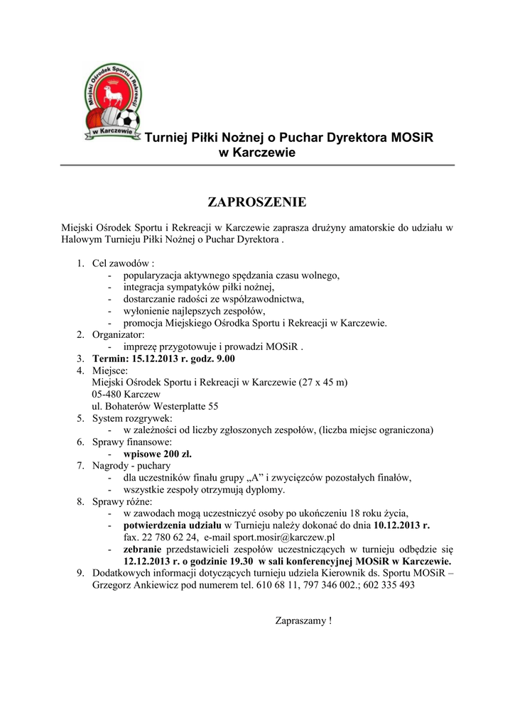 Turniej Piłki Nożnej o Puchar Dyrektora MOSiR w Karczewie ZAPROSZENIE Miejski Ośrodek Sportu i Rekreacji w Karczewie zaprasza drużyny amatorskie do udziału w Halowym Turnieju Piłki Nożnej o Puchar Dyrektora . 1. Cel zawodów : - popularyzacja aktywnego spędzania czasu wolnego, - integracja sympatyków piłki nożnej, - dostarczanie radości ze współzawodnictwa, - wyłonienie najlepszych zespołów, - promocja Miejskiego Ośrodka Sportu i Rekreacji w Karczewie. 2. Organizator: - imprezę przygotowuje i prowadzi MOSiR . 3. Termin: 15.12.2013 r. godz. 9.00 4. Miejsce: Miejski Ośrodek Sportu i Rekreacji w Karczewie (27 x 45 m) 05-480 Karczew ul. Bohaterów Westerplatte 55 5. System rozgrywek: - w zależności od liczby zgłoszonych zespołów, (liczba miejsc ograniczona) 6. Sprawy finansowe: - wpisowe 200 zł. 7. Nagrody - puchary - dla uczestników finału grupy „A” i zwycięzców pozostałych finałów, - wszystkie zespoły otrzymują dyplomy. 8. Sprawy różne: - w zawodach mogą uczestniczyć osoby po ukończeniu 18 roku życia, - potwierdzenia udziału w Turnieju należy dokonać do dnia 10.12.2013 r. fax. 22 780 62 24, e-mail [email protected] - zebranie przedstawicieli zespołów uczestniczących w turnieju odbędzie się 12.12.2013 r. o godzinie 19.30 w sali konferencyjnej MOSiR w Karczewie. 9. Dodatkowych informacji dotyczących turnieju udziela Kierownik ds. Sportu MOSiR – Grzegorz Ankiewicz pod numerem tel. 610 68 11, 797 346 002.; 602 335 493 Zapraszamy !