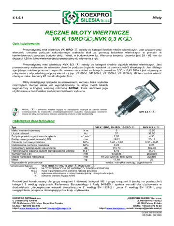 4.1.6.1 Młoty RĘCZNE MŁOTY WIERTNICZE VK K 15RO A ,NVK 0,3 K A Opis i użytkowanie: Pneumatyczny młot wiertniczy VK 15RO należy do kategorii lekkich młotów wiertniczych. Jest używany przy wierceniu otworów podczas sekundarnego urabiania skał za pomocą ładunków wiertniczych w pracach w kamieniołomach, podczas budowy dróg i koleji, w budownictwie itp. Wiercona średnica otworów jest 29 - 62 mm do długości 1,50 m. Młot wiertniczy jest przeznaczony do wiercenia z ręki. Pneumatyczny młot wiertniczy NVK 0,3 należy do kategorii średnio ciężkich młotów wiertniczych. Jest przeznaczony wyłącznie do wiercenia otworów podczas drążenia wyrobisk za pomocą robót strzałowych. Jest dlatego specjalnym młotem przeznaczonym dla zakresu nadciśnień ruchowych powietrza 0,30 – 0,45 MPa i jest używany w połączeniu z odpowiednią podporą wiertniczą (np. VP 600-1, VP 800-1, VP 1000-1, VP 1200-1). Młotem można wiercić otwory o maks. średnicy 42 mm do długości 6 m. Młoty składająsięz rękojeści ze sterowaniem, korpusu, tłoka i cylindra zrozrządem. Korpus młota jest wyprodukowany ze stopu metali lekkich iwyposażony w kryjącą warstwę ochronną ANTIAL, która umożliwia jego użytkowanie w środowiskuz niebezpieczeństwem wybuchu. ANTIAL - ochronna warstwa kryjąca na narzędziach ręcznych ze zlewów lekkich przeznaczonych do środowiska z niebezpieczeństwem wybuchu, wykluczająca powstanie inicjacji od iskry mechanicznej podczas uderzenia produktu w stal zardzewiałą. NVK 0,3 K Podstawowe dane techniczne: Typ Maks. moment obrotowy Liczba uderzeń Zużycie powietrza podczas obciążenia Podłączenie (powietrze/woda) DN Ciśnienie ruchowe powietrza Nadciśnienie ruchowe powietrza Namierzony poziom mocy akustycznej Frekwencyjnie ważona poziom przyspieszenia wibracji Wymiary (sz x dł) Stoper narzędzia roboczego Masa Wyposażenie podstawowe Oznakowanie typowe: VK/NVK 15/0,3 RO N.m Hz m3.min-1 mm MPa MPa dB m.s-2 mm mm kg VK K 15RO, 15-1RO, 15-2RO NVK 0,3 K 5 12,50 37 37,50 2,20 4,30 19/12 25/13 0,40 – 0,60 0,30 – 0,45 0,25 0,25 115,70 102,70 6,10 44,70 475x645 280x680 19; 22; 22x108; 108; 82,50 22x108 17,10 26 tulejka, nakrętka przeciąg, wypłukiwanie VK K 15RO, 15-1RO, 15-2RO /NVK 0,3 K MŁOT WIERTNICZY/MŁOT WIERTNICZY O NISKIM CIŚNIENIU masa w przybliżeniu/min. ciśnienie robocze powietrza wykonanie alternatywne z odprężone rękojeścią i niższych wibracjach ochronna warstwa kryjąca AntiAl Produkt jest konstruowany dla grupy urządzeń I (dołowe) kategorii M2 i grupy urządzeń II (ruchy na powierzchni) kategorii 2 według wytycznych Parlamentu Europejskiego i Rady 94/9/ES i spełnia warunki dla użytkowania w środowiskach „niebezpieczne warunki atmosferyczne 2“ według EN 1127-2 i „zona 1“ według EN 1127-1, przy uwzględnieniu przepisow obowiązujących w kraju użytkownika. KOEXPRO OSTRAVA, a.s. U Cementárny 1303/16 703 00 Ostrava – Vítkovice, Republika Czeska tel./fax: +420 596 633 923 http:// www.koexpro.cz; e-mail: [email protected] „KOEXPRO SILESIA“ Sp. z o.o. ul. Roosevelta 102/522 41 800 Zabrze, Polska tel./fax: +48 (32) 370 13 23 http:// www.koexpro.eu, e-mail: [email protected] CODE OS 01/2008 KX 1547, KX 1649
