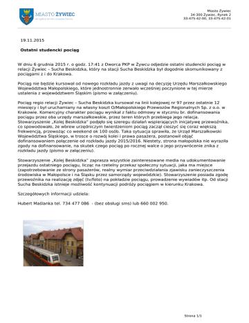 Miasto Żywiec 34-300 Żywiec, Rynek 2 33-475-42-00, 33-475-42-01 19.11.2015 Ostatni studencki pociąg W dniu 6 grudnia 2015 r. o godz. 17:41 z Dworca PKP w Żywcu odjedzie ostatni studencki pociąg w relacji Żywiec – Sucha Beskidzka, który na stacji Sucha Beskidzka był dogodnie skomunikowany z pociągami z i do Krakowa. Pociąg nie będzie kursował od nowego rozkładu jazdy z uwagi na decyzję Urzędu Marszałkowskiego Województwa Małopolskiego, które jednostronnie zerwało wcześniej poczynione w tej mierze ustalenia z województwem Śląskim (pismo w załączeniu). Pociąg regio relacji Żywiec – Sucha Beskidzka kursował na linii kolejowej nr 97 przez ostatnie 12 miesięcy i był uruchamiany na własny koszt O/Małopolskiego Przewozów Regionalnych Sp. z o.o. w Krakowie. Komercyjny charakter pociągu wynikał z faktu odmowy w styczniu br. dofinansowania pociągu przez oba urzędy marszałkowskie, przez teren których przebiega jego relacja. Stowarzyszenie „Kolej Beskidzka” podjęło się szeregu działań wspierających inicjatywę przewoźnika, co spowodowało, że wbrew urzędniczym twierdzeniom pociąg zaczął cieszyć się coraz większą frekwencją, przewożąc co weekend ok 100 osób. Taka sytuacja sprawiła, że Urząd Marszałkowski Województwa Śląskiego, w trosce o rozwój kolei i prawa pasażera, postanowił objąć dofinansowaniem połączenie od rozkładu jazdy 2015/2016. Niestety, strona małopolska nie wyraziła zgody na dofinansowanie, na skutek czego pociąg po rocznej walce o jego przywrócenie znika z rozkładu jazdy (pismo w załączeniu). Stowarzyszenie „Kolej Beskidzka” zaprasza wszystkie zainteresowane media na udokumentowanie przejazdu ostatniego pociągu, licząc na rzetelny przekaz społeczny sytuacji, jaka ma miejsce (zapotrzebowanie ze strony pasażerów, realny wymiar przeciwdziałania zjawisku zanieczyszczenia środowiska w Małopolsce i na Śląsku przez samorządy wojewódzkie). Stowarzyszenie posiada zgodę przewoźnika na realizację zdjęć (tv/foto) na pokładzie pociągu, prowadzenie wywiadów itp. Od stacji Sucha Beskidzka istnieje możliwość kontynuacji podróży pociągiem w kierunku Krakowa. Szczegółowych informacji udziela: Hubert Maślanka tel. 734 477 086 - (bez obsługi sms) lub 660 002 950. Strona 1/1 Powered by TCPDF (www.tcpdf.org)