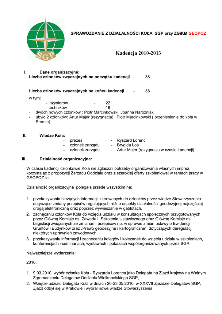 SPRAWOZDANIE Z DZIAŁALNOŚCI KOŁA SGP przy ZGiKM GEOPOZ Kadencja 2010-2013 I. Dane organizacyjne: Liczba członków zwyczajnych na początku kadencji - 38 Liczba członków zwyczajnych na końcu kadencji 38 - w tym: - - inżynierów 22 - techników 16 dwóch nowych członków : Piotr Marcinkowski, Joanna Narożniak ubyło 2 członków: Artur Majer (rezygnacja) , Piotr Marcinkowski ( przeniesienie do koła w Śremie) II. III. Władze Koła: - prezes członek zarządu członek zarządu - Ryszard Lorenc Brygida Łoś Artur Majer (rezygnacja w czasie kadencji) Działalność organizacyjna: W czasie kadencji członkowie Koła nie zgłaszali potrzeby organizowania własnych imprez, korzystając z propozycji Zarządu Oddziału oraz z szerokiej oferty szkoleniowej w ramach pracy w GEOPOZ-ie. Działalność organizacyjna polegała przede wszystkim na: 1. przekazywaniu bieżących informacji kierowanych do członków przez władze Stowarzyszenia dotyczące zmiany przepisów regulujących różne aspekty działalności geodezyjnej najczęściej drogą elektroniczną oraz poprzez wywieszanie w gablotach, 2. zachęcaniu członków Koła do wzięcia udziału w konsultacjach społecznych przygotowanych przez Główną Komisję ds. Zawodu i Szkolenia Ustawicznego oraz Główną Komisję ds. Legislacji związanych ze zmianami przepisów np. w sprawie zmian ustawy o Ewidencji Gruntów i Budynków oraz „Prawo geodezyjne i kartograficzne”, dotyczących deregulacji niektórych uprawnień zawodowych, 3. przekazywaniu informacji i zachęcaniu kolegów i koleżanek do wzięcia udziału w szkoleniach, konferencjach i seminariach, wystawach i pokazach współorganizowanych przez SGP. Najważniejsze wydarzenia: 2010: 1. 9.03.2010 wybór członka Koła - Ryszarda Lorenca jako Delegata na Zjazd krajowy na Walnym Zgromadzeniu Delegatów Oddziału Wielkopolskiego SGP, 2. Wzięcie udziału Delegata Koła w dniach 20-23.05.2010 w XXXVII Zjeździe Delegatów SGP, Zjazd odbył się w Krakowie i wybrał nowe władze Stowarzyszenia, 3. 5.08.2010 przyjęto nowego członka Koła kol. Piotra Marcinkowskiego 4. 17.11.2010 - członkowie Koła wzięli udział w Konferencji na Uniwersytecie im. Adama Mickiewicza w Collegium Geographicum w ramach obchodów GIS DAY . Na konferencji wysłuchano też referatu GEOPOZ-u prezentującego przeglądarkę internetową baz danych SIP GEO-INFO oraz zamawianie prac geodezyjnych przez Internet. Na GIS DAY członkowie Koła byli obecni również w latach 2011 i 2012, 5. 24.11.2010 w Szreniawie członkowie Koła wzięli udział w seminarium z cyklu „Rozwój Obszarów Wiejskich”. 2011: 1. 18.01.2011 w Salonie Muzycznym Feliksa Nowowiejskiego w „Willi wśród róż”, wygłoszono odczyt na temat: „Życie i twórczość Feliksa Nowowiejskiego” patrioty i wybitnej sławy kompozytora” oraz przyjęto nowego członka Koła kol. Joannę Narożniak, 2. 5.02.2011 - w Warszawie kol. Krzysztof Leszczyński odbył szkolenie moderatora strony internetowej Stowarzyszenia Geodetów Polskich aby posiąść umiejętności wprowadzania zawartości strony internetowej SGP w zakresie niezbędnym do publikowania informacji lokalnych z wielkopolski. Szkolenie nie było jednak dobrze przygotowane. Do tej pory, pomimo prób, nie udało się jej uzyskać dostępu do edycji strony, 3. 27.03.2011 – wzięto udział w Seminarium z cyklu : “Granice RP 1919 r.” nt.: „Powstanie Wielkopolski a granice RP. Gen. Józef Dowbór – Muśnicki”, które odbyło się w Muzeum Powstania Wielkopolskiego w Lusowie w gm. Tarnowo Podgórne, 4. 24-27.08.2011 w Olecku odbyło się seminarium na temat „Wybrane najtrudniejsze zagadnienia formalno-prawne w pracach geodezyjno-kartograficznych” oraz Mistrzostwa Polski Geodetów w tenisie ziemnym (tym razem bez znacznych osiągnięć; w 2010 r. 3 miejsce w deblu, 4 miejsce w kategorii do 55 lat, 2012r. – 2 miejsce) 5. 5.08.2011 - członkowie Koła byli współorganizatorami i wzięli liczny udział w seminarium z okazji Jubileuszu 20-lecia Zarządu Geodezji i Katastru Miejskiego GEOPOZ. 2012: 1. 12.05.2012 – członkowie Koła uczestniczyli w seminarium nt. „Królewskie Pyzdry na starych mapach” zorganizowane przez Muzeum Ziemi Pyzdrskiej, Wielkopolski Zarząd Parków Krajobrazowych, Stowarzyszenie Architektów RP O/Poznań, OW SGP, 2. 7.09.2012 – przy okazji obchody 60-tej rocznicy powstania Oddziału SGP w Koszalinie przedstawiciele Koła uczestniczyli w Ogólnopolskim Zlocie Geodetów, 3. 7.11.2012 - w Szreniawie członkowie Koła wysłuchali referatów na temat przemian strukturalnych obszarów wiejskich i problemów rozwojowych wsi na corocznej konferencji, 4. sporządzono listę członków Koła zgodnie z wymaganiami Zarządu. 2013: 1. 12.02.2013 – dokonano uroczystego otwarcia Koła SGP w Śremie Członkowie Koła brali udział w licznych wykładach i odczytach w ramach zebrań otwartych Zarządu Oddziału SGP, wystawach tematycznych i pokazach sprzętu geodezyjnego organizowanych przy okazji seminariów i konferencji.