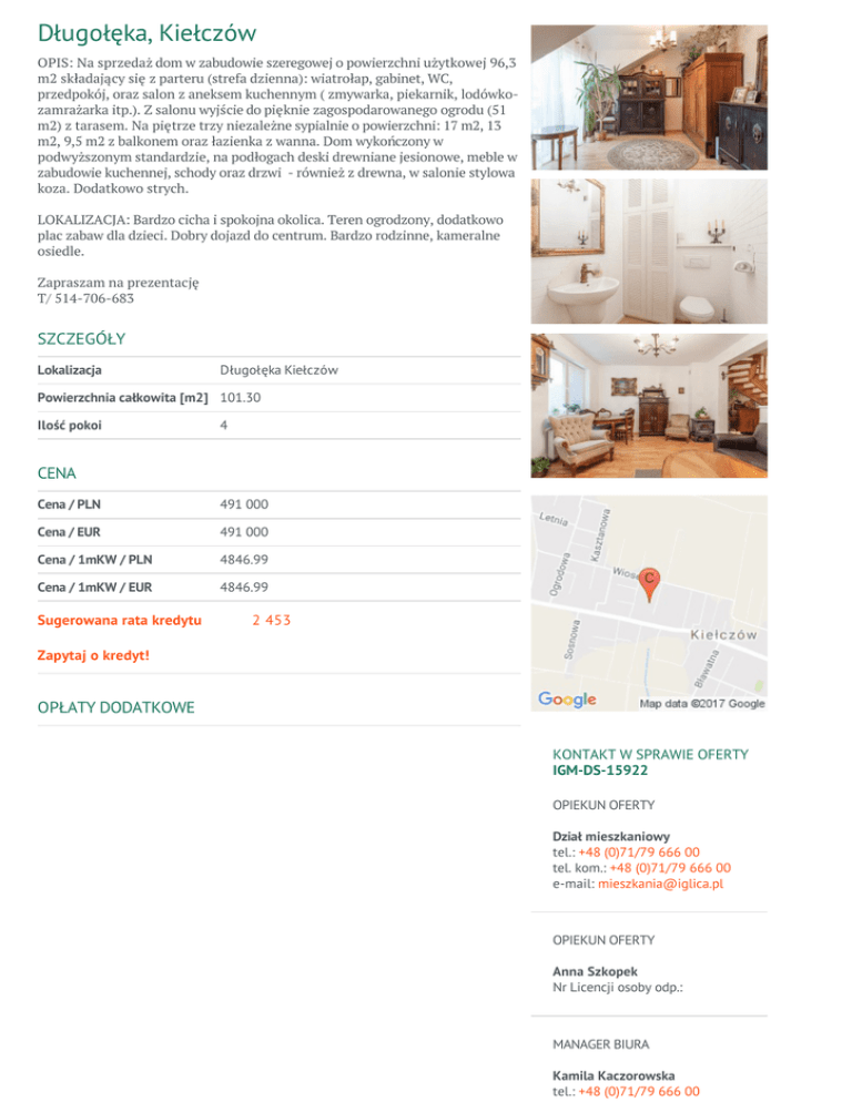 Długołęka, Kiełczów OPIS: Na sprzedaż dom w zabudowie szeregowej o powierzchni użytkowej 96,3 m2 składający się z parteru (strefa dzienna): wiatrołap, gabinet, WC, przedpokój, oraz salon z aneksem kuchennym ( zmywarka, piekarnik, lodówkozamrażarka itp.). Z salonu wyjście do pięknie zagospodarowanego ogrodu (51 m2) z tarasem. Na piętrze trzy niezależne sypialnie o powierzchni: 17 m2, 13 m2, 9,5 m2 z balkonem oraz łazienka z wanna. Dom wykończony w podwyższonym standardzie, na podłogach deski drewniane jesionowe, meble w zabudowie kuchennej, schody oraz drzwi - również z drewna, w salonie stylowa koza. Dodatkowo strych. LOKALIZACJA: Bardzo cicha i spokojna okolica. Teren ogrodzony, dodatkowo plac zabaw dla dzieci. Dobry dojazd do centrum. Bardzo rodzinne, kameralne osiedle. Zapraszam na prezentację T/ 514-706-683 SZCZEGÓŁY Lokalizacja Długołęka Kiełczów Powierzchnia całkowita [m2] 101.30 Ilość pokoi 4 CENA Cena / PLN 491 000 Cena / EUR 491 000 Cena / 1mKW / PLN 4846.99 Cena / 1mKW / EUR 4846.99 Sugerowana rata kredytu 2 453 Zapytaj o kredyt! OPŁATY DODATKOWE KONTAKT W SPRAWIE OFERTY IGM-DS-15922 OPIEKUN OFERTY Dział mieszkaniowy tel.: +48 (0)71/79 666 00 tel. kom.: +48 (0)71/79 666 00 e-mail: [email protected] OPIEKUN OFERTY Anna Szkopek Nr Licencji osoby odp.: MANAGER BIURA Kamila Kaczorowska tel.: +48 (0)71/79 666 00 tel. kom.: +48 514 706 681 e-mail: [email protected]