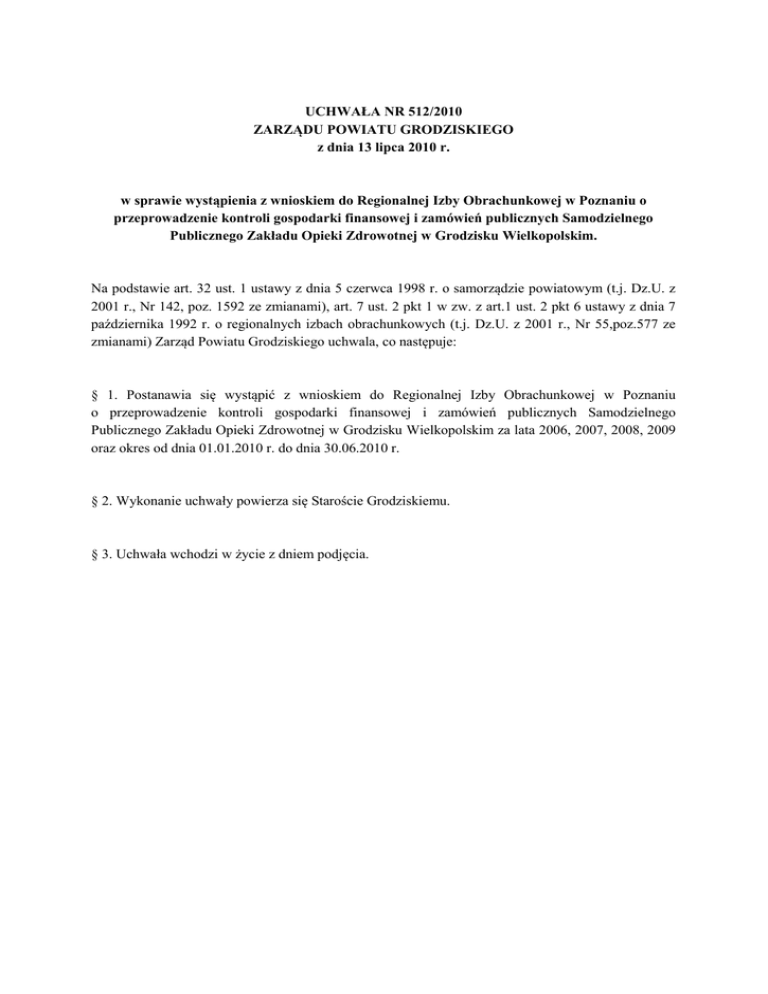 UCHWAŁA NR 512/2010 ZARZĄDU POWIATU GRODZISKIEGO z dnia 13 lipca 2010 r. w sprawie wystąpienia z wnioskiem do Regionalnej Izby Obrachunkowej w Poznaniu o przeprowadzenie kontroli gospodarki finansowej i zamówień publicznych Samodzielnego Publicznego Zakładu Opieki Zdrowotnej w Grodzisku Wielkopolskim. Na podstawie art. 32 ust. 1 ustawy z dnia 5 czerwca 1998 r. o samorządzie powiatowym (t.j. Dz.U. z 2001 r., Nr 142, poz. 1592 ze zmianami), art. 7 ust. 2 pkt 1 w zw. z art.1 ust. 2 pkt 6 ustawy z dnia 7 października 1992 r. o regionalnych izbach obrachunkowych (t.j. Dz.U. z 2001 r., Nr 55,poz.577 ze zmianami) Zarząd Powiatu Grodziskiego uchwala, co następuje: § 1. Postanawia się wystąpić z wnioskiem do Regionalnej Izby Obrachunkowej w Poznaniu o przeprowadzenie kontroli gospodarki finansowej i zamówień publicznych Samodzielnego Publicznego Zakładu Opieki Zdrowotnej w Grodzisku Wielkopolskim za lata 2006, 2007, 2008, 2009 oraz okres od dnia 01.01.2010 r. do dnia 30.06.2010 r. § 2. Wykonanie uchwały powierza się Staroście Grodziskiemu. § 3. Uchwała wchodzi w życie z dniem podjęcia. UZASADNIENIE do UCHWAŁY NR 512/2010 ZARZĄDU POWIATU GRODZISKIEGO z dnia 13 lipca 2010 r. w sprawie wystąpienia z wnioskiem do Regionalnej Izby Obrachunkowej w Poznaniu o przeprowadzenie kontroli gospodarki finansowej i zamówień publicznych Samodzielnego Publicznego Zakładu Opieki Zdrowotnej w Grodzisku Wielkopolskim. W Samodzielnym Publicznym Zakładzie Opieki Zdrowotnej w Grodzisku Wielkopolskim w okresie po 2005 roku trzykrotnie zmieniała się osoba dyrektora. W przeprowadzonej przez Wielkopolskie Centrum Zdrowia Publicznego w Poznaniu kontroli za lata 2006 i 2007 zastosowano częściowo błędne metody, przez co kontrola ta nie dała w pełni wiarygodnego odzwierciedlenia gospodarki finansowej badanej jednostki (co zostało przyznane w piśmie Dyrektora Wielkopolskiego Centrum Zdrowia Publicznego w Poznaniu z dnia 02 marca 2009 r.). Ponadto obecny Dyrektor Samodzielnego Publicznego Zakładu Opieki Zdrowotnej w Grodzisku Wielkopolskim na sesjach Rady Powiatu Grodziskiego w dniach 25 maja 2010 r. i 30 czerwca 2010 r. oraz na posiedzeniu Zarządu Powiatu Grodziskiego w dniu 08 czerwca 2010 r. przekazał informacje o podejrzeniu wystąpienia licznych nieprawidłowości w zakresie prowadzenia gospodarki finansowej szpitala, w szczególności w zakresie dokonywania wydatków bez pokrycia w planie finansowym jednostki, bez wymaganej procedury zamówień publicznych, nieregulowania lub nieterminowego regulowania zobowiązań, w tym publicznoprawnych, niezgodnej z prawem gospodarki mieniem. Ponieważ sytuacja finansowa Samodzielnego Publicznego Zakładu Opieki Zdrowotnej w Grodzisku Wielkopolskim pogarsza się, powtarzają się zarzuty nieprawidłowości w prowadzeniu gospodarki finansowej, a poprzedni Dyrektor odmawiał współpracy z organem założycielskim jako organem nadzoru i utrudniał prowadzenie kontroli odmawiając udostępnienia części dokumentów, natomiast wyniki przeprowadzonej kontroli, obejmującej wcześniejszy okres, okazały się tylko częściowo wiarygodne, zachodzi konieczność kompleksowej kontroli gospodarki finansowej Samodzielnego Publicznego Zakładu Opieki Zdrowotnej w Grodzisku Wielkopolskim przez zewnętrzny, niezależny i wyspecjalizowany podmiot obejmującej lata 2006, 2007, 2008, 2009 oraz okres od dnia 01.01.2010 r. do dnia 30.06.2010 r. Ponadto na sesji Rady Powiatu Grodziskiego w dniu 30 czerwca 2010 r. grupa radnych z Klubu Radnych „Forum Obywatelskie” wystąpiła do Zarządu Powiatu z inicjatywą skierowania do Regionalnej Izby Obrachunkowej wniosku o przeprowadzenie kontroli za lata 2008, 2009 oraz za okres od dnia 01.01.2010 r. do dnia 30.06.2010 r. Zgodnie z art. 1 ust. 1 i ust. 2 pkt. 6 ustawy z dnia 7 października 1992 r. o regionalnych izbach obrachunkowych (t.j. Dz.U. z 2001 r., Nr 55, poz. 577 ze zmianami) regionalne izby obrachunkowe są państwowymi organami kontroli gospodarki finansowej i zamówień publicznych samorządowych jednostek organizacyjnych, w tym samorządowych osób prawnych. Zgodnie z art. 7 ust. 2 pkt 1 powołanej ustawy regionalne izby obrachunkowe mogą przeprowadzać kontrolę w w/w jednostkach na wniosek jednostek samorządu terytorialnego. W związku z powyższym, Zarząd Powiatu Grodziskiego postanowił wystąpić do Regionalnej Izby Obrachunkowej w Poznaniu z odpowiednim wnioskiem o przeprowadzenie kontroli gospodarki finansowej Samodzielnego Publicznego Zakładu Opieki Zdrowotnej w Grodzisku Wlkp.