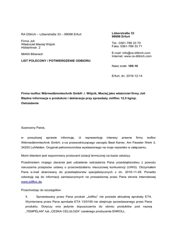 RA Dittrich – Löberstraße 33 – 99096 Erfurt Löberstraße 33 99096 Erfurt Firma Joli Właściciel Maciej Wójcik Hölderlinstr. 2 Tel.: 0361-789 33 70 Faks: 0361-789 33 71 88400 Biberach E-mail: [email protected] Internet: www.ra-dittrich.com LIST POLECONY / POTWIERDZENIE ODBIORU Nasz znak: 185-16 Erfurt, dn. 2016-12-14 Firma isofloc Wärmedämmtechnik GmbH ./. Wójcik, Maciej jako właściciel firmy Joli Błędna informacja o produkcie i deklaracja przy sprzedaży Jolifloc 12,5 kg/op. Ostrzeżenie Szanowny Panie, w powyższej sprawie informuję, iż reprezentuję interesy prawne firmy isofloc Wärmedämmtechnik GmbH, z-ca przewodniczącego zarządu Beat Karrer, Am Fieseler Werk 3, 34253 Lohfelden. Oryginał pełnomocnictwa wystawionego na moje nazwisko w załączeniu. Moim klientem jest wspomniany producent izolacji termicznej na bazie celulozy. Przedmiotem mojego zlecenia jest udzielenie ostrzeżenia Pana przedsiębiorstwu z powodu naruszenia przepisów ustawy o przeciwdziałaniu nieuczciwej konkurencji (UWG). Otrzymałem Pana e-mail skierowany do przedsiębiorstw specjalistycznych z dn. 2016-11-29. Ponadto odwołuję się do informacji zamieszczonych na prowadzonej przez Pana stronie internetowej www.jolifloc.de. Przechodząc do szczegółów: 1. Sprzedawany przez Pana produkt „Jolifloc” nie posiada aktualnej aprobaty ETA. Wymieniana przez Pana aprobata ETA 13/0159 nie obejmuje sprzedawanego przez Pana produktu. Dotyczy ona jedynie dopuszczenia do obrotu produktów pod nazwą „TEMPELAN” lub „CESKA CELULOZA” czeskiego producenta ENROLL. Pismo z dn. 14.12.2016 r. Strona 2 z 5 2. Sprzedawana przez Pana celuloza do wdmuchiwania pod marką Jolifloc dostarczana jest w workach. Zgodnie z informacjami zawartymi na ww. stronie internetowej worki oznaczone są m.in. informacją „ETA-13/0159”. Jednak aprobata ta dotyczy jedynie dopuszczenia do obrotu produktów pod nazwą „TEMPELAN” lub „CESKA CELULOZA” czeskiego producenta ENROLL. Nie obejmuje ona promowanej przez Pana marki handlowej „Jolifloc”. Dlatego nie jest Pan uprawniony do korzystania z oznakowania CE w połączeniu z ETA-13/0159. 3. W opisie stosowanych przez Pana worków na produkt opatrzonych nazwą „jolifloc” znajduje się informacja o współczynniku przewodzenia ciepła celulozy do wdmuchiwania wynoszącym 0,039. Informacja ta w połączeniu ze wspomnianą ETA-13/0159 wprowadza w błąd, ponieważ dla produktu o nazwie „jolifloc” nie istnieje stosowna ETA. 4. Na ww. stronie internetowej w rubryce „Jolifloc-zellulose Einblasdämmung” zamieszczone zostały wprowadzające w błąd informacje dotyczące współczynnika przewodzenia ciepła. Pisze Pan tam: „Parametry użytkowe izolacji termicznej z celulozy sprawiają, że ma ona przewagę termoizolacyjnymi. nad Jej wszelkimi współczynnik innymi materiałami przewodzenia ciepła (lambda) wynosi 0,037 W(m K).“ To stwierdzenie jest błędne. Nawet gdyby dla produktu pod nazwą „jolifloc” istniały odrębna aprobata ETA - czego dotąd nie dowiedziono - zadeklarowany współczynnik przewodzenia ciepła wynosiłby 0,039 W(mK), a nie, jak Pan podaje 0,037 W(mK). 5. Na ww. stronie internetowej w punkcie 4.) wspomnianej rubryki udziela Pan ponadto fałszywych informacji dotyczących klasy reakcji na ogień produktu „jolifloc”. Deklaruje Pan klasę „Bfl-s1” i jest to tym samym informacja błędna, ponieważ dotyczy ona nie materiałów termoizolacyjnych, a jedynie wyrobów posadzkowych. 6. Na ww. stronie internetowej w punkcie 4.) wspomnianej rubryki zamieszcza Pan niedozwolone informacje, oświadczając tam: „Zawartość boru w celulozowym materiale izolacyjnym dodatkowo chroni drewno konstrukcyjne otoczone celulozowym materiałem izolacyjnym, ponieważ warunki dla rozwoju szkodników i mikroorganizmów są niekorzystne.” Sugeruje Pan tym sformułowaniem, że bor posiada działanie biobójcze. Tego typu stwierdzenia są jednak niedozwolone, ponieważ stanowią one naruszenie przepisów rozporządzenia o produktach biobójczych. Pismo z dn. 14.12.2016 r. Strona 3 z 5 7. W swojej prezentacji internetowej korzysta Pan z nagrania wideo Europejskiego Stowarzyszenia Izolacji Celulozowych. Jednak zgodnie z informacjami przekazanymi mi przez klienta, nie jest Pan członkiem tego stowarzyszenia. Mój klient ma w związku z tym wątpliwości, czy ma Pan prawo do wykorzystywania wspomnianego nagrania do własnych celów zawodowych. Jest Pan zobowiązany do udowodnienia, iż takie prawo Panu przysługuje. Tym samym, zmuszony jestem stwierdzić, że, na podstawie stanu opisanego w punktach 1.)-7.), naruszył Pan przepisy UWG, w szczególności: – § 3 I UWG - Zakaz nieuczciwych działań handlowych, które w sposób istotny oddziałują na interesy konkurentów, konsumentów lub innych uczestników rynku, – § 5 I UWG - Wprowadzające w błąd działania handlowe w postaci udzielania nieprawdziwych lub mylących informacji na temat istotnych cech towaru, takich jak ryzyko, skład, itp., – § 5a I UWG - Wprowadzenie w błąd poprzez pomijanie faktów, istotnych dla podejmowania decyzji handlowych na podstawie poglądów zwyczajowych. Mój klient, będący znanym wytwórcą celulozowych materiałów termoizolacyjnych nie akceptuje tego typu naruszeń i ma dlatego prawo zażądać od Pana przedsiębiorstwa zaprzestania tego typu działań zgodnie z § 8 I UWG. Tym samym w imieniu i z upoważnienia mojego klienta udzielam Panu formalnego ostrzeżenia wraz z żądaniem, aby niezwłocznie, najpóźniej jednak do dn. 16 grudnia 2016 r. dowiódł Pan, że dla sprzedawanego przez Pana produktu pod nazwą „Jolifloc” istnieje – odrębna aprobata ETA, a jeżeli nie, aby niezwłocznie zaniechał Pan sprzedaży produktu, do czasu możliwości przedłożenia aktualnej aprobaty ETA; – zaprzestał Pan stosowania oznakowania CE w połączeniu z oznaczeniem ETA-13/0159; – zaprzestał Pan umieszczania na stosowanych workach na produkt opatrzon