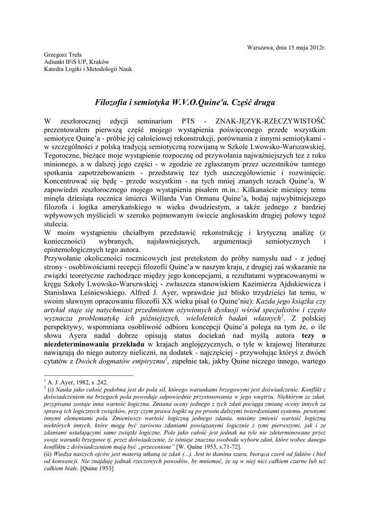 Warszawa, dnia 15 maja 2012r. Grzegorz Trela Adiunkt IFiS UP, Kraków Katedra Logiki i Metodologii Nauk Filozofia i semiotyka W.V.O.Quine'a. Część druga W zeszłorocznej edycji seminarium PTS - ZNAK-JĘZYK-RZECZYWISTOŚĆ prezentowałem pierwszą część mojego wystąpienia poświęconego przede wszystkim semiotyce Quine’a - próbie jej całościowej rekonstrukcji, porównania z innymi semiotykami w szczególności z polską tradycją semiotyczną rozwijaną w Szkole Lwowsko-Warszawskiej. Tegoroczne, bieżące moje wystąpienie rozpocznę od przywołania najważniejszych tez z roku minionego, a w dalszej jego części - w zgodzie ze zgłaszanym przez uczestników tamtego spotkania zapotrzebowaniem - przedstawię tez tych uszczegółowienie i rozwinięcie. Koncentrować się będę - przede wszystkim - na tych mniej znanych tezach Quine’a. W zapowiedzi zeszłorocznego mojego wystąpienia pisałem m.in.: Kilkanaście miesięcy temu minęła dziesiąta rocznica śmierci Willarda Van Ormana Quine’a, bodaj najwybitniejszego filozofa i logika amerykańskiego w wieku dwudziestym, a także jednego z bardziej wpływowych myślicieli w szeroko pojmowanym świecie anglosaskim drugiej połowy tegoż stulecia. W moim wystąpieniu chciałbym przedstawić rekonstrukcję i krytyczną analizę (z konieczności) wybranych, najsławniejszych, argumentacji semiotycznych i epistemologicznych tego autora. Przywołanie okoliczności rocznicowych jest pretekstem do próby namysłu nad - z jednej strony - osobliwościami recepcji filozofii Quine’a w naszym kraju, z drugiej zaś wskazanie na związki teoretyczne zachodzące między jego koncepcjami, a rezultatami wypracowanymi w kręgu Szkoły Lwowsko-Warszwskiej - zwłaszcza stanowiskiem Kazimierza Ajdukiewicza i Stanisława Leśniewskiego. Alfred J. Ayer, wprawdzie już blisko trzydzieści lat temu, w swoim sławnym opracowaniu filozofii XX wieku pisał (o Quine’nie): Każda jego książka czy artykuł staje się natychmiast przedmiotem ożywionych dyskusji wśród specjalistów i często wyznacza problematykę ich późniejszych, wieloletnich badań własnych1. Z polskiej perspektywy, wspomniana osobliwość odbioru koncepcji Quine’a polega na tym że, o ile słowa Ayera nadal dobrze opisują status dociekań nad myślą autora tezy o niezdeterminowaniu przekładu w krajach anglojęzycznych, o tyle w krajowej literaturze nawiązują do niego autorzy nieliczni, na dodatek - najczęściej - przywołując któryś z dwóch cytatów z Dwóch dogmatów empiryzmu2, zupełnie tak, jakby Quine niczego innego, wartego 1 A. J .Ayer, 1982, s .242. (i) Nauka jako całość podobna jest do pola sił, którego warunkami brzegowymi jest doświadczenie. Konflikt z doświadczeniem na brzegach pola powoduje odpowiednie przystosowania w jego wnętrzu. Niektórym ze zdań, przypisana zostaje inna wartość logiczna. Zmiana oceny jednego z tych zdań pociąga zmianę oceny innych za sprawą ich logicznych związków, przy czym prawa logiki są po prostu dalszymi twierdzeniami systemu, pewnymi innymi elementami pola. Zmieniwszy wartość logiczną jednego zdania, musimy zmienić wartość logiczną niektórych innych, które mogą być zarówno zdaniami powiązanymi logicznie z tymi pierwszymi, jak i ze zdaniami ustalającymi same związki logiczne. Pole jako całość jest jednak na tyle nie zdeterminowane przez swoje warunki brzegowe tj. przez doświadczenie, że istnieje znaczna swoboda wyboru zdań, które wobec danego konfliktu z doświadczeniem mają być „przecenione” [W. Quine 1953, s.71-72]. (ii) Wiedza naszych ojców jest materią utkaną ze zdań (...). Jest to tkanina szara, biorąca czerń od faktów i biel od konwencji. Nie znajduję jednak rzeczowych powodów, by mniemać, że są w niej nici całkiem czarne lub też całkiem białe. [Quine 1953] 2 uwagi nie napisał3. Zatem, przyglądając się zasygnalizowanej, frapująco poznawczo, sytuacji i nawiązując do (m.in.) wspomnianej wyżej tezy, wyartykułowanej w sposób pełny w [W.Quine, 1960], a także jego stanowisku w zakresie dychotomii analityczne-syntetyczne, koncepcji epistemologii znaturalizowanej, Quine’owskiego holizmowi i jego ujęciu filozofii logiki spróbuję dokonać oceny aktualności tego stanowiska w kontekście toczonych współcześnie debat filozoficznych, a także związków teoretycznych zachodzących między zrekonstruowanymi koncepcjami amerykańskiego filozofa i tym, co głosili jego Polscy antenaci. W wystąpieniu pojawią się także nawiązania do swoistego „pomostu” między filozofią Quine’a a koncepcjami rozwijanymi w Szkole-Warszawskiej, a mianowicie logicznego empiryzmu, zwłaszcza w ujęciu Rudolfa Carnapa. Wszystko to w powiązaniu z (najpewniej) pierwszym tekstem dotyczącym filozofii Quine’a, opublikowanym w języku polskim przez Mistrza semiotyki polskiej, a jednocześnie gospodarza seminarium PTS - prof. Jerzego Pelca [J. Pelc, 1956]. Ważniejsze prace wykorzystane przy opracowaniu wystąpienia: Ajdukiewicz Kazimierz 1963-65 Język i poznanie, t. 1-2, Warszawa. Ayer J. Alfred 1982 Philosophy in the Twentieth Century, New York. Carnap Rudolf 1942 Introduction to Semantics, Harvard, Mass. 1956 Meaning and Necessity, The University of Chicago Press, Illionois. Jadacki J. Jacek (T. Bigaj, A. Lissowska) 1996 Co istnieje?, t. 1, Warszawa. Leśniewski Stanisław 1912 Próba dowodu ontologicznej zasady sprzeczności, przedruk w: [Jadacki, Bigaj, Lissowska 1996] 1913a Czy prawda jest tylko wieczna, czy też wieczna i odwieczna. Szkic popularnopolemicznyz zakresu teorii twórczości, przedruk w: [Jadacki, Bigaj, Lissowska 1996] 1913b Krytyka zasady wyłączonego środka, przedruk w: [Jadacki, Bigaj, Lissowska 1996] Pelc Jerzy 1956 O książce Quine’a „Z punktu widzenia logiki”, w: MYŚL FILOZOFICZNA 6/1956. Quine Willard Van Orman4 1953 From a Logical Point of View, Harvard, Mass. 1960 Word and Object, Cambridge, Mass. 1970 Philosophy of Logic, Harvar