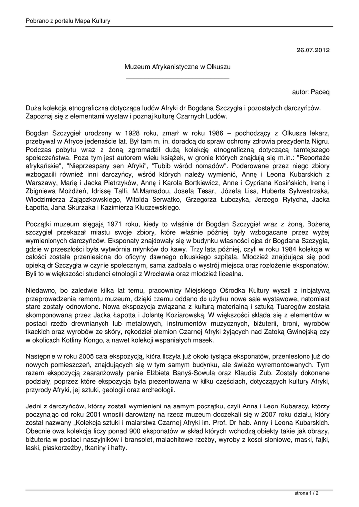 Pobrano z portalu Mapa Kultury 26.07.2012 Muzeum Afrykanistyczne w Olkuszu ____________________________ autor: Paceq Duża kolekcja etnograficzna dotycząca ludów Afryki dr Bogdana Szczygła i pozostałych darczyńców. Zapoznaj się z elementami wystaw i poznaj kulturę Czarnych Ludów. Bogdan Szczygieł urodzony w 1928 roku, zmarł w roku 1986 – pochodzący z Olkusza lekarz, przebywał w Afryce jedenaście lat. Był tam m. in. doradcą do spraw ochrony zdrowia prezydenta Nigru. Podczas pobytu wraz z żoną zgromadził dużą kolekcję etnograficzną dotyczącą tamtejszego społeczeństwa. Poza tym jest autorem wielu książek, w gronie których znajdują się m.in.: "Reportaże afrykańskie", "Nieprzespany sen Afryki", "Tubib wśród nomadów". Podarowane przez niego zbiory wzbogacili również inni darczyńcy, wśród których należy wymienić, Annę i Leona Kubarskich z Warszawy, Marię i Jacka Pietrzyków, Annę i Karola Bortkiewicz, Anne i Cypriana Kosińskich, Irenę i Zbigniewa Możdżeń, Idrissę Talfi, M.Mamadou, Josefa Tesar, Józefa Lisa, Huberta Sylwestrzaka, Włodzimierza Zajączkowskiego, Witolda Serwatko, Grzegorza Łubczyka, Jerzego Rytycha, Jacka Łapotta, Jana Skurzaka i Kazimierza Kluczewskiego. Początki muzeum sięgają 1971 roku, kiedy to właśnie dr Bogdan Szczygieł wraz z żoną, Bożeną szczygieł przekazał miastu swoje zbiory, które właśnie później były wzbogacane przez wyżej wymienionych darczyńców. Eksponaty znajdowały się w budynku własności ojca dr Bogdana Szczygła, gdzie w przeszłości była wytwórnia młynków do kawy. Trzy lata później, czyli w roku 1984 kolekcja w całości została przeniesiona do oficyny dawnego olkuskiego szpitala. Młodzież znajdująca się pod opieką dr Szczygła w czynie społecznym, sama zadbała o wystrój miejsca oraz rozłożenie eksponatów. Byli to w większości studenci etnologii z Wrocławia oraz młodzież licealna. Niedawno, bo zaledwie kilka lat temu, pracownicy Miejskiego Ośrodka Kultury wyszli z inicjatywą przeprowadzenia remontu muzeum, dzięki czemu oddano do użytku nowe sale wystawowe, natomiast stare zostały odnowione. Nowa ekspozycja związana z kulturą materialną i sztuką Tuaregów została skomponowana przez Jacka Łapotta i Jolantę Koziarowską. W większości składa się z elementów w postaci rzeźb drewnianych lub metalowych, instrumentów muzycznych, biżuterii, broni, wyrobów tkackich oraz wyrobów ze skóry, rękodzieł plemion Czarnej Afryki żyjących nad Zatoką Gwinejską czy w okolicach Kotliny Kongo, a nawet kolekcji wspaniałych masek. Następnie w roku 2005 cała ekspozycją, która liczyła już około tysiąca eksponatów, przeniesiono już do nowych pomieszczeń, znajdujących się w tym samym budynku, ale świeżo wyremontowanych. Tym razem ekspozycją zaaranżowały panie Elżbieta Banyś-Sowula oraz Klaudia Zub. Zostały dokonane podziały, poprzez które ekspozycja była prezentowana w kilku częściach, dotyczących kultury Afryki, przyrody Afryki, jej sztuki, geologii oraz archeologii. Jedni z darczyńców, którzy zostali wymienieni na samym początku, czyli Anna i Leon Kubarscy, którzy poczynając od roku 2001 wnosili darowizny na rzecz muzeum doczekali się w 2007 roku działu, który został nazwany „Kolekcja sztuki i malarstwa Czarnej Afryki im. Prof. Dr hab. Anny i Leona Kubarskich. Obecnie owa kolekcja liczy ponad 900 eksponatów w skład których wchodzą obiekty takie jak obrazy, biżuteria w postaci naszyjników i bransolet, malachitowe rzeźby, wyroby z kości słoniowe, maski, fajki, laski, płaskorzeźby, tkaniny i hafty. strona 1 / 2 Pobrano z portalu Mapa Kultury Obecnie zbiory przedstawione są w sześciu dużych salach. Kolejno, poczynając od pierwszej z nich, zapoznajemy się z kulturą Tuaregów; w drugiej możemy zapoznać się z życiem plemienia Dogonów; w trzeciej informacje, ciekawostki z Beninu oraz Wybrzeża Kości Słoniowej; w czwartej skamieniałości i maski z różnych stron Afryki oraz muszle morskie, w piątej mamy pokaźny zbiór fetyszy oraz naczyń ofiarnych; w sali ostatniej, czyli szóstej, możemy znaleźć właśnie zbiory wyżej wymienione czyli m.in. wyroby z kości słoniowej, drewna, malachitu i ciekawe oraz intrygujące malarstwo. KONKURS strona 2 / 2
