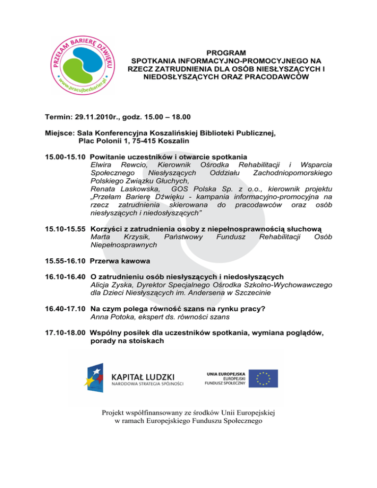 PROGRAM SPOTKANIA INFORMACYJNO-PROMOCYJNEGO NA RZECZ ZATRUDNIENIA DLA OSÓB NIESŁYSZĄCYCH I NIEDOSŁYSZĄCYCH ORAZ PRACODAWCÓW Termin: 29.11.2010r., godz. 15.00 – 18.00 Miejsce: Sala Konferencyjna Koszalińskiej Biblioteki Publicznej, Plac Polonii 1, 75-415 Koszalin 15.00-15.10 Powitanie uczestników i otwarcie spotkania Elwira Rewcio, Kierownik Ośrodka Rehabilitacji i Wsparcia Społecznego Niesłyszących Oddziału Zachodniopomorskiego Polskiego Związku Głuchych, Renata Laskowska, GOS Polska Sp. z o.o., kierownik projektu „Przełam Barierę Dźwięku - kampania informacyjno-promocyjna na rzecz zatrudnienia skierowana do pracodawców oraz osób niesłyszących i niedosłyszących” 15.10-15.55 Korzyści z zatrudnienia osoby z niepełnosprawnością słuchową Marta Krzysik, Państwowy Fundusz Rehabilitacji Osób Niepełnosprawnych 15.55-16.10 Przerwa kawowa 16.10-16.40 O zatrudnieniu osób niesłyszących i niedosłyszących Alicja Zyska, Dyrektor Specjalnego Ośrodka Szkolno-Wychowawczego dla Dzieci Niesłyszących im. Andersena w Szczecinie 16.40-17.10 Na czym polega równość szans na rynku pracy? Anna Potoka, ekspert ds. równości szans 17.10-18.00 Wspólny posiłek dla uczestników spotkania, wymiana poglądów, porady na stoiskach Projekt współfinansowany ze środków Unii Europejskiej w ramach Europejskiego Funduszu Społecznego