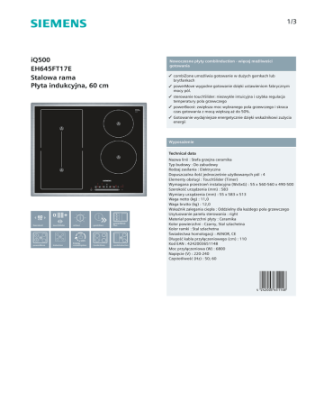1/3 iQ500 EH645FT17E Stalowa rama Płyta indukcyjna, 60 cm Nowoczesne płyty combiInduction - więcej możliwości gotowania ✓ combiZone umożliwia gotowanie w dużych garnkach lub brytfankach ✓ powerMove wygodne gotowanie dzięki ustawieniom fabrycznym mocy pól. ✓ sterowanie touchSlider: niezwykle intuicyjna i szybka regulacja temperatury pola grzewczego ✓ powerBoost: zwiększa moc wybranego pola grzewczego i skraca czas gotowania z mocą większą aż do 50%. ✓ Gotowanie wydajniejsze energetycznie dzięki wskaźnikowi zużycia energii Wyposażenie Technical data Nazwa linii : Stefa grzejna ceramika Typ budowy : Do zabudowy Rodzaj zasilania : Elektryczna Dopuszczalna ilość jednocześnie użytkowanych pól : 4 Elementy obsługi : TouchSlider (Timer) Wymagana przestrzeń instalacyjna (WxSxG) : 55 x 560-560 x 490-500 Szerokość urządzenia (mm) : 583 Wymiary urządzenia (mm) : 55 x 583 x 513 Waga netto (kg) : 11,0 Waga brutto (kg) : 12,0 Wskaźnik zalegania ciepła : Oddzielny dla każdego pola grzewczego Usytuowanie panelu sterowania : right Materiał powierzchni płyty : Ceramika Kolor powierzchni : Czarny, Stal szlachetna Kolor ramki : Stal szlachetna Świadectwa homologacji : AENOR, CE Długość kabla przyłączeniowego (cm) : 110 Kod EAN : 4242003651148 Moc przyłączeniowa (W) : 6800 Napięcie (V) : 220-240 Częstotliwość (Hz) : 50; 60 '!2E20AD-gfb ei! 2/3 iQ500 EH645FT17E Stalowa rama Płyta indukcyjna, 60 cm Wyposażenie Design ● Szkło ceramiczne, bez nadruku Komfort ● 4 Indukcyjne pola grzewcze ● combiZone ● 17 stopni mocy ● Timer z funkcją wyłączenia dla każdego pola ● Sygnał dźwiękowy końca pracy ● Funkcja powerMove ● Funkcja reStart ● Funkcja quickStart ● Wyświetlacz zużycia energii ● Dwustopniowy wskaźnik zalegania ciepła Bezpieczeństwo ● Elektroniczne rozpoznawanie obecności naczyń ● Zabezpieczenie przed uruchomieniem przez dzieci ● Czasowy wyłącznik bezpieczeństwa ● Funkcja shortClean ● Główny wyłącznik Wyposażenie klasy Premium: ● Sterowanie touchSlider Szybkość: ● Funkcja powerBoost dla wszystkich stref grzewczych Wymiary: ● Długość kabla (1,1 m ) ● Moc przyłączeniowa: 6,8 kW 3/3 iQ500 EH645FT17E Stalowa rama Płyta indukcyjna, 60 cm Rysunki wymiarowe