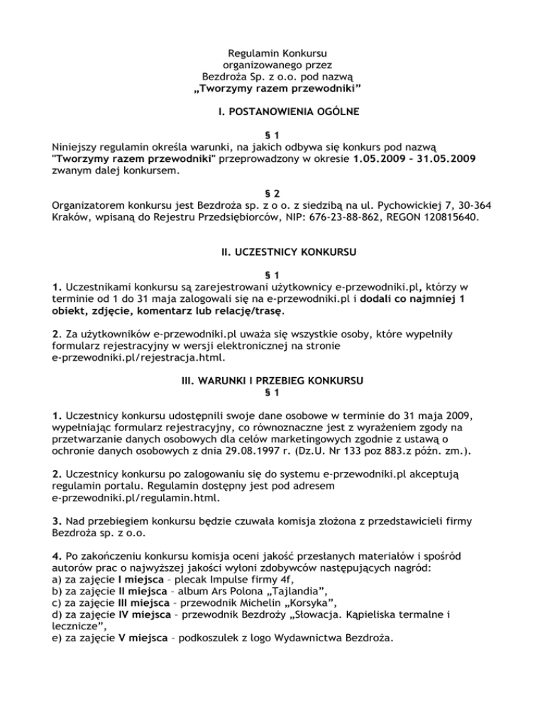 Regulamin Konkursu organizowanego przez Bezdroża Sp. z o.o. pod nazwą „Tworzymy razem przewodniki” I. POSTANOWIENIA OGÓLNE §1 Niniejszy regulamin określa warunki, na jakich odbywa się konkurs pod nazwą "Tworzymy razem przewodniki" przeprowadzony w okresie 1.05.2009 – 31.05.2009 zwanym dalej konkursem. §2 Organizatorem konkursu jest Bezdroża sp. z o o. z siedzibą na ul. Pychowickiej 7, 30-364 Kraków, wpisaną do Rejestru Przedsiębiorców, NIP: 676-23-88-862, REGON 120815640. II. UCZESTNICY KONKURSU §1 1. Uczestnikami konkursu są zarejestrowani użytkownicy e-przewodniki.pl, którzy w terminie od 1 do 31 maja zalogowali się na e-przewodniki.pl i dodali co najmniej 1 obiekt, zdjęcie, komentarz lub relację/trasę. 2. Za użytkowników e-przewodniki.pl uważa się wszystkie osoby, które wypełniły formularz rejestracyjny w wersji elektronicznej na stronie e-przewodniki.pl/rejestracja.html. III. WARUNKI I PRZEBIEG KONKURSU §1 1. Uczestnicy konkursu udostępnili swoje dane osobowe w terminie do 31 maja 2009, wypełniając formularz rejestracyjny, co równoznaczne jest z wyrażeniem zgody na przetwarzanie danych osobowych dla celów marketingowych zgodnie z ustawą o ochronie danych osobowych z dnia 29.08.1997 r. (Dz.U. Nr 133 poz 883.z późn. zm.). 2. Uczestnicy konkursu po zalogowaniu się do systemu e-przewodniki.pl akceptują regulamin portalu. Regulamin dostępny jest pod adresem e-przewodniki.pl/regulamin.html. 3. Nad przebiegiem konkursu będzie czuwała komisja złożona z przedstawicieli firmy Bezdroża sp. z o.o. 4. Po zakończeniu konkursu komisja oceni jakość przesłanych materiałów i spośród autorów prac o najwyższej jakości wyłoni zdobywców następujących nagród: a) za zajęcie I miejsca – plecak Impulse firmy 4f, b) za zajęcie II miejsca – album Ars Polona „Tajlandia”, c) za zajęcie III miejsca – przewodnik Michelin „Korsyka”, d) za zajęcie IV miejsca – przewodnik Bezdroży „Słowacja. Kąpieliska termalne i lecznicze”, e) za zajęcie V miejsca – podkoszulek z logo Wydawnictwa Bezdroża. 6. Nagrody zostaną dostarczone przesyłką kurierską i pocztową. IV. POSTANOWIENIA KOŃCOWE §1 1. Niniejszy regulamin jest jedynym dokumentem określającym zasady konkursu. 2. Uczestnik zobowiązany jest do zapoznania się z niniejszym Regulaminem przed przystąpieniem do konkursu. Uczestnik ponosi wyłączną odpowiedzialność za niezastosowanie się do postanowień niniejszego Regulaminu. 3. Pracownicy firmy Bezdroża sp. z o.o. oraz ich rodziny nie mogą brać udziału w konkursie. 4. Uczestnik poprzez fakt przystąpienia do konkursu akceptuje postanowienia niniejszego Regulaminu. 5. Niniejszy regulamin wchodzi w życie z dniem 1 maja 2009. 6. W przypadku braku akceptacji przez uczestnika konkursu stanowiska organizatorów, o którym mowa w niniejszym regulaminie, uczestnik może dochodzić swych praw na zasadach ogólnych. ORGANIZATOR Bezdroża Sp. z o.o.