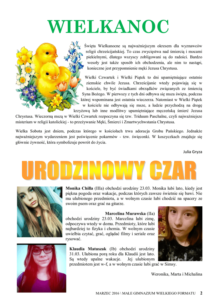 WIELKANOC Święta Wielkanocne są najważniejszym okresem dla wyznawców religii chrześcijańskiej. To czas zwycięstwa nad śmiercią i mocami piekielnymi, dlatego wszyscy zobligowani są do radości. Bardzo wesoły jest także sposób ich obchodzenia, ale nim to nastąpi, konieczne jest przypomnienie męki Jezusa Chrystusa. Wielki Czwartek i Wielki Piątek to dni upamiętniające ostatnie ziemskie chwile Jezusa. Chrześcijanie wtedy pojawiają się w kościele, by być świadkami obrządków związanych ze śmiercią Syna Bożego. W pierwszy z tych dni odbywa się msza święta, podczas której wspominana jest ostatnia wieczerza. Natomiast w Wielki Piątek w kościele nie odbywają się msze, a ludzie przychodzą na drogę krzyżową lub inne modlitwy upamiętniające męczeńską śmierć Jezusa Chrystusa. Wieczorną mszą w Wielki Czwartek rozpoczyna się tzw. Triduum Paschalne, czyli najważniejsze misterium w religii katolickiej - to przeżywanie Męki, Śmierci i Zmartwychwstania Chrystusa. Wielka Sobota jest dniem, podczas którego w kościołach trwa adoracja Grobu Pańskiego. Jednakże najważniejszym wydarzeniem jest poświęcenie pokarmów - tzw. święconki. W koszyczkach znajduje się głównie żywność, która symbolizuje powrót do życia. Julia Gryza Monika Chilla (IIIa) obchodzi urodziny 23.03. Monika lubi lato, kiedy jest piękna pogoda oraz wakacje, podczas których zawsze świetnie się bawi. Nie ma ulubionego przedmiotu, a w wolnym czasie lubi chodzić na spacery ze swoim psem oraz grać na gitarze. Marcelina Murawska (IIa) obchodzi urodziny 23.03. Marcelina lubi zimę, odpoczywa wtedy w domu. Przedmioty, które lubi najbardziej to fizyka i chemia. W wolnym czasie uwielbia czytać, grać, oglądać filmy i seriale oraz rysować. Klaudia Matuszak (Ib) obchodzi urodziny 31.03. Ulubiona porą roku dla Klaudii jest lato. Są wtedy upalne wakacje. Jej ulubionym przedmiotem jest w-f, a w wolnym czasie lubi grać w Simsy. Weronika, Marta i Michalina MARZEC 2016 \ MAŁE GIMNAZJUM WIELKIEGO FORMATU 2