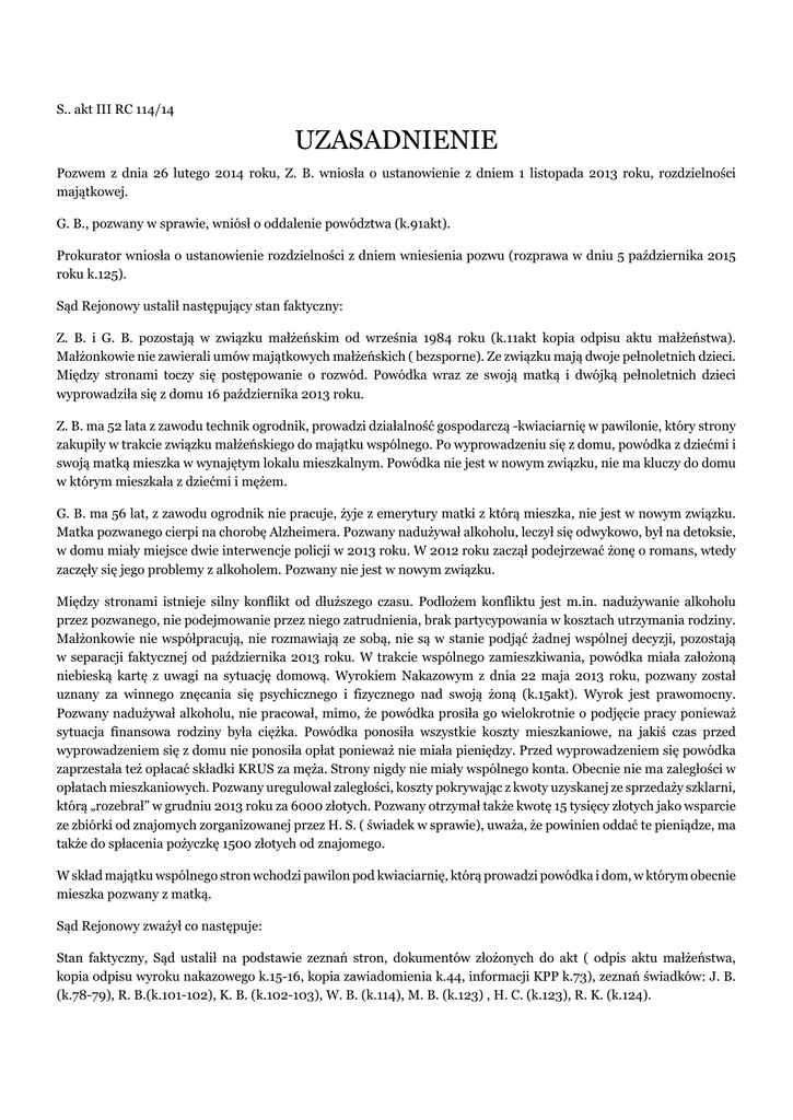 S.. akt III RC 114/14 UZASADNIENIE Pozwem z dnia 26 lutego 2014 roku, Z. B. wniosła o ustanowienie z dniem 1 listopada 2013 roku, rozdzielności majątkowej. G. B., pozwany w sprawie, wniósł o oddalenie powództwa (k.91akt). Prokurator wniosła o ustanowienie rozdzielności z dniem wniesienia pozwu (rozprawa w dniu 5 października 2015 roku k.125). Sąd Rejonowy ustalił następujący stan faktyczny: Z. B. i G. B. pozostają w związku małżeńskim od września 1984 roku (k.11akt kopia odpisu aktu małżeństwa). Małżonkowie nie zawierali umów majątkowych małżeńskich ( bezsporne). Ze związku mają dwoje pełnoletnich dzieci. Między stronami toczy się postępowanie o rozwód. Powódka wraz ze swoją matką i dwójką pełnoletnich dzieci wyprowadziła się z domu 16 października 2013 roku. Z. B. ma 52 lata z zawodu technik ogrodnik, prowadzi działalność gospodarczą -kwiaciarnię w pawilonie, który strony zakupiły w trakcie związku małżeńskiego do majątku wspólnego. Po wyprowadzeniu się z domu, powódka z dziećmi i swoją matką mieszka w wynajętym lokalu mieszkalnym. Powódka nie jest w nowym związku, nie ma kluczy do domu w którym mieszkała z dziećmi i mężem. G. B. ma 56 lat, z zawodu ogrodnik nie pracuje, żyje z emerytury matki z którą mieszka, nie jest w nowym związku. Matka pozwanego cierpi na chorobę Alzheimera. Pozwany nadużywał alkoholu, leczył się odwykowo, był na detoksie, w domu miały miejsce dwie interwencje policji w 2013 roku. W 2012 roku zaczął podejrzewać żonę o romans, wtedy zaczęły się jego problemy z alkoholem. Pozwany nie jest w nowym związku. Między stronami istnieje silny konflikt od dłuższego czasu. Podłożem konfliktu jest m.in. nadużywanie alkoholu przez pozwanego, nie podejmowanie przez niego zatrudnienia, brak partycypowania w kosztach utrzymania rodziny. Małżonkowie nie współpracują, nie rozmawiają ze sobą, nie są w stanie podjąć żadnej wspólnej decyzji, pozostają w separacji faktycznej od października 2013 roku. W trakcie wspólnego zamieszkiwania, powódka miała założoną niebieską kartę z uwagi na sytuację domową. Wyrokiem Nakazowym z dnia 22 maja 2013 roku, pozwany został uznany za winnego znęcania się psychicznego i fizycznego nad swoją żoną (k.15akt). Wyrok jest prawomocny. Pozwany nadużywał alkoholu, nie pracował, mimo, że powódka prosiła go wielokrotnie o podjęcie pracy ponieważ sytuacja finansowa rodziny była ciężka. Powódka ponosiła wszystkie koszty mieszkaniowe, na jakiś czas przed wyprowadzeniem się z domu nie ponosiła opłat ponieważ nie miała pieniędzy. Przed wyprowadzeniem się powódka zaprzestała też opłacać składki KRUS za męża. Strony nigdy nie miały wspólnego konta. Obecnie nie ma zaległości w opłatach mieszkaniowych. Pozwany uregulował zaległości, koszty pokrywając z kwoty uzyskanej ze sprzedaży szklarni, którą „rozebrał” w grudniu 2013 roku za 6000 złotych. Pozwany otrzymał także kwotę 15 tysięcy złotych jako wsparcie ze zbiórki od znajomych zorganizowanej przez H. S. ( świadek w sprawie), uważa, że powinien oddać te pieniądze, ma także do spłacenia pożyczkę 1500 złotych od znajomego. W skład majątku wspólnego stron wchodzi pawilon pod kwiaciarnię, którą prowadzi powódka i dom, w którym obecnie mieszka pozwany z matką. Sąd Rejonowy zważył co następuje: Stan faktyczny, Sąd ustalił na podstawie zeznań stron, dokumentów złożonych do akt ( odpis aktu małżeństwa, kopia odpisu wyroku nakazowego k.15-16, kopia zawiadomienia k.44, informacji KPP k.73), zeznań świadków: J. B. (k.78-79), R. B.(k.101-102), K. B. (k.102-103), W. B. (k.114), M. B. (k.123) , H. C. (k.123), R. K. (k.124). Zeznania w/w świadków potwierdziły stan separacji małżonków, silny konflikt pomiędzy nimi, także fakt nadużywania alkoholu przez pozwanego i w tym zakresie zasługują na wiarę są zbieżne również z zeznaniami stron. Zeznania świadków J. B. ( matki powódki) i R. B. ( syna stron) i K. B. ( córki stron) potwierdziły także separację stron, nadużywanie alkoholu przez pozwanego, awantury w domu na tym tle. Zeznania wymienionych świadków są spójne, nie budzą wątpliwości. Wymienieni świadkowie jako osoby najbliższe dla stron, mieszkające z nimi są zorientowane w sytuacji panującej w rodzinie. Zeznania te nie budzą wątpliwości, znajdują potwierdzenie w pozostałym materiale dowodowym także w zeznaniach stron. Powództwo zasługuje na uwzględnienie co do zasady. Art. 52 § 1 krio. stanowi, że z ważnych powodów każdy z małżonków może żądać ustanowienia przez sąd rozdzielności majątkowej. Ten przymusowy ustrój majątkowy stanowi wyjątek od ogólnej zasady jaką jest ustawowa wspólność majątkowa osób pozostających w związku małżeńskim. W judykaturze Sądu Najwyższego wskazano, że „ważne powody” to sytuacja pociągająca za sobą naruszenie lub poważne zagrożenie interesu majątkowego jednego z małżonków i z reguły także dobra rodziny oraz wynikająca z nieporozumień małżeńskich utrata zdolności do wykonywania zarządu majątkiem wspólnym [por. wyrok Sądu Najwyższego z dnia 31 stycznia 2003 roku, sygn. IV CKN 1710/00, LexPolonica nr 377918; wyrok Sądu Najwyższego z dnia 7 grudnia 2000 roku, sygn. II CKN 401/00, LexPolonica nr 2440302]. Jednym z ważnych powodów uzasadniających ustanowienie rozdzielności majątkowej może być okoliczność, że małżonkowie żyją w rozłączeniu (separacja faktyczna), o ile stan ten cechuje się brakiem możliwości współdziałania w zarządzie majątkiem wspólnym [wyrok Sądu Najwyższego z dnia 13 maja 1997 roku, sygn. III CKN 51/97, OSN 1997, nr 12, poz. 194; wyrok Sądu Najwyższego z dnia 4 czerwca 2000 roku, sygn. III CK 126/03, M. Praw. 2004, nr 13, s. 582, wyrok Sądu Najwyższego z dnia 14 stycznia 2005 roku, sygn. III CK 112/04, LEX nr 602707]. Przenosząc powyższe rozważan