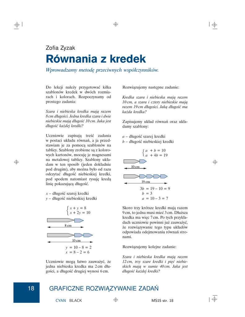 Zofia Zyzak Równania z kredek Wprowadzamy metodę przeciwnych współczynników. Do lekcji należy przygotować kilka szablonów kredek w dwóch rozmiarach i kolorach. Rozpoczynamy od prostego zadania: Szara i niebieska kredka mają razem 8 cm długości. Jedna kredka szara i dwie niebieskie mają długość 10 cm. Jaka jest długość każdej kredki? Uczniowie zapisują treść zadania w postaci układu równań, a ja przedstawiam je za pomocą szablonów na tablicy. Szablony zrobione są z kolorowych kartonów, mocuję je magnesami na metalowej tablicy. Szablony układam w ten sposób (jeden dokładnie pod drugim), aby można było od razu odczytać długość niebieskiej kredki, pod spodem natomiast rysuję kredą linię pokazującą długość. x – długość szarej kredki y – długość niebieskiej kredki x+y=8 x + 2y = 10 y = 10 − 8 = 2 x =8−2=6 Uczniowie mogą łatwo zauważyć, że jedna niebieska kredka ma 2 cm długości, a długość drugiej wynosi 6 cm. 18 Rozwiązujemy następne zadanie: Kredka szara i niebieska mają razem 10 cm, a szara i cztery niebieskie mają razem 19 cm długości. Jaką długość ma każda kredka? Zapisujemy układ równań oraz układamy szablony: a – długość szarej kredki b – długość niebieskiej kredki a + b = 10 a + 4b = 19 3b = 19 − 10 = 9 b =3 a = 10 − 3 = 7 Skoro trzy krótsze kredki mają razem 9 cm, to jedna musi mieć 3 cm. Dłuższa kredka ma więc 7 cm. Po tych przykładach uczniowie powinni już zauważyć, że rozwiązywanie tego typu układów odpowiada odejmowaniu równań stronami. Rozwiązujemy kolejne zadanie: Szara i niebieska kredka mają razem 12 cm, trzy szare kredki i pięć niebieskich mają w sumie 40 cm. Jaka jest długość każdej kredki? GRAFICZNE ROZWIĄZYWANIE ZADAŃ CYAN BLACK MS15 str. 18 Zapisujemy układ równań i układamy szablony. s – długość szarej kredki n – długość niebieskiej kredki s + n = 12 3s + 5n = 40 Rozwiążmy teraz takie zadanie: Kredka szara i trzy kredki niebieskie mają 13 cm długości. Kredka szara jest o 5 cm dłuższa od niebieskiej. Jaka jest długość każdej kredki? d – długość szarej kredki k – długość niebieskiej kredki d + 3k = 13 d−k = 5 3k + k = 8 Uczniowie podają („burza mózgów”) sposoby postępowania. Wspólnie ustalamy, że należy pierwsze równanie doprowadzić do takiej postaci, aby można było układ rozwiązać podobnie, jak dwa pierwsze. Osiągamy to, mnożąc je stronami przez 3, co odpowiada na rysunku zestawieniu trzech kompletów (komplet to kredka szara i kredka niebieska). 3s + 3n = 36 3s + 5n = 40 2n = 4 n =2 s = 10 Uczniowie teraz już łatwo zauważą, że dwie małe niebieskie kredki mają długość 4 cm, czyli jedna ma 2 cm (szara ma 10 cm). Teraz formułujemy zasadę postępowania w takich przypadkach – mnożymy obie strony jednego równania tak, aby w obu równaniach przy tej samej niewiadomej były te same współczynniki (ta sama liczba kredek). W miarę potrzeb i czasu można rozwiązać kilka takich prostych układów ułożonych przez uczniów. 4k = 8 k =2 Zauważamy, że skoro cztery niebieskie kredki mają długość 8 cm, to jedna ma długość 2 cm. Szara ma więc 7 cm. Pokazujemy teraz uczniom, że odejmowanie stronami [3k − (−k) = 3k+ +k = 4k], gdy współczynniki są ujemne, może być uciążliwe. Dlatego aby ułatwić sobie obliczenia, dążymy do sytuacji, w której przy jednej niewiadomej byłyby przeciwne współczynniki, wtedy odejmowanie stronami zastępujemy dodawaniem. Uczniowie na lekcji prowadzonej w ten sposób sami formułują zasady postępowania obowiązujące przy stosowaniu metody przeciwnych współczynników, rozumieją, skąd się taka metoda wzięła, uczą się wnioskowania oraz uogólniania. Nawet słabsi z nich potrafią sobie poradzić z rozwiązywaniem prostych układów równań za pomocą rysunków. GRAFICZNE ROZWIĄZYWANIE ZADAŃ CYAN BLACK MS15 str. 19 19