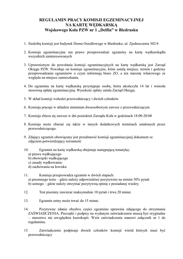 REGULAMIN PRACY KOMISJI EGZEMINACYJNEJ NA KARTĘ WĘDKARSKĄ Wojskowego Koła PZW nr 1 „Delfin” w Biedrusku 1. Siedzibą komisji jest budynek Domu Osiedlowego w Biedrusko, ul. Zjednoczenia 302/4 2. Komisja egzaminacyjna ma prawo przeprowadzać egzaminy na kartę wędkarskądla wszystkich zainteresowanych 3. Uprawnionym do powołania komisji egzaminacyjnych na kartę wędkarską jest Zarząd Okręgu PZW. Powołuje on komisje egzaminacyjne, które ustalą miejsce, termin i godziny przeprowadzania egzaminów o czym informują biuro ZO, a ten starostę właściwego ze względu na miejsce zamieszkania. 4. Do egzaminu na kartę wędkarską przystępuje osoba, która ukończyła 14 lat i wniosła stosowną opłatę egzaminacyjną. Wysokość opłaty ustala Zarząd Okręgu. 5. W skład komisji wchodzi przewodniczący i dwóch członków 6. Komisja pracuje w składzie minimum dwuosobowym zawsze z przewodniczącym 7. Komisja zbiera się zawsze w dni posiedzeń Zarządu Koła w godzinach 18:00-20:00 8. Komisja może zbierać się także w innych dodatkowych terminach ustalonych przez przewodniczącego. 9. Zdający egzamin obowiązany jest przedstawić komisji egzaminacyjnej dokument ze zdjęciem potwierdzający tożsamość 10. Egzamin na kartę wędkarską obejmuje następującą tematykę: a) prawa wędkującego b) obowiązki wędkującego c) zasady wędkowania: d) zachowania na łowisku 11. Komisja przeprowadza egzamin w dwóch etapach: a) pisemnego testu – gdzie należy odpowiedzieć pozytywnie na minim 50% pytań b) ustnego – gdzie należy otrzymać pozytywną opinię z posiadanej wiedzy. 12. Test pisemny zawierać maksymalnie 10 pytań i trwa 20 minut. 13. Egzamin ustny może trwać do 15 minut. 14. Pozytywne zdanie obydwu części egzaminu uprawnia zdającego do otrzymania ZAŚWIADCZENIA. Pieczątki i podpisy na wydanym zaświadczeniu muszą być oryginalne – starostwo nie uwzględnia kserokopii. Wzór zaświadczenia stanowi załącznik nr 1 do regulaminu. 15. Zaświadczenie podpisuje dwóch członków komisji wśród których musi być przewodniczący 16. Z przeprowadzanych egzaminów przewodniczący zobowiązany jest sporządzić protokół. 17. Protokół powinien zawierać: a) liczbę porządkową wpisu. b) nazwisko i imię zdającego, c) datę i miejsce urodzenia, oraz adres zamieszkania zdającego. d) wynik egzaminu i datę jego przeprowadzenia. e) podpisy członków komisji biorących udział w egzaminie. 18. Komisja egzaminacyjna prowadzi rejestr wydanych zaświadczeń. Zaświadczeniu nadaje się sygnaturę zawierającą numer komisji egzaminacyjnej, kolejny numer w rejestrze egzaminacyjnym i datę wydania. Zaświadczenie umożliwia ubieganie się o wydanie przez starostwo powiatowe właściwe ze względu na miejsce zamieszkania osoby ubiegającej się o kartę wędkarską. 19. Dokumenty niezbędne do wydania Karty Wędkarskiej: - wniosek o wydanie karty - 1 fotografia - oryginał Zaświadczenia o zdanym egzaminie na kartę wędkarską - dowód uiszczenia opłaty 20. Informacje na temat egzaminów zamieszcza się na stronie www.delfin-biedrusko.pl PRZYPISY: Egzamin obejmuje znajomość Regulaminu Amatorskiego Połowu Ryb PZW (RAPR) zawierającego reguły określone w Rozporządzeniu Ministra Rolnictwa i Rozwoju Wsi z dn. 12 listopada 2001r. w sprawie połowu ryb oraz warunków chowu, hodowli i połowu innych organizmów żyjących w wodzie. Aby łowić na polskich wodach, konieczna jest karta wędkarska. Jest to dokument ważny dożywotnio, wydawany dorosłym i młodzieży od lat 14 przez właściwe dla miejsca zamieszkania starostwo powiatowe. Aby go otrzymać, należy zdać egzamin z przepisów dotyczących wędkowania. Po zdanym egzaminie kartę odbiera się w wydziale ochrony środowiska właściwego starostwa powiatowego; adres: STAROSTWO POWIATOWE W POZNANIU, UL. JACKOWSKIEGO 18, WYDZIAŁ OCHRONY ŚRODOWISKA, ROLNICTWA I LEŚNICTWA, REFERAT DS. GOSPODARKI WODNEJ I OCHRONY POWIETRZA ( II pietro, pokój 207 ) Z obowiązku posiadania karty są zwolnione osoby, które nie ukończyły 14 lat, z tym, że mogą one łowić wyłącznie pod opieką osoby pełnoletniej, która taką kartę posiada, cudzoziemcy czasowo przebywający w Polsce (jeżeli wykupili licencję na wędkowanie) oraz osoby wędkujące w wodach należących do osoby fizycznej uprawnionej do rybactwa, o ile uzyskały od niej zezwolenie na połów ryb