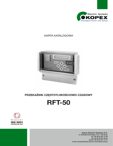 tel. (032) 327-14-58; tel./fax (032) 327-00-32 e-mail: [email protected] ZEG-ENERGETYKA Sp. z o. o. 43-100 Tychy, ul. Biskupa Burschego 7 tel. (032) 327-14-58; tel./fax (032) 327-00-32 e-mail: [email protected] DOKUMENTACJA TECHNICZNO-RUCHOWA KARTA KATALOGOWA KARTA KATALOGOWA Zespó Sygnalizacji Zakóceniowej PRZEKAŹNIK CZĘSTOTLIWOŚCIOWO-CZASOWY Z SRFT-50 Z - 30 RFT-50 Przekanik czstotliwociowo-czasowy ZEG-E ZEG-E EE 428072.02 Kopex Electric Systems S.A. ul. Biskupa Burschego 3, 43 - 100 Tychy tel.: 00R419246 48 32 327 14 58 fax: 00 48 32 327 00 32 serwis: 00 48 32 327 14 57 e-mail: [email protected], www.kessa.com.pl RFT-50 Karta katalogowa RFT-50 ź ęś ęś ąż ł ź ę ą ł ą ą ż ł ęś ł ł ę ł ę ł ź ż ł ł ł ś ż ł łą ł łą ę ę ęść ę ę ę łść ę ę ść ł ę ść ę ń ś ź łą ąż ą ł ą φ 2 RFT-50 Karta katalogowa RFT-50 łą ąż ą ł ą ł ę ę ł ęś ł łś ł ł ż ęś ł ł łś ł ę ź ź ł ź ź ł ź ż ć łą ę ą ę ę ź ęś ę ź ęś ę ć oraz zamówienia należy kierować do działu marketingu: Prośby o szczegółowe informacje Burschego Kopex Electric Systems S.A. ul. Biskupa 3, 43 - 100 Tychy, tel.: 00 48 32 327 14 58, fax: 00 48 32 327 00 32 serwis: 00 48 32 327 14 57, e-mail: [email protected], www.kessa.com.pl łą ź 3 RFT-50 łą ź Karta katalogowa RFT-50 ą ź ź 4 RFT-50 ź Karta katalogowa RFT-50 ę ś łą ęą ż ź ż ć ł ż łą 5 Zakład Chorzów ul. Opolska 19 41- 500 Chorzów Zakład Tychy ul. Biskupa Burschego 3 43 - 100 Tychy www.kessa.com.pl e-mail: [email protected] Kopex Electric Systems S.A. ul. Biskupa Burschego 3, 43 - 100 Tychy tel.: 00 48 32 327 14 58 fax: 00 48 32 327 00 32 serwis: 00 48 32 327 14 57