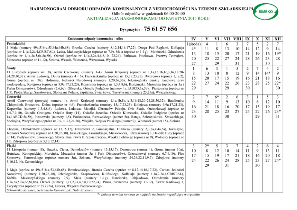 HARMONOGRAM ODBIORU ODPADÓW KOMUNALNYCH Z NIERUCHOMOŚCI NA TERENIE SZKLARSKIEJ PORĘBY Odbiór odpadów w godzinach 06:00-20:00 AKTUALIZACJA HARMONOGRAMU OD KWIETNIA 2015 ROKU Dyspozytor – 75 61 57 656 Zmieszane odpady komunalne - ulice Poniedziałki 1 Maja (numery 49a,51b-c,53,64a,64b,68), Bronka Czecha (numery 8,12,14,16,17,22), Droga Pod Reglami, Kołłątaja (oprócz nr 1,1a,2,2a,4,CRISTAL), Leśna, Makuszyńskiego (oprócz nr 7,9), Mała (oprócz nr 1-1g), Moniuszki, Odrodzenia (oprócz nr 1,1a,3a,5,6a,8a,8b), Okrzei (oprócz nr 1,1a,2,2a,4,6,8,10, 22,24), Parkowa, Potokowa, Przerwy-Tetmajera, Słoneczna (oprócz nr 11-12), Stroma, Wesoła, Wiosenna, Wrzosowa, Wysoka IV 1(środa) 4* 13 20 27 1 8 15 22 29 Środy 11 Listopada (oprócz nr 18), Armii Czerwonej (numery 1-4), Armii Krajowej (oprócz nr 1,1a,1b,1b,1c,3,16,18,2024,28,30,32), Armii Ludowej, Dolna (numery 4 i 6), Franciszkańska (oprócz nr 15,17,23,25), Dworcowa (oprócz 1,1a,2), Górna (oprócz nr 10a), Hofmana, Jedności Narodowej (numery 1,20,26,30), Jeleniogórska punkty handlowe przy wodospadzie, Kolejowa (oprócz nr 9,9a,17,21,23), Kopernika (oprócz nr 1,3,4,8,6), Kościuszki, Muzealna (oprócz nr 3a i Parku Dinozaurów), Odrodzenia (2,6,6c), Oficerska, Osiedle Podgórze (numery 1a,1ABCD,5a,5b), Piastowska (oprócz nr 1,5), Piotra Skargi, Sanatoryjna, Słoneczna Polana, Szpitalna, Świerkowa, Turystyczna (numery 25,25a), Wyszyńskiego Czwartki 2 Armii Czerwonej (powyżej numeru 4), Armii Krajowej (numery 1,1a,1b,1b,1c,3,16,18,20-24,28,30,32), Batalionów 9 Chłopskich, Brzozowa, Dolna (oprócz nr 4,6), Franciszkańska (numery 15,17,23,25), Kolejowa (numery 9,9a,17,21,23), 16 Kopernika (numery 1,3,4,8,6), Ludowa, Łukowa, Matejki, Obrońców Pokoju, Orla Skała, Orzeszkowej (oprócz nr 23 1,6,7,9,10), Osiedle Grottgera, Osiedle Huty (14), Osiedle Janosika, Osiedle Klimczoka, Osiedle Podgórze (oprócz nr 30 1a,1ABCD,5a,5b), Piastowska (numery 1,5), Podsudecka, Pstrowskiego (numer 5a), Rataja, Schroniskowa, Słowackiego, Spokojna, Waryńskiego (oprócz nr 7,9,11,22,24,26), Wiejska, Wojska Polskiego (numer 9), Wolności (numer 15), Zielona ----------------------------------------------------------------------------------------------------------------------------Chopina, Demokratów (oprócz nr 13,15,17), Dworcowa 2, Gimnazjalna, Hutnicza (numery 2,3,3a,4,4a,5a), Jakuszyce, Jedności Narodowej (oprócz nr 1,20,26,30), Krasickiego, Krasińskiego, Mickiewicza, Orzeszkowej 1, Osiedle Huty (oprócz nr 14), Partyzantów, Sikorskiego, Skwer Jana Pawła II, Szosa Czeska, Wojska Polskiego (oprócz nr 9), Wolności (oprócz nr 15), Zdrojowa (oprócz nr 5,10,12,14) Piątki 3 11 Listopada (numer 18), Buczka, Cicha, Demokratów (numery 13,15,17), Dworcowa (numer 1), Górna (numer 10a), 10 Hutnicza, Konopnickiej, Morcinka, Muzealna (numer 3a i Park Dinozaurów), Orzeszkowej (numery 6,7,9,10), Plac 17 Sportowy, Pstrowskiego (oprócz numeru 5a), Szklana, Waryńskiego (numery 24,26,22,11,9,7), Zdrojowa (numery 24 5,10,12,14), Żeromskiego ----------------------------------------------------------------------------------------------------------------------------1 Maja (oprócz nr 49a,51b-c,53,64b,68), Broniewskiego, Bronka Czecha (oprócz nr 8,12,14,16,17,22), Caritas, Jedności Narodowej (numery 1,20,26,30), Jeleniogórska, Kasprowicza, Kilińskiego, Kołłątaja (numery 1,1a,2,2a,4,CRISTAL), Krótka, Makuszyńskiego (numery 7,9), Mała (numery 1-1g), Narciarska, Objazdowa, Odrodzenia (numery 1,1a,3a,5,6a,6c,8a,8b), Okrzei (numery 1,1a,2,2a,4,6,8,10,22,24), Prusa, Słoneczna (numery 11-12), Skwer Radiowej 3, Turystyczna (oprócz nr 25 i 25a), Urocza, Wzgórze Paderewskiego Schronisko Szrenica, Schronisko Kamieńczyk, Hala Szrenica *- zmiana terminu wywozu ze względu na święto wypadające w tygodniu V 4 11 18 25 VII VIII IX 6 3 7 13 10 14 20 17 21 27 24 28 31 1 5 2 8 12 9 15 19 16 22 26 23 29 30 X 5 12 19 26 6 13 20 27 VI 1 8 15 22 29 3 10 17 24 7 14 21 28 6* 11 18 25 2 9 16 23 30 6 13 20 27 3 10 17 24 1 8 15 22 29 5 12 19 26 3 10 17 23* 31 2* 8 15 22 29 5 12 19 26 3 10 17 24 31 7 14 21 28 4 11 18 25 2 9 16 23 30 6 13 20 27 4 11 18 24* 7 14 21 28 XI XII 2 7 9 14 16 19* 23 28 30 4 2 14* 9 18 16 25 22* 30 HARMONOGRAM ODBIORU ODPADÓW SEGREGOWANYCH Z NIERUCHOMOŚCI NA TERENIE SZKLARSKIEJ PORĘBY Odbiór odpadów w godzinach 06:00-20:00 AKTUALIZACJA HARMONOGRAMU OD KWIETNIA 2015 ROKU Dyspozytor – 75 61 57 656 Ulica Segregacja - bioodpady 1 Maja, Broniewskiego, Bronka Czecha, Caritas, Chopina, Droga pod Reglami, Gimnazjalna, Jakuszyce, Jedności Narodowej, Jeleniogórska, Kasprowicza, Kilińskiego, Kołłątaja, Krasińskiego, Krótka, Leśna, Makuszyńskiego, Mała, Mickiewicza, Moniuszki, Narciarska, Objazdowa, Odrodzenia, Okrzei, Parkowa, Potokowa, Prusa, Przerwy-Tetmajera, Sikorskiego, Słoneczna, Stroma, Szosa Czeska, Urocza, Wesoła, Wiosenna, Wrzosowa, Wysoka, Wzgórze Paderewskiego Segregacja - bioodpady 11 listopada, Armii Czerwonej, Armii Krajowej, Armii Ludowej, Batalionów Chłopskich, Brzozowa, Buczka, Cicha, Demokratów, Dolna, Dworcowa, Franciszkańska, Górna, Hofmana, Hutnicza, Kolejowa, Konopnickiej, Kopernika, Kościuszki, Krasickiego, Ludowa, Łukowa, Matejki, Morcinka, Muzealna, Obrońców Pokoju, Oficerska, Orla Skała, Orzeszkowej, Osiedle Grottgera, Osiedle Huty, Osiedle Janosika, Osiedle Klimczoka, Osiedle Podgórze, Partyzantów, Piastowska, Plac Sportowy, Podsudecka, Pstrowskiego, Rataja, Sanatoryjna, Schroniskowa, Szklana, Piotra Skargi, Słoneczna Polana, Słowackiego, Spokojna, Szpitalna, Świerkowa, Turystyczna, Waryńskiego, Wiejska, Wojska Polskiego, Wolności, Wyszyńskiego, Zdrojowa, Zielona, Żeromskiego Segregacja – Szkło 1 Maja, Broniewskiego, Bronka Czecha, Caritas, Chopina, Droga pod Reglami, Gimnazjalna, Jakuszyce, Jedności Narodowej, Jeleniogórska, Kasprowicza, Kilińskiego, Kołłątaja, Krasińskiego, Krótka, Leśna, Makuszyńskiego, Mała, Mickiewicza, Moniuszki, Narciarska, Objazdowa