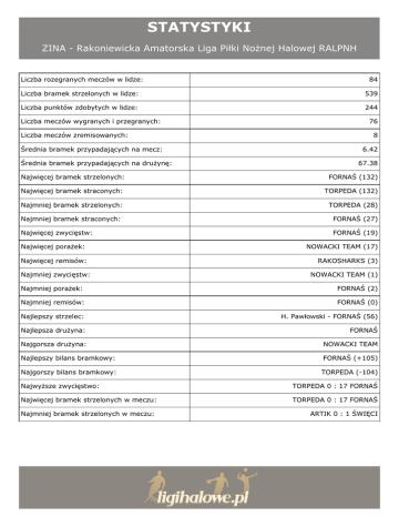 STATYSTYKI ZINA - Rakoniewicka Amatorska Liga Piłki Nożnej Halowej RALPNH Liczba rozegranych meczów w lidze: 84 Liczba bramek strzelonych w lidze: 539 Liczba punktów zdobytych w lidze: 244 Liczba meczów wygranych i przegranych: Liczba meczów zremisowanych: Średnia bramek przypadających na mecz: Średnia bramek przypadających na drużynę: 76 8 6.42 67.38 Najwięcej bramek strzelonych: FORNAŚ (132) Najwięcej bramek straconych: TORPEDA (132) Najmniej bramek strzelonych: TORPEDA (28) Najmniej bramek straconych: FORNAŚ (27) Najwięcej zwycięstw: FORNAŚ (19) Najwięcej porażek: NOWACKI TEAM (17) Najwięcej remisów: RAKOSHARKS (3) Najmniej zwycięstw: NOWACKI TEAM (1) Najmniej porażek: FORNAŚ (2) Najmniej remisów: FORNAŚ (0) Najlepszy strzelec: H. Pawłowski - FORNAŚ (56) Najlepsza drużyna: FORNAŚ Najgorsza drużyna: NOWACKI TEAM Najlepszy bilans bramkowy: FORNAŚ (+105) Najgorszy bilans bramkowy: TORPEDA (-104) Najwyższe zwycięstwo: TORPEDA 0 : 17 FORNAŚ Najwięcej bramek strzelonych w meczu: TORPEDA 0 : 17 FORNAŚ Najmniej bramek strzelonych w meczu: ARTIK 0 : 1 ŚWIĘCI