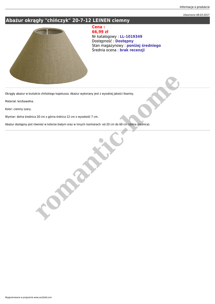 Informacje o produkcie Utworzono 08-03-2017 Abażur okrągły "chińczyk" 20-7-12 LEINEN ciemny Cena : 66,99 zł m Okrągły abażur w kształcie chińskiego kapelusza. Abażur wykonany jest z wysokiej jakości tkaniny. e Nr katalogowy : LL-1019349 Dostępność : Dostępny Stan magazynowy : poniżej średniego Średnia ocena : brak recenzji Kolor: ciemny szary. Wymiar: dolna średnica 20 cm x górna śrdnica 12 cm x wysokość 7 cm. ho Materiał: len/bawełna. ro m an ti c- Abażur dostępny jest również w kolorze białym oraz w innych rozmiarach: od 20 cm do 60 cm (dolna średnica). Wygenerowano w programie www.oscGold.com