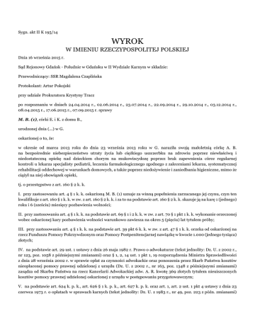 Sygn. akt II K 195/14 WYROK W IMIENIU RZECZYPOSPOLITEJ POLSKIEJ Dnia 16 września 2015 r. Sąd Rejonowy Gdańsk - Południe w Gdańsku w II Wydziale Karnym w składzie: Przewodniczący: SSR Magdalena Czaplińska Protokolant: Artur Pokojski przy udziale Prokuratora Krystyny Tracz po rozpoznaniu w dniach 24.04.2014 r., 02.06.2014 r., 23.07.2014 r., 22.09.2014 r., 29.10.2014 r., 03.12.2014 r., 08.04.2015 r., 17.06.2015 r., 07.09.2015 r. sprawy M. B. (1), córki E. i K. z domu B., urodzonej dnia (...) w G. oskarżonej o to, że: w okresie od marca 2013 roku do dnia 23 września 2013 roku w G. naraziła swoją małoletnią córkę A. B. na bezpośrednie niebezpieczeństwo utraty życia lub ciężkiego uszczerbku na zdrowiu poprzez niewłaściwą i niedostateczną opiekę nad dzieckiem chorym na mukowiscydozę poprzez brak zapewnienia córce regularnej kontroli u lekarza specjalisty pediatrii, leczenia farmakologicznego zgodnego z zaleceniami lekarza, systematycznej rehabilitacji oddechowej w warunkach domowych, a także poprzez niedożywienie i zaniedbania higieniczne, mimo że ciążył na niej obowiązek opieki, tj. o przestępstwo z art. 160 § 2 k. k. I. przy zastosowaniu art. 4 § 1 k. k. oskarżoną M. B. (1) uznaje za winną popełnienia zarzucanego jej czynu, czyn ten kwalifikuje z art. 160 § 1 k. k. w zw. z art. 160 § 2 k. k. i za to na podstawie art. 160 § 2 k. k. skazuje ją na karę 1 (jednego) roku i 6 (sześciu) miesięcy pozbawienia wolności; II. przy zastosowaniu art. 4 § 1 k. k. na podstawie art. 69 § 1 i 2 k. k. w zw. z art. 70 § 1 pkt 1 k. k. wykonanie orzeczonej wobec oskarżonej kary pozbawienia wolności warunkowo zawiesza na okres 5 (pięciu) lat tytułem próby; III. przy zastosowaniu art. 4 § 1 k. k. na podstawie art. 39 pkt 6 k. k. w zw. z art. 47 § 1 k. k. orzeka od oskarżonej na rzecz Funduszu Pomocy Pokrzywdzonym oraz Pomocy Postpenitencjarnej nawiązkę w kwocie 1.000 (jednego tysiąca) złotych; IV. na podstawie art. 29 ust. 1 ustawy z dnia 26 maja 1982 r. Prawo o adwokaturze (tekst jednolity: Dz. U. z 2002 r., nr 123, poz. 1058 z późniejszymi zmianami) oraz § 1, 2, 14 ust. 1 pkt 1, 19 rozporządzenia Ministra Sprawiedliwości z dnia 28 września 2002 r. w sprawie opłat za czynności adwokackie oraz ponoszenia przez Skarb Państwa kosztów nieopłaconej pomocy prawnej udzielonej z urzędu (Dz. U. z 2002 r., nr 163, poz. 1348 z późniejszymi zmianami) zasądza od Skarbu Państwa na rzecz Kancelarii Adwokackiej adw. A. R. kwotę 369 złotych tytułem nieuiszczonych kosztów pomocy prawnej udzielonej oskarżonej z urzędu w postępowaniu przygotowawczym; V. na podstawie art. 624 k. p. k., art. 626 § 1 k. p. k., art. 627 k. p. k. oraz art. 1, art. 2 ust. 1 pkt 4 ustawy z dnia 23 czerwca 1973 r. o opłatach w sprawach karnych (tekst jednolity: Dz. U. z 1983 r., nr 49, poz. 223 z późn. zmianami) zasądza od oskarżonej na rzecz Skarbu Państwa opłatę w kwocie 300 złotych, zwalniając ją w pozostałym zakresie od kosztów sądowych, które przejmuje na rzecz Skarbu Państwa. Sygn. akt II K 195/14 UZASADNIENIE Sąd ustalił następujący stan faktyczny: A. B., urodzona w dniu (...), chorowała na mukowiscydozę. Jest to nieuleczalna choroba genetyczna, która prowadzi do wydzielania gęstego śluzu i powoduje uszkodzenia w wielu narządach, w tym zwłaszcza produkujących i gromadzących śluz min. płuc i trzustki. Gęsty śluz zalęgający w drogach oddechowych prowadzi do licznych infekcji i zapaleń dróg oddechowych, w przypadku trzustki może dochodzić zaś do uszkodzenia jej części zewnątrzwydzielniczej, co skutkuje zespołem złego wchłaniania w jelitach i w konsekwencji może prowadzić do niedożywienia u osoby chorej. Schorzenie wymaga systematycznej, prawidłowej opieki, w tym przyjmowania leków, regularnych kontroli u lekarza specjalisty - pediatry, rehabilitacji oddechowej - także w warunkach domowych oraz utrzymywania odpowiedniej wysokokalorycznej - diety. Brak takiej prawidłowej opieki naraża chorego na bezpośrednie niebezpieczeństwo utraty życia lub ciężkiego uszczerbku na zdrowiu. Z uwagi na problemy z odżywianiem A. B. założono gastrostomię, tzw. P., co miało ułatwić zapewnienie jej odpowiednich wartości odżywczych, poprzez żywienie dojelitowe. Dowód: dokumentacja lekarska - k. 145-330; kopia wyników badania diagnostycznego - k. 357; protokół oględzin i otwarcia zwłok wraz z opinią sądowo-lekarską - k. 331-345; 548-549; zeznania świadka M. B. (2) - k. 19-21, 440-441 Zgodnie z orzeczeniem o niepełnosprawności wydanym na okres od 14 stycznia 2013 roku do 29 lipca 2019 roku, A. B. została zaliczona do osób niepełnosprawnych. W orzeczeniu wskazano również, iż małoletnia wymaga stosownego zaopatrzenia w przedmioty ortopedyczne, środki pomocnicze oraz pomoce techniczne, ułatwiające funkcjonowanie danej osoby, a także korzystania z systemu środowiskowego wsparcia w samodzielnej egzystencji, przez co rozumie się korzystanie z usług socjalnych, opiekuńczych, terapeutycznych i rehabilitacyjnych świadczonych przez sieć instytucji pomocy społecznej, organizacje pozarządowe oraz inne placówki. Ponadto wskazano, iż małoletnia wymaga stałej lub długotrwałej opieki lub pomocy innej osoby w związku ze znacznie ograniczoną możliwością samodzielnej egzystencji oraz konieczny jest stały współudział na co dzień opiekuna dziecka w procesie jego leczenia, rehabilitacji i edukacji. Dowód: orzeczenie o niepełnosprawności - k. 358 A. B. od urodzenia zamieszkiwała z rodzicami - M. B. (1) i J. B. oraz rodzeństwem. Warunki bytowe rodziny były skromne. Rodzice małoletniej - M. B. (1) i J. B. przez wiele lat mieli problemy z alkoholem. Początkowo jednak rodzice, w szczególności J. B., w prawidłowy sposób zajmowali się swoją córką. W dniu 4 grudnia 2012 roku J. B. zmarł. Od tego momentu obowiązek sprawowania opieki nad małoletnią spoczywał wyłącznie na M. B. (1). Kobi
