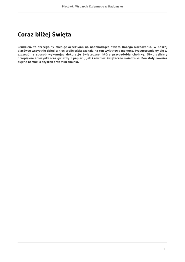 Placówki Wsparcia Dziennego w Radomsku Coraz bliżej Święta Grudzień, to szczególny miesiąc oczekiwań na nadchodzące święta Bożego Narodzenia. W naszej placówce wszystkie dzieci z niecierpliwością czekają na ten wyjątkowy moment. Przygotowujemy się w szczególny sposób wykonując dekoracje świąteczne, które przyozdobią choinkę. Stworzyliśmy przepiękne śnieżynki oraz gwiazdy z papieru, jak i również świąteczne świeczniki. Powstały również piękne bombki a szyszek oraz mini choinki. 1