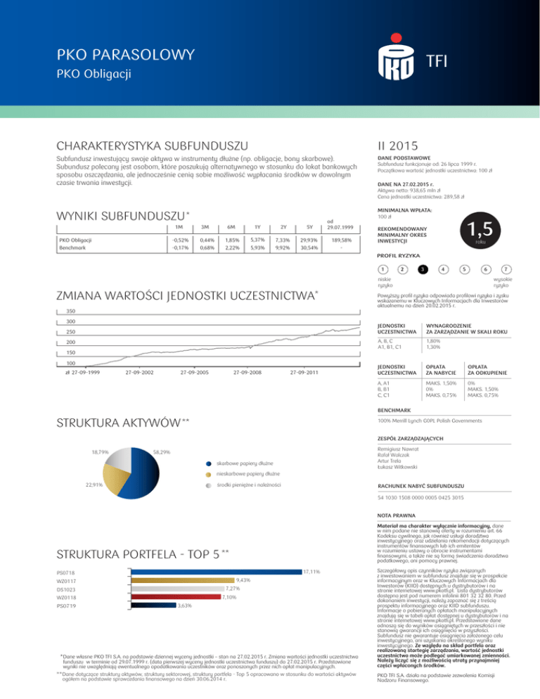 PKO PARASOLOWY PKO Obligacji CHARAKTERYSTYKA SUBFUNDUSZU II 2015 Subfundusz inwestujący swoje aktywa w instrumenty dłużne (np. obligacje, bony skarbowe). Subundusz polecany jest osobom, które poszukują alternatywnego w stosunku do lokat bankowych sposobu oszczędzania, ale jednocześnie cenią sobie możliwość wypłacania środków w dowolnym czasie trwania inwestycji. DANE PODSTAWOWE Subfundusz funkcjonuje od: 26 lipca 1999 r. Początkowa wartość jednostki uczestnictwa: 100 zł WYNIKI SUBFUNDUSZU * MINIMALNA WPŁATA: 100 zł 1M 3M 6M 1Y 2Y 5Y od 29.07.1999 PKO Obligacji -0,52% 0,44% 1,85% 5,37% 7,33% 29,93% 189,58% Benchmark -0,17% 0,68% 2,22% 5,93% 9,92% 30,54% - DANE NA 27.02.2015 r. Aktywa netto: 938,65 mln zł Cena jednostki uczestnictwa: 289,58 zł 1,5 REKOMENDOWANY MINIMALNY OKRES INWESTYCJI roku PROFIL RYZYKA 1 2 3 4 5 ZMIANA WARTOŚCI JEDNOSTKI UCZESTNICTWA* 350 300 250 200 150 100 zł 27-09-1999 27-09-2002 27-09-2005 27-09-2008 27-09-2011 7 6 niskie ryzyko wysokie ryzyko Powyższy profil ryzyka odpowiada profilowi ryzyka i zysku wskazanemu w Kluczowych Informacjach dla Inwestorów aktualnemu na dzień 20.02.2015 r. JEDNOSTKI UCZESTNICTWA WYNAGRODZENIE ZA ZARZĄDZANIE W SKALI ROKU A, B, C A1, B1, C1 1,80% 1,30% JEDNOSTKI UCZESTNICTWA OPŁATA ZA NABYCIE OPŁATA ZA ODKUPIENIE A, A1 B, B1 C, C1 MAKS. 1,50% 0% MAKS. 0,75% 0% MAKS. 1,50% MAKS. 0,75% BENCHMARK STRUKTURA AKTYWÓW ** 100% Merrill Lynch G0PL Polish Governments ZESPÓŁ ZARZĄDZAJĄCYCH 18,79% Remigiusz Nawrat Rafał Walczak Artur Trela Łukasz Witkowski 58,29% skarbowe papiery dłużne nieskarbowe papiery dłużne środki pieniężne i należności 22,91% RACHUNEK NABYĆ SUBFUNDUSZU 54 1030 1508 0000 0005 0425 3015 NOTA PRAWNA Materiał ma charakter wyłącznie informacyjny, dane w nim podane nie stanowią oferty w rozumieniu art. 66 Kodeksu cywilnego, jak również usługi doradztwa inwestycyjnego oraz udzielania rekomendacji dotyczących instrumentów finansowych lub ich emitentów w rozumieniu ustawy o obrocie instrumentami finansowymi, a także nie są formą świadczenia doradztwa podatkowego, ani pomocy prawnej. STRUKTURA PORTFELA - TOP 5 ** 17,11% PS0718 9,43% WZ0117 7,27% DS1023 7,10% WZ0118 PS0719 3,63% *Dane własne PKO TFI S.A. na podstawie dziennej wyceny jednostki – stan na 27.02.2015 r. Zmiana wartości jednostki uczestnictwa funduszu w terminie od 29.07.1999 r. (data pierwszej wyceny jednostki uczestnictwa funduszu) do 27.02.2015 r. Przedstawione wyniki nie uwzględniają ewentualnego opodatkowania uczestników oraz ponoszonych przez nich opłat manipulacyjnych. **Dane dotyczące struktury aktywów, struktury sektorowej, struktury portfela - Top 5 opracowano w stosunku do wartości aktywów ogółem na podstawie sprawozdania finansowego na dzień 30.06.2014 r. Szczegółowy opis czynników ryzyka związanych z inwestowaniem w subfundusz znajduje się w prospekcie informacyjnym oraz w Kluczowych Informacjach dla Inwestorów (KIID) dostępnych u dystrybutorów i na stronie internetowej www.pkotfi.pl. Lista dystrybutorów dostępna jest pod numerem infolinii 801 32 32 80. Przed dokonaniem inwestycji, należy zapoznać się z treścią prospektu informacyjnego oraz KIID subfunduszu. Informacje o pobieranych opłatach manipulacyjnych znajdują się w tabeli opłat dostępnej u dystrybutorów i na stronie internetowej www.pkotfi.pl. Przedstawione dane odnoszą się do wyników osiągniętych w przeszłości i nie stanowią gwarancji ich osiągnięcia w przyszłości. Subfundusz nie gwarantuje osiągnięcia założonego celu inwestycyjnego, ani uzyskania określonego wyniku inwestycyjnego. Ze względu na skład portfela oraz realizowaną startegię zarządzania, wartość jednostki uczestnictwa może podlegać umiarkowanej zmienności. Należy liczyć się z możliwością utraty przynajmniej części wpłaconych środków. PKO TFI S.A. działa na podstawie zezwolenia Komisji Nadzoru Finansowego.