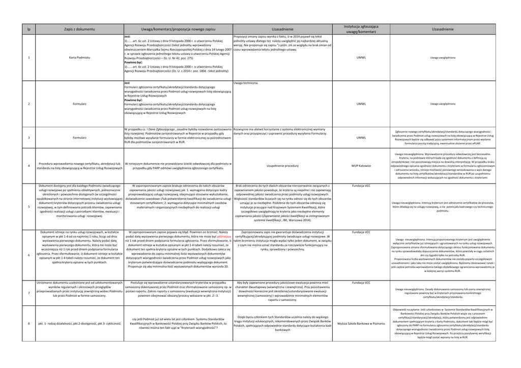 lp 1 2 3 4 5 6 7 8 Zapis z dokumentu Karta Podmiotu Formularz Formularz Uwaga/komentarz/propozycja nowego zapisu Uzasadnienie Jest: 1).......art. 6c ust. 2 Ustawy z dnia 9 listopada 2000 r. o utworzeniu Polskiej Agencji Rozwoju Przedsiębiorczości (tekst jednolity wprowadzony obwieszczeniem Marszałka Sejmu Rzeczypospolitej Polskiej z dnia 14 lutego 2007 r. w sprawie ogłoszenia jednolitego tekstu ustawy o utworzeniu Polskiej Agencji Rozwoju Przedsiębiorczości – Dz. U. Nr 42, poz. 275) Powinno być: 1).......art. 6c ust. 2 Ustawy z dnia 9 listopada 2000 r. o utworzeniu Polskiej Agencji Rozwoju Przedsiębiorczości (Dz. U. z 2014 r. poz. 1804 - tekst jednolity) Propozycji zmiany zapisu wynika z faktu, iż w 2014 pojawił się tekst jednolity ustawy dlatego też należy uwzględnić jej najbardziej aktualną wersję. Nie proponuje się zapisu "z późn. zm.ze względu na brak zmian od czasu wprowadzenia tekstu jednolitego ustawy; Jest Uwaga techniczna. Formularz zgłoszenia certyfikatu/akredytacji/standardu dotyczącego wiarygodności świadczenia przez Podmiot usług rozwojowych listę obowiązującą w Rejestrze Usług Rozwojowych Powinno być: Formularz zgłoszenia certyfikatu/akredytacji/standardu dotyczącego wiarygodności świadczenia przez Podmiot usług rozwojowych na listę obowiązującą w Rejestrze Usług Rozwojowych W przypadku cz. I Dane Zgłaszającego , zasadne byłoby rozważenie zastosowania Rozwiąznie ma ułatwić korzystanie z systemu elektronicznej wymiany listy rozwijanej Podmiotów zarejestrowanych w Rejestrze w przypadku gdy danych oraz przyspieszyć i usprawnić procedurę wysyłania Formularzy. byłoby możliwe wysyłanie formularzy w formie elektronicznej za pośrednictwem RUR dla podmiotów zarejestrowanych w RUR. Procedura wprowadzenia nowego certyfikatu, akredytacji lub W niniejszym dokumencie nie przewidziano ścieżki odwoławczej dla podmiotu w standardu na listę obowiązującą w Rejestrze Usług Rozwojowych przypadku gdy PARP odmówi uwzględnienia zgłoszonego certyfikatu. Uzupełnienie procedury Instytucja zgłaszająca uwagę/komentarz Uzasadnienie UMWL Uwaga uwzględniona UMWL Uwaga uwzględniona UMWL Zgłoszenie nowego certyfikatu/akredytacji/standardu dotyczącego wiarygodności świadczenia przez Podmiot usług rozwojowych na listę obowiązującą w Rejestrze Usług Rozwojowych będzie się odbywać poza systemem informatycznym przez wysłanie formularza pocztą tradycyjną, ewentualnie złożenie przez ePUAP. WUP Katowice Uwaga nieuwzględniona. Wprowadzenie procedury odwoławczej jest bezzasadne. Kryteria, na podstawie których bada się zgodność dokumentu z definicją są zerojedynkowe i nie pozostawiają miejsca na dowolną interpretację. W przypadku braku odpowiedniego opisania zgodności dokumentu z kryteriami w formularzu zgłoszeniowym i odrzucenia wniosku, istnieje możliwość ponownego wnioskowania o wpis danego dokumentu na listę certyfikatów/akredytacji/standardów w RUR po uzupełnieniu odpowiednich informacji wskazujących na zgodność dokumentu z kryteriami. Dokument dostępny jest dla każdego Podmiotu świadczącego W zaporoponowanym zapisie brakuje odniesienia do takich obszarów Brak odniesienia do tych dwóch obszarów nierozerwalnie związanych z usługi rozwojowe po spełnieniu obiektywnych, jednoznacznie zapewniania jakości usługi rozwojowej jak: 1. wymagania dotyczące kadry zapewnianiem jakości powoduje, że kryteria są niepełne i nie zapewniają określonych i powszechnie dostępnych (w szczególności przeprowadzającej usługę rozwojową, obejmujące stosowne wykształcenie, odpowiedniej jakości świadczenia przez podmioty usług rozwojowych. opublikowanych na stronie internetowej instytucji wystawiającej doświadczenie zawodowe i/lub potwierdzenie kwalifikacji do swiadczenia usługi Większość standardów liczacych się na rynku odnosi się do tych obszarów dokument) kryteriów dotyczących procesu świadczenia usługi stosownym certyfikatem; 2. wymagania dotyczące minimalnych zasobów uznając je za niezbędne. Podobnie do tych obszarów odnoszą się rozwojowej, w tym definiowania potrzeb klientów, zapewniania materialnych i organizacyjnych niezbędnych do realizacji usługi instytucje pracujące nad Krajowym Systemem Kwalifikacji, które zgodności realizacji usługi z potrzebami klientów, ewaluacji i szczegółowo uwzględniają te kryteria jako niezbędne elementy monitorowania usługi rozwojowej. zapewniania jakości (Zapewnianie jakości kwalifikacji w zintegrowanym systemie kwalifikacji , IBE, Warszawa 2014). Fundacja VCC Dokument istnieje na rynku usług rozwojowych, w kształcie W zaproponowanym zapisie pojawia się błąd. Powinien on brzmieć: Należy Zaproponowany zapis nie gwarantuje doświadczenia instytucji opisanym w pkt 1-4 od co najmniej 1 roku, licząc od dnia podać datę wystawienia pierwszego dokumentu, która nie może być późniejsza certyfikującej/akredytującej podmioty świadczące usługi rozwojowe. W wystawienia pierwszego dokumentu. Należy podać datę niż 1 rok przed dniem podpisania formularza zgłoszenia. Przez sformułowanie, iż takim brzmieniu instytucja mogła wydać tylko jeden dokument, w związku wystawienia pierwszego dokumentu, która nie może być dokument istnieje w kształcie opisanym w pkt 1-4 tabeli należy rozumieć, że z czym nie można uznać standardu za rzeczywiście funkcjonujący na wcześniejsza niż 1 rok przed dniem podpisania formularza dokument ten spełnia kryteria opisane w tych punktach. Dodatkowo zaleca się rynku, sprawdzony i powszechny. zgłoszenia. Przez sformułowanie, iż dokument istnieje w kształcie wprowadzenie do zapisu minimalnej ilości wystawionych dokumentów opisanym w pkt 1-4 tabeli należy rozumieć, że dokument ten dotyczących wiarygodności świadczenia przez Podmiot usług rozwojowych jako spełnia kryteria opisane w tych punktach. kryterium potwierdzające doświadczenie podmiotu wydającego dokum