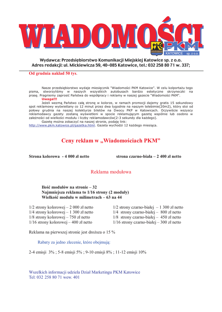 Od grudnia nakład 50 tys. Nasze przedsiębiorstwo wydaje miesięcznik "Wiadomości PKM Katowice". W celu kolportażu tego pisma, stworzyliśmy w naszych wszystkich autobusach bardzo estetyczne skrzyneczki na prasę. Pragniemy zaprosić Państwa do współpracy i reklamy w naszej gazecie "Wiadomości PKM". Uwaga!!! Jeżeli wezmą Państwo całą stronę w kolorze, w ramach promocji dajemy gratis 15 sekundowy spot reklamowy wyświetlany co 12 minut przez dwa tygodnie na naszym telebimie(20m2), który stoi od połowy grudnia na naszej kolekturze biletów na Dwocu PKP w Katowicach. Oczywiście wszyscy reklamodawcy gazety zostaną wyświetleni w spocie reklamującym gazetę wspólnie lub osobno w zależności od wielkości modułu i liczby reklamodawców(2-3 sekundy dla każdego). Gazetę można zobaczyć na naszej stronie, podaję link: http://www.pkm.katowice.pl/gazetka.html. Gazeta wychodzi 12 każdego miesiąca. Ceny reklam w „Wiadomościach PKM” Strona kolorowa - 4 000 zł netto strona czarno-biała – 2 400 zł netto Reklama modułowa Ilość modułów na stronie – 32 Najmniejsza reklama to 1/16 strony (2 moduły) Wielkość modułu w milimetrach – 63 na 44 1/2 strony kolorowej – 2 000 zł netto 1/4 strony kolorowej – 1 300 zł netto 1/8 strony kolorowej – 750 zł netto 1/16 strony kolorowej – 400 zł netto 1/2 strony czarno-białej – 1 300 zł netto 1/4 strony czarno-białej – 800 zł netto 1/8 strony czarno-białej – 450 zł netto 1/16 strony czarno-białej – 300 zł netto Reklama na pierwszej stronie jest droższa o 15 % Rabaty za jedno zlecenie, które obejmują: 2-4 emisji 3% ; 5-8 emisji 5% ; 9-10 emisji 8% ; 11-12 emisji 10% Wszelkich informacji udziela Dział Marketingu PKM Katowice Tel: 032 258 80 71 wew. 401