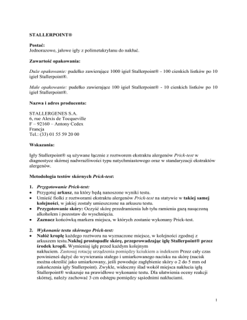STALLERPOINT® Postać: Jednorazowe, jałowe igły z polimetakrylanu do nakłuć. Zawartość opakowania: Duże opakowanie: pudełko zawierające 1000 igieł Stallerpoint® - 100 cienkich listków po 10 igieł Stallerpoint®. Małe opakowanie: pudełko zawierające 100 igieł Stallerpoint® - 10 cienkich listków po 10 igieł Stallerpoint®. Nazwa i adres producenta: STALLERGENES S.A. 6, rue Alexis de Tocqueville F – 92160 – Antony Cedex Francja Tel.: (33) 01 55 59 20 00 Wskazania: Igły Stallerpoint® są używane łącznie z roztworem ekstraktu alergenów Prick-test w diagnostyce skórnej nadwrażliwości typu natychmiastowego oraz w standaryzacji ekstraktów alergenów. Metodologia testów skórnych Prick-test: 1. Przygotowanie Prick-test: • Przygotuj arkusz, na który będą nanoszone wyniki testu. • Umieść fiolki z roztworami ekstraktu alergenów Prick-test na statywie w takiej samej kolejności, w jakiej zostały umieszczone na arkuszu testu. • Przygotowanie skóry: Oczyść skórę przedramienia lub tyłu ramienia gazą nasączoną alkoholem i pozostaw do wyschnięcia. • Zaznacz końcówką markera miejsca, w których zostanie wykonany Prick-test. 2. Wykonanie testu skórnego Prick-test: • Nałóż kroplę każdego roztworu na wyznaczone miejsce, w kolejności zgodnej z arkuszem testu.Nakłuj prostopadle skórę, przeprowadzając igłę Stallerpoint® przez środek kropli. Wymieniaj igłę przed każdym kolejnym nakłuciem. Zastosuj rotację urządzenia pomiędzy kciukiem a indeksem Przez cały czas powinieneś dążyć do wywierania stałego i umiarkowanego nacisku na skórę (nacisk można określić jako umiarkowany, jeśli powoduje zagłębienie skóry o 2 do 5 mm od zakończenia igły Stallerpoint). Zwykle, widoczny ślad wokół miejsca nakłucia igłą Stallerpoint® wskazuje na prawidłowe wykonanie testu. Dla ułatwienia oceny reakcji skórnej, należy zachować 3 cm odstępu pomiędzy sąsiednimi nakłuciami. 1 3. Odczytywanie testu skórnego Prick-test • Zapisz na arkuszu wyników nazwisko i imię pacjenta, przystaw pieczęć lekarską, nanieś datę i godzinę wykonania testu skórnego Prick-test. • Odczyt testu należy wykonywać średnio po 20 minutach. • Oczyść dokładnie skórę alkoholem, uważając by nie zmieszać roztworów w trakcie pocierania, w celu usunięcia pozostałości rozcieńczalnika, roztworu gliceloru w soli fizjologicznej, który może utrudniać obrysowywanie markerem okolicy nakłucia. • Do zaznaczania na skórze użyj najcieńszy dostępny marker. Uniesienie skóry można stwierdzić dotykiem, a jego zarys jest dobrze widoczny po oświetleniu skośną wiązką światła. • Raport z testu sporządza się, nakładając przezroczystą taśmę samoprzylepną na zarys uniesienia skóry, a następnie umieszczając ją w odpowiednim miejscu arkuszu testowego. 4. Wyniki • Wyniki testu są wiarygodne, jeśli reaktywność skóry spełnia dwa warunki: • wyniki nie są zaniżone, jeśli: średnica uniesienia skóry w teście z roztworem kontrolnym w postaci 9% fosforanu kodeiny (lub 10 mg/ml chlorowodorku histaminy) jest większa lub równa 3 mm. • wyniki nie są zawyżone, jeśli: średnica uniesienia skóry pod działaniem rozcieńczalnika, roztworu glicerolu w soli fizjologicznej, jest mniejsza lub równa 3 mm. • Wynik testu jest dodatni, jeśli: • Średnica uniesienia skóry jest wyższa niż 3 mm lub 3 mm większa niż kontrola ujemna . • Jeśli średnica uniesienia skóry jest mniejsza niż 3 mm, to wynik testu jest ujemny. Działania niepożądane: Ryzyko niewielkiego krwawienia w miejscu nakłucia. W celu zmniejszenia ryzyka wystąpienia tego powikłania, należy zredukować nacisk wywierany na skórę. Sterylizacja: Promieniowaniem gamma. Data ważności: Czytelnie wydrukowana na zewnętrznym opakowaniu ( ).. Data wydania pierwszego certyfikatu CE: 1997 Ostrzeżenia: Produkt do jednorazowego użytku. Należy zniszczyć po użyciu. Przed użyciem należy sprawdzić czy opakowanie nie jest uszkodzone. Należy unikać krwawienia. Nie można przekraczać daty ważności, umieszczonej na zewnętrznym opakowaniu. Produkt powinien być używany jedynie zgodnie ze wskazaniami podanymi przez producenta. Po użyciu, należy wyrzucić igły do pojemnika na zużyte igły i strzykawki. Data sporządzenia ulotki: Styczeń 2012 2