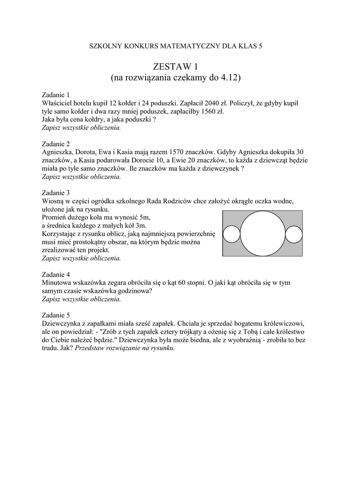 SZKOLNY KONKURS MATEMATYCZNY DLA KLAS 5 ZESTAW 1 (na rozwiązania czekamy do 4.12) Zadanie 1 Właściciel hotelu kupił 12 kołder i 24 poduszki. Zapłacił 2040 zł. Policzył, że gdyby kupił tyle samo kołder i dwa razy mniej poduszek, zapłaciłby 1560 zł. Jaka była cena kołdry, a jaka poduszki ? Zapisz wszystkie obliczenia. Zadanie 2 Agnieszka, Dorota, Ewa i Kasia mają razem 1570 znaczków. Gdyby Agnieszka dokupiła 30 znaczków, a Kasia podarowała Dorocie 10, a Ewie 20 znaczków, to każda z dziewcząt będzie miała po tyle samo znaczków. Ile znaczków ma każda z dziewczynek ? Zapisz wszystkie obliczenia. Zadanie 3 Wiosną w części ogródka szkolnego Rada Rodziców chce założyć okrągłe oczka wodne, ułożone jak na rysunku. Promień dużego koła ma wynosić 5m, a średnica każdego z małych kół 3m. Korzystając z rysunku oblicz, jaką najmniejszą powierzchnię musi mieć prostokątny obszar, na którym będzie można zrealizować ten projekt. Zapisz wszystkie obliczenia. Zadanie 4 Minutowa wskazówka zegara obróciła się o kąt 60 stopni. O jaki kąt obróciła się w tym samym czasie wskazówka godzinowa? Zapisz wszystkie obliczenia. Zadanie 5 Dziewczynka z zapałkami miała sześć zapałek. Chciała je sprzedać bogatemu królewiczowi, ale on powiedział: - "Zrób z tych zapałek cztery trójkąty a ożenię się z Tobą i całe królestwo do Ciebie należeć będzie." Dziewczynka była może biedna, ale z wyobraźnią - zrobiła to bez trudu. Jak? Przedstaw rozwiązanie na rysunku.