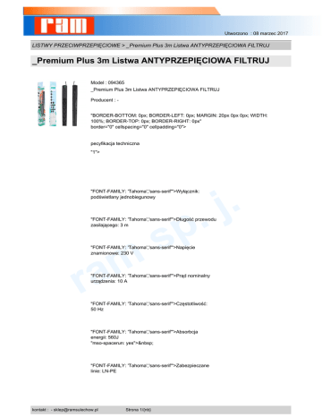 Utworzono : 08 marzec 2017 LISTWY PRZECIWPRZEPIĘCIOWE > _Premium Plus 3m Listwa ANTYPRZEPIĘCIOWA FILTRUJ _Premium Plus 3m Listwa ANTYPRZEPIĘCIOWA FILTRUJ Model : 094365 _Premium Plus 3m Listwa ANTYPRZEPIĘCIOWA FILTRUJ Producent : "BORDER-BOTTOM: 0px; BORDER-LEFT: 0px; MARGIN: 20px 0px 0px; WIDTH: 100%; BORDER-TOP: 0px; BORDER-RIGHT: 0px" border="0" cellspacing="0" cellpadding="0"> pecyfikacja techniczna "1"> . j . "FONT-FAMILY: 'Tahoma','sans-serif'">Wyłącznik: podświetlany jednobiegunowy p s "FONT-FAMILY: 'Tahoma','sans-serif'">Długość przewodu zasilającego: 3 m m a r "FONT-FAMILY: 'Tahoma','sans-serif'">Napięcie znamionowe: 230 V "FONT-FAMILY: 'Tahoma','sans-serif'">Prąd nominalny urządzenia: 10 A "FONT-FAMILY: 'Tahoma','sans-serif'">Częstotliwość: 50 Hz "FONT-FAMILY: 'Tahoma','sans-serif'">Absorbcja energii: 560J "mso-spacerun: yes"> "FONT-FAMILY: 'Tahoma','sans-serif'">Zabezpieczane linie: LN-PE kontakt : - [email protected] Strona 1/{nb} Utworzono : 08 marzec 2017 LISTWY PRZECIWPRZEPIĘCIOWE > _Premium Plus 3m Listwa ANTYPRZEPIĘCIOWA FILTRUJ _Premium Plus 3m Listwa ANTYPRZEPIĘCIOWA FILTRUJ "FONT-FAMILY: 'Tahoma','sans-serif'">Napięcie próby UOC : "FONT-FAMILY: 'Tahoma','sans-serif'">6kV "FONT-FAMILY: 'Tahoma','sans-serif'">Napięciowy poziom ochrony UP: "FONT-FAMILY: 'Tahoma','sans-serif'">≤1,5kV "FONT-FAMILY: 'Tahoma','sans-serif'">Maksymalny prąd wyładowczy IMAX : "FONT-FAMILY: 'Tahoma','sans-serif'">13kA . j . "FONT-FAMILY: 'Tahoma','sans-serif'">Bezpiecznik nadprądowy: 1xbezpiecznik automatyczny 10A/250V p s "FONT-FAMILY: 'Tahoma','sans-serif'">Filtr przeciwzakłóceniowy (EMI/RFI): "ver8b">Nie m a r "FONT-FAMILY: 'Tahoma','sans-serif'">Ubezpieczenie przyłączonego sprzętu: 1500 EURO "FONT-FAMILY: 'Tahoma','sans-serif'">Możliwość zamontowania na ścianie: Tak "FONT-FAMILY: 'Tahoma','sans-serif'">Możliwość zamontowania w szafie Rack: Tak (Uchwyt Rack jako opcja) "FONT-FAMILY: 'Tahoma','sans-serif'"> "FONT-FAMILY: 'Tahoma','sans-serif'">Dodatkowe funkcje: zabezpieczenie antyprzepięciowe i przeciwzakłóceniowe, "mso-spacerun: yes"> ochrona termiczna zaimplentowanych warystorów, obudowa "FONT-STYLE: normal; FONT-FAMILY: 'Tahoma','sans-serif'; mso-bidi-font-style: kontakt : - [email protected] Strona 2/{nb} Utworzono : 08 marzec 2017 LISTWY PRZECIWPRZEPIĘCIOWE > _Premium Plus 3m Listwa ANTYPRZEPIĘCIOWA FILTRUJ _Premium Plus 3m Listwa ANTYPRZEPIĘCIOWA FILTRUJ italic"> wykonana jest z "FONT-STYLE: normal; FONT-FAMILY: 'Tahoma','sans-serif'; mso-bidi-font-style: italic"> niepalnego tworzywa poliestrowego, "ver8b"> zabezpieczenie przed przypadkowym wyłączeniem listwy, system DUAL – wyprowadzenie kabla w dwóch kierunkach, automatyczny bezpiecznik, ochrona trzech linii zasilania. Cena : 65,01 zł Brutto ( 52,85 zł Netto) m a r kontakt : - [email protected] Strona 3/{nb} . j . p s Dostępność: Produkt dostępny w naszym sklepie od 20 kwiecień 2013