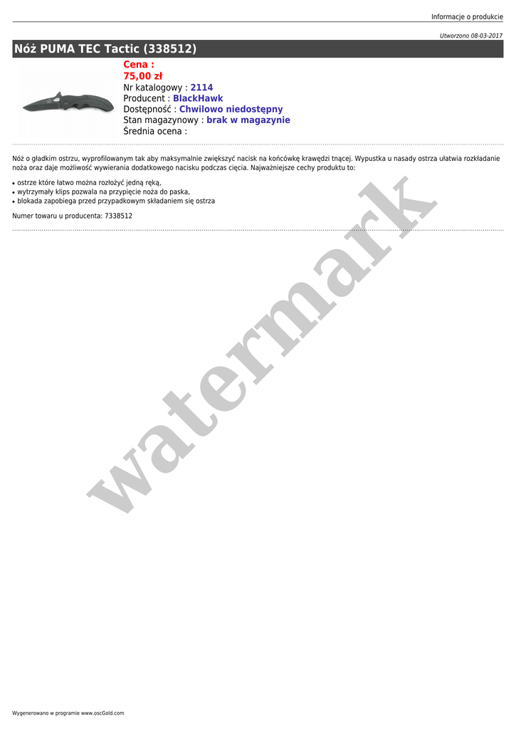 Informacje o produkcie Utworzono 08-03-2017 Nóż PUMA TEC Tactic (338512) Cena : 75,00 zł Nr katalogowy : 2114 Producent : BlackHawk Dostępność : Chwilowo niedostępny Stan magazynowy : brak w magazynie Średnia ocena : Nóż o gładkim ostrzu, wyprofilowanym tak aby maksymalnie zwiększyć nacisk na końcówkę krawędzi tnącej. Wypustka u nasady ostrza ułatwia rozkładanie noża oraz daje możliwość wywierania dodatkowego nacisku podczas cięcia. Najważniejsze cechy produktu to: ● ● ostrze które łatwo można rozłożyć jedną ręką, wytrzymały klips pozwala na przypięcie noża do paska, blokada zapobiega przed przypadkowym składaniem się ostrza w at Numer towaru u producenta: 7338512 er m ar k ● Wygenerowano w programie www.oscGold.com