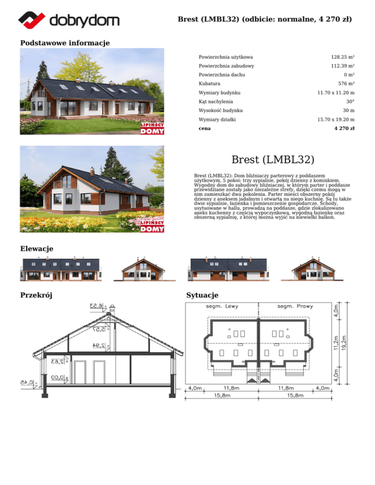 Brest (LMBL32) (odbicie: normalne, 4 270 zł) Podstawowe informacje Powierzchnia użytkowa 128.25 m² Powierzchnia zabudowy 112.39 m² Powierzchnia dachu Kubatura 0 m² 576 m³ Wymiary budynku Kąt nachylenia Wysokość budynku Wymiary działki cena 11.70 x 11.20 m 30° 30 m 15.70 x 19.20 m 4 270 zł Brest (LMBL32) Brest (LMBL32): Dom bliźniaczy parterowy z poddaszem użytkowym, 5 pokoi: trzy sypialnie, pokój dzienny z kominkiem. Wygodny dom do zabudowy bliźniaczej, w którym parter i poddasze przewidziane zostały jako niezależne strefy, dzięki czemu mogą w nim zamieszkać dwa pokolenia. Parter mieści obszerny pokój dzienny z aneksem jadalnym i otwartą na niego kuchnię. Są tu także dwie sypialnie, łazienka i pomieszczenie gospodarcze. Schody, usytuowane w hallu, prowadzą na poddasze, gdzie zlokalizowano aneks kuchenny z częścią wypoczynkową, wygodną łazienkę oraz obszerną sypialnię, z której można wyjść na niewielki balkon. Elewacje Przekrój Sytuacje Brest (LMBL32) (odbicie: normalne, 4 270 zł) Rzuty Parter 87.32 m² Komunikacja Taras Wiatrołap 5.20 m² 5.37 m² 10.02 m² Kuchnia 6.17 m² Pokój dzienny 8.52 m² Komunikacja 28.96 m² C.o. 5.70 m² Pokój 4.77 m² Łazienka 12.49 m² Pokój 4.36 m² Podest 11.15 m² Poddasze 72.38 m² Schody 4.58 m² Pokój 9.97 m² Aneks kuchenny 6.17 m² Łazienka 5.61 m² Pokój Balkon 14.60 m² 4.13 m²