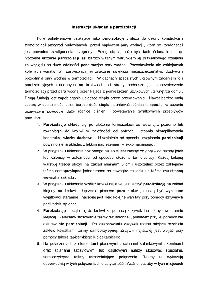 Instrukcja układania paroizolacji Folie polietylenowe działające jako paroizolacje , służą do osłony konstrukcji i termoizolacji przegród budowlanych przed napływem pary wodnej , która po kondensacji jest powodem zawilgocenia przegrody . Przegrodą tą może być dach, ściana lub strop. Szczelne ułożenie paroizolacji jest bardzo ważnym warunkiem jej prawidłowego działania ze względu na duże zdolności penetracyjne pary wodnej. Pozostawienie nie zaklejonych kolejnych warstw folii paro-izolacyjnej znacznie zwiększa niebezpieczeństwo dopływu i pozostania pary wodnej w termoizolacji . W dachach spadzistych , głównym zadaniem folii paroizolacyjnych układanych na krokwiach od strony poddasza jest zabezpieczenie termoizolacji przed parą wodną przenikającą z pomieszczeń użytkowych , z wnętrza domu . Drugą funkcją jest zapobieganie ucieczce ciepła przez przewiewanie . Nawet bardzo małą szparą w dachu może uciec bardzo dużo ciepła , ponieważ różnica temperatur w sezonie grzewczym powoduje duże różnice ciśnień i powstawanie gwałtownych przepływów powietrza . 1. Paroizolacje układa się po ułożeniu termoizolacji od wewnątrz poziomo lub równolegle do krokwi w zależności od potrzeb i stopnia skomplikowania konstrukcji więźby dachowej . Niezależnie od sposobu rozpinania paroizolacji powinno się ja układać z lekkim naprężeniem - lekko naciągając . 2. W przypadku układania poziomego najlepiej jest zacząć od góry – od osłony jętek lub kalenicy w zależności od sposobu ułożenia termoizolacji. Każdą kolejną warstwę trzeba ułożyć na zakład minimum 5 cm i uszczelnić przez zaklejenie taśmą samoprzylepną jednostronną na zewnątrz zakładu lub taśmą dwustronną wewnątrz zakładu . 3. W przypadku układania wzdłuż krokwi najlepiej jest łączyć paroizolację na zakład klejony na krokwi . Łączenia pionowe poza krokwią muszą być wykonane wyjątkowo starannie i najlepiej jest kleić kolejne warstwy przy pomocy sztywnych podkładek np.desek. 4. Paroizolację mocuje się do krokwi za pomocą zszywek lub taśmy dwustronnie klejącej . Zalecamy stosowanie taśmy dwustronnej , ponieważ przy jej pomocy nie dziurawi się paroizolacji . Po zastosowaniu zszywek trzeba miejsca przebicia zakleić kawałkami taśmy samoprzylepnej. Zszywki najłatwiej jest wbijać przy pomocy takera tapicerskiego lub dekarskiego . 5. Na połączeniach z elementami pionowymi : ścianami kolankowymi , kominami oraz ścianami samoprzylepne szczytowymi taśmy lub działowymi uszczelniające należy połączenia. stosować Taśmy te specjalne, wykazują odpowiednią w tych połączeniach elastyczność . Ważne jest aby w tych miejscach zostawić odpowiednie naddatki folii paroizolacyjnej . Do tych połączeń zaleca się stosowanie listew dociskowych mocowanych do w/w elementów pionowych (ścian i kominów) . 6. Na ewentualnych połączeniach z posadzką również należy użyć listew dociskowych . 7. Na połączeniach z oknami dachowymi i wyłazami należy stosować się do zaleceń ich producentów tak aby połączenia z futrynami lub obudowami tych elementów były szczelne. Uwaga ! Z powodu własności płyt gipsowo kartonowych przy ułożeniu paroizolacji wszelkie pomieszczenia (nie tylko łazienki) na poddaszu powinny mieć sprawnie działającą wentylację tych pomieszczeń . W przypadku braku wentylacji między płytami gipsowo kartonowymi lub na powierzchni ścian i sufitów tynkowanych może pojawić się pleśń lub grzyby . Zagraża to zdrowiu mieszkańców. Zjawisko to dotyczy również pomieszczeń nie wentylowanych znajdujących się w dowolnym miejscu budynków i nie jest związane ze stosowaniem paroizolacji . Niniejsza instrukcja podaje najważniejsze , podstawowe zalecenia i nie zawiera informacji dotyczących wszystkich możliwych rozwiązań stosowanych w konstrukcjach dachowych. Istnieją również sytuacje, w których mogą być zastosowane inne rozwiązania niż opisane w instrukcji. Instrukcja została napisana według stanu wiedzy budowlanej w czerwcu 2003 r.