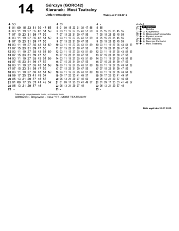 Górczyn (GORC42) Kierunek: Most Teatralny 14 4 5 6 7 8 9 10 11 12 13 14 15 16 17 18 19 20 21 22 23 53 01 03 07 03 07 03 07 03 07 03 07 03 07 03 09 05 01 05 - 09 11 15 11 15 11 15 11 15 11 15 11 15 11 17 13 09 13 15 19 23 19 23 19 23 19 23 19 23 19 23 19 25 21 17 21 23 27 31 27 31 27 31 27 31 27 31 27 31 27 33 29 25 29 31 35 39 35 39 35 39 35 39 35 39 35 39 35 41 37 33 37 Linia tramwajowa 39 43 47 43 47 43 47 43 47 43 47 43 47 43 49 45 41 45 47 51 55 51 55 51 55 51 55 51 55 51 55 51 57 53 49 55 59 59 59 59 59 59 59 57 4 5 6 7 8 9 10 11 12 13 14 15 16 17 18 19 20 21 22 23 53 01 03 07 03 07 03 07 03 07 03 07 03 07 03 09 05 01 05 - 09 11 15 11 15 11 15 11 15 11 15 11 15 11 17 13 09 13 15 19 23 19 23 19 23 19 23 19 23 19 23 19 25 21 17 21 Ważny od 01.08.2015 23 27 31 27 31 27 31 27 31 27 31 27 31 27 33 29 25 29 31 35 39 35 39 35 39 35 39 35 39 35 39 35 41 37 33 37 39 43 47 43 47 43 47 43 47 43 47 43 47 43 49 45 41 45 47 51 55 51 55 51 55 51 55 51 55 51 55 51 57 53 49 55 59 59 59 59 59 59 59 57 4 5 6 7 8 9 10 11 12 13 14 15 16 17 18 19 20 21 22 23 55 05 05 05 05 03 07 03 07 03 07 03 07 03 09 05 01 05 - 15 15 15 15 11 15 11 15 11 15 11 15 11 17 13 09 13 25 25 25 25 19 23 19 23 19 23 19 23 19 25 21 17 21 35 35 35 35 27 31 27 31 27 31 27 31 27 33 29 25 29 45 45 45 45 35 39 35 39 35 39 35 39 35 41 37 33 37 55 55 55 55 43 47 43 47 43 47 43 47 43 49 45 41 45 51 55 51 55 51 55 51 55 51 57 53 49 59 strefa A 00' 0. 01' 1. 03' 2. 05' 3. 07' 4. 09' 5. 12' 6. 15' 7. Górczyn Sielska Krauthofera Głogowska/Hetmańska Rynek Łazarski Park Wilsona Dworzec Zachodni Most Teatralny 59 59 59 59 57 Tolerancja: przyspieszenie 1 min., opóźnienie 3 min. GÓRCZYN - Głogowska - trasa PST - MOST TEATRALNY Data wydruku 31.07.2015 Most Teatralny (MT46) Kierunek: Górczyn 14 4 5 6 7 8 9 10 11 12 13 14 15 16 17 18 19 20 21 22 23 46 54 02 10 06 14 02 10 06 14 02 10 06 14 02 10 06 14 02 10 06 14 02 10 06 14 02 10 06 14 02 10 06 14 02 10 06 14 02A 18 22 18 22 18 22 18 22 18 22 18 22 18 22 18 22 18 22 26 30 26 30 26 30 26 30 26 30 26 30 26 30 26 30 26 30 34 38 34 38 34 38 34 38 34 38 34 38 34 38 34 38 34 38 Linia tramwajowa 42 46 42 46 42 46 42 46 42 46 42 46 42 46 42 46 42 46 50 54 50 54 50 54 50 54 50 54 50 54 50 54 50 54 50 54 58 58 58 58 58 58 58 58 58 4 5 6 7 8 9 10 11 12 13 14 15 16 17 18 19 20 21 22 23 46 54 02 10 06 14 02 10 06 14 02 10 06 14 02 10 06 14 02 10 06 14 02 10 06 14 02 10 06 14 02 10 06 14 02 10 06 14 02A 18 22 18 22 18 22 18 22 18 22 18 22 18 22 18 22 18 22 Ważny od 01.08.2015 26 30 26 30 26 30 26 30 26 30 26 30 26 30 26 30 26 30 34 38 34 38 34 38 34 38 34 38 34 38 34 38 34 38 34 38 42 46 42 46 42 46 42 46 42 46 42 46 42 46 42 46 42 46 50 54 50 54 50 54 50 54 50 54 50 54 50 54 50 54 50 54 58 58 58 58 58 58 58 58 58 4 5 6 7 8 9 10 11 12 13 14 15 16 17 18 19 20 21 22 23 54 04 04 04 04 04 02 06 02 06 02 06 02 06 02 06 02 06 02 14 14 14 14 14 10 14 10 14 10 14 10 14 10 14 10 14 24 24 24 24 22 18 22 18 22 18 22 18 22 18 22 18 22 34 34 34 34 30 26 30 26 30 26 30 26 30 26 30 26 30 44 44 44 44 38 34 38 34 38 34 38 34 38 34 38 34 38 54 54 54 54 46 42 46 42 46 42 46 42 46 42 46 42 46 54 50 54 50 54 50 54 50 54 50 54 50 54 strefa A 00' 0. 03' 1. 06' 2. 08' 3. 10' 4. 12' 5. 14' 6. 15' 7. Most Teatralny Dworzec Zachodni Park Wilsona Rynek Łazarski Głogowska/Hetmańska Krauthofera Sielska Górczyn 58 58 58 58 58 58 Tolerancja: przyspieszenie 1 min., opóźnienie 3 min. MOST TEATRALNY - trasa PST - Głogowska - GÓRCZYN A - Kurs do: Głogowska/Hetmańska Data wydruku 31.07.2015
