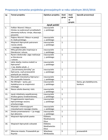 Propozycje tematów projektów gimnazjalnych w roku szkolnym 2015/2016 Lp. Temat projektu Opiekun projektu Ilość grup Ilość osób w grupie Sposób prezentacji Język polski 1. 2. 3. 4. 5. 6. 7. 8. 9. 10. 11. Folklor Warmii i Mazur. Omów na wybranych przykładach elementy kultury: stroje, obyczaje, piosenki. Piękno Warmii i Mazur w poezji K.I.Gałczyńskiego. Wojciech Kętrzyński patronem naszej szkoły i naszego miasta. Mity greckie jako inspiracja w literaturze i sztuce. Rycerz doskonały i jego realizacje w literaturze i sztuce. Jakie skarby można znaleźć w Kętrzynie? ( np. dzieła sztuki…) „Zaczarowaną dorożką” po Kętrzynie, czyli przewodnik poetycki po mieście. Niezwykli mieszkańcy Kętrzyna i ich niezwykłe historie. Na Olimpie – quizy, gry dydaktyczne ze znajomości mitologii. Nasza szkoła dawniej i dziś. 15 Język młodzieży współczesnej. Analiza gwary środowiskowej. Przygotowanie repertuaru kętrzyńskiego sezonu artystycznego. Wywiad z interesującymi mieszkańcami naszego miasta. Sztuka przemawiania – i ja mogę być aktorem. Wojciech Kętrzyński-poeta 16. Wojciech Kętrzyński-człowiek 17 Wieczne miasto. Przewodnik po Rzymie 12. 13. 14. nauczyciele j. polskiego 1 nauczyciele j. polskiego nauczyciele j. polskiego 1 nauczyciele j. polskiego nauczyciele j. polskiego 1 nauczyciele j. polskiego 1 nauczyciele j. polskiego 1 nauczyciele j. polskiego nauczyciele j. polskiego 1 nauczyciele j. polskiego nauczyciele j. polskiego nauczyciele j. polskiego 1 nauczyciele j. polskiego nauczyciele j. polskiego Elżbieta NiedźwieckaDżus Elżbieta NiedźwieckaDżus Wiesława Winkowska 1 1 1 1 Quizy, gry dydaktyczne, konkurs 1 1 1 1 1 5 przewodnik Historia 16. 17. 18. 20. 21. 22. 23. 24. 25. 26. Zabytki mojego miasta. Ocalić od zapomnienia- historia we wspomnieniach rodzinnych. Zdarzyło się w moim mieście – postać lub wydarzenie związane z miastem. J.Gresik J.Gresik 1 1 3-4 3-4 J.Gresik 1 3-4 Mikołaj Kopernik- człowiek renesansu na Warmii. Patriotyzm wczoraj i dziś. 150 lat –Powstanie Styczniowe. Historia godła polskiego. Cienie i blaski demokracji szlacheckiej. Wybitna postać w historii Polski. Wojciech Kętrzyński - historyk J.Gresik 1 3-4 J.Gresik J.Gresik J.Gresik J.Gresik 1 1 1 1 3-4 3-4 3-4 3-4 J.Gresik J.Gresik 1 1 3-4 3-4 1 1 1 1 3-4 3-4 3-4 3-4 1 3-4 1 1 3-4 3-4 1 1 3-4 3-4 WOS 27. 28. 29. 30. 31. 32. 33. 34. 35. Totalitarne oblicze państwa. Reklama jako sztuka perswazji. Subkultura młodzieżowa. Jedno państwo wielu ludzimniejszość narodowa. Komunikacja niewerbalna, czyli mowa ciała. Społeczeństwo obywatelskie. Zjednoczona Europa- Unia Europejska. Ochrona praw człowieka w Polsce. Rynek pracy. n-le wos-u w gimnazjum Matematyka 36. M.Zawadzka 1 3-4 Zbiór zadań M.Zawadzka 1 3-4 M.Zawadzka 1 3-4 Prezentacja multimedialna, album, in. Plakat, album i in. M.Bielska 1 3-4 Album 40. Prędkość, droga, czas-zbiór zadań matematyczno-fizycznych wraz z rozwiązaniami Jednostki miary i wagi dawniej a dziś. Czas wolny w liczbach i na wykresach Czego możemy się nauczyć od starożytnych mędrców? Bryły w architekturze. M.Bielska 1 3-4 41. Symetrie wokół nas. M.Bielska 1 3-4 Plakat, prezentacja multimedialna Plakat, gazetka, prezentacja 42. 43. 44. Złote proporcje. Pytania Fermiego. Poezja i liczby. J.Chudzik J.Chudzik J.Chudzik 1 1 1 4-5 4-5 4-5 37. 38. 39. 45. 46. 47. 48. 49. 50. 51. 52. 53. Moja szkoła z matematyką w tle. Jaki procent kierowców stosuje się do przestrzegania prędkości? Czy szóstka w rzucie kostką wypada najrzadziej? Czy milion złotych wypłacony w złotówkach zmieści się w sali nr 12? Czy liczba 5050 jest liczbą trójkątną? Jak obliczyć sumę kątów w dowolnym wielokącie? Każdy może oszczędzać wodę. Symetria w moim mieście i szkole. Jak prezentuje się nasza szkoła w procentach? Słynni matematycy – od Starożytności do współczesności Matematyka na wesołogry,zagadki, pomoce naukowe Szyfry- prezentacja multimedialna J.Chudzik M.Żołędziowska 1 1 4-5 3-4 M.Żołędziowska 1 3-4 M.Żołędziowska 1 3-4 M.Żołędziowska 1 3-4 M.Żołędziowska 1 3-4 M.Żołędziowska M.Żołędziowska M.Żołędziowska 1 1 1 3-4 3-4 3-4 S.Grochecka 1 3-4 Album, prezentacja , in. S.Grochecka 1 3-5 Gry, pomoce naukowe S.Grochecka 1 3-4 Matematyka w paluszku- zbiór zadań z wybranego działu, własne opracowania S.Grochecka 1 3-4 Prezentacja multimedialna Zbiór zadań Fizyka 54. 55. 56. 58. 59 Optyka w przyrodzie – zjawiska tęczy, mirażu, fatamorgany. Prędkość, droga, czas-zbiór zadań matematyczno-fizycznych wraz z rozwiązaniami Lunety, peryskopy i in. przyrządy fizyczne Domowa instalacja elektryczna Doświadczenia fizyczne-domowym sposobem M.Zawadzka 1 M.Zawadzka 1 Prezentacja multimedialna Zbiór zadań M.Zawadzka 1 Pomoce naukowe M.Zawadzka M.Zawadzka 1 1 Prezentacja Doświadczenie udokumentowane prezentacją, albumem,filmem Biologia 60. 62. 63. 64. 65. Nawyki żywieniowe wśród gimnazjalistów i licealistów Red-bull, Coca –cola” – pić, czy nie pić? Sekrety układu krążenia. Wpływ roślin leczniczych na życie człowieka. Żywność ekologiczna-moda, sposób na życie. B.Korzeniewska -Siwek A.Szepczyńska 1 3-4 1 3-4 A.Szepczyńska A.Szepczyńska 1 1 3-4 3-4 A.Szepczyńska 1 3-4 Chemia 66. 67. 68. 69. Czy woda jest najważniejszą cząsteczką w naszym życiu? Kwasy w laboratorium chemicznym i wokół nas. Budowa atomu w skali makro. Badanie odczynu substancji z naszego otoczenia. Tlenki wokół nas Kwasy w naszym otoczeniu U.Wankiewicz 1 3-4 U.Wankiewicz 1 3-4 U.Wankiewicz U.Wankiewicz 1 1 3-4 3-4 U.Wankiewicz U.Wankiewicz 1 1 3-4 3-4 Geografia 70. Znane czy nie znane – atrakcje turystyczne powiatu kętrzyńskiego. R.Puczel 1 3-4 71. 72. 73. Ekstremalne zjawiska na świecie. Największe i najmniejsze… Znane i nieznane-atrakcje powiatu kętrzyńskiego R.Puczel R.Puczel R.Puczel 1 1 1 3-4 3-4 3-4 Jęz. niemiecki 74. Zaprojektuj dwudniową wycieczkę klasową do Berlina.