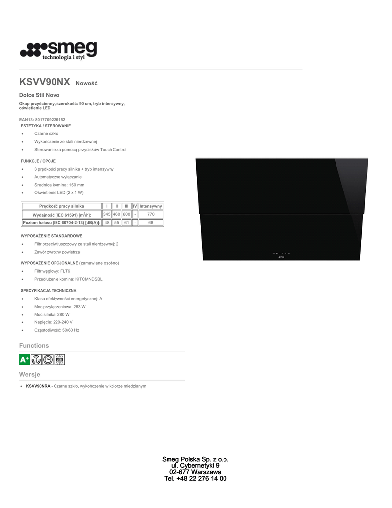 KSVV90NX Nowość Dolce Stil Novo Okap przyścienny, szerokość: 90 cm, tryb intensywny, oświetlenie LED EAN13: 8017709226152 ESTETYKA / STEROWANIE Czarne szkło Wykończenie ze stali nierdzewnej Sterowanie za pomocą przycisków Touch Control FUNKCJE / OPCJE 3 prędkości pracy silnika + tryb intensywny Automatyczne wyłączanie Średnica komina: 150 mm Oświetlenie LED (2 x 1 W) Prędkość pracy silnika Wydajność (IEC 61591) [m3/h]: I II III 345 460 600 Poziom hałasu (IEC 60704-2-13) [dB(A)]: 48 55 61 IV Intensywny - 770 - 68 WYPOSAŻENIE STANDARDOWE Filtr przeciwtłuszczowy ze stali nierdzewnej: 2 Zawór zwrotny powietrza WYPOSAŻENIE OPCJONALNE (zamawiane osobno) Filtr węglowy: FLT6 Przedłużenie komina: KITCMNDSBL SPECYFIKACJA TECHNICZNA Klasa efektywności energetycznej: A Moc przyłączeniowa: 283 W Moc silnika: 280 W Napięcie: 220-240 V Częstotliwość: 50/60 Hz Functions Wersje KSVV90NRA - Czarne szkło, wykończenie w kolorze miedzianym Smeg Polska Sp. z o.o. ul. Cybernetyki 9 02-677 Warszawa Tel. +48 22 276 14 00 KSVV90NX Dolce Stil Novo przyścienne 90 cm czarne szkło + stal nierdzewna A+: Klasa A + pozwala na oszczędność energii do 10% w stosunku do urządzeń należących do klasy A. Wydajność urządzenia jest gwarantowana pomimo niskiego poziomu zużycia energii. TRYB INTENSYWNY: Tryb intensywny pozwala na uruchomienie okapu z maksymalną wydajnością, tak aby w sposób istotny przyspieszyć niwelowanie najbardziej uporczywych zapachów powstałych podczas gotowania. AUTOMATYCZNE WYŁĄCZENIE: Funkcja ta pozwala na automatyczne wyłączenie okapu po upływie zaprogramowanego czasu. Okap kontynuuje proces oczyszczania powietrza podczas ustawionego czasu, a następnie wyłącza się automatycznie. Oświetlenie LED: Wybrane modele zostały wyposażone w wewnętrzne oświetlenie LED, które gwarantuje oszczędność energii elektrycznej oraz świeże i dokładne oświetlenie wnętrza. Smeg Polska Sp. z o.o. ul. Cybernetyki 9 02-677 Warszawa Tel. +48 22 276 14 00 KSVV90NX Dolce Stil Novo przyścienne 90 cm czarne szkło + stal nierdzewna Smeg Polska Sp. z o.o. ul. Cybernetyki 9 02-677 Warszawa Tel. +48 22 276 14 00