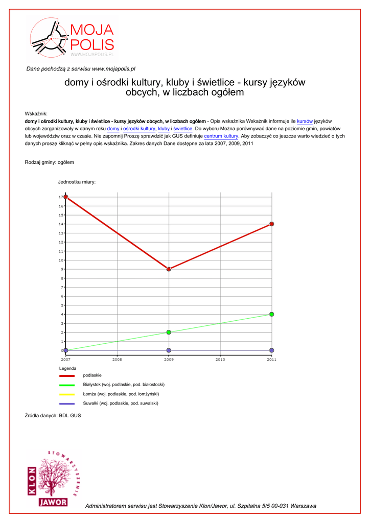 Dane pochodzą z serwisu www.mojapolis.pl domy i ośrodki kultury, kluby i świetlice - kursy języków obcych, w liczbach ogółem Wskaźnik: domy i ośrodki kultury, kluby i świetlice - kursy języków obcych, w liczbach ogółem - Opis wskaźnika Wskaźnik informuje ile kursów języków obcych zorganizowały w danym roku domy i ośrodki kultury, kluby i świetlice. Do wyboru Można porównywać dane na poziomie gmin, powiatów lub województw oraz w czasie. Nie zapomnij Proszę sprawdzić jak GUS definiuje centrum kultury. Aby zobaczyć co jeszcze warto wiedzieć o tych danych proszę kliknąć w pełny opis wskaźnika. Zakres danych Dane dostępne za lata 2007, 2009, 2011 Rodzaj gminy: ogółem Jednostka miary: Legenda podlaskie Białystok (woj. podlaskie, pod. białostocki) Łomża (woj. podlaskie, pod. łomżyński) Suwałki (woj. podlaskie, pod. suwalski) Źródła danych: BDL GUS Administratorem serwisu jest Stowarzyszenie Klon/Jawor, ul. Szpitalna 5/5 00-031 Warszawa