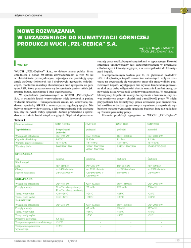 artykuły sponsorowane Nowe rozwiązania w urządzeniach do klimatyzacji górniczej produkcji WUCh „PZL-Dębica” S.A. mgr inż. Bogdan MAZUR WUCh „PZL-Dębica” S.A. 1 WSTĘP WUCH „PZL-Dębica” S.A., to dobrze znana polska firma chłodnicza z ponad 80-letnim doświadczeniem w tym 55 lat w chłodnictwie przemysłowym, zajmująca się produkcją sprężarek zarówno tłokowych jak i śrubowych, agregatów chłodniczych, montażem instalacji chłodniczych oraz agregatów do gazu typu ASR, które przeznaczone są do sprężania gazów takich jak: propan, butan, gaz ziemny i inne węglowodory. W sprężarkach produkowanych w WUCH „PZL-Dębica” S.A. w ostatnich latach wprowadzono wiele istotnych z punktu widzenia trwałości i funkcjonalności zmian, np. omawianą niedawno sprężarkę SR163 z automatyczną regulacją sprężu. Nie były to zmiany widowiskowe, a ich wprowadzanie było ostrożne tak, aby na rynek trafiły sprężarki dobrze przebadane i sprawdzone w trakcie badań eksploatacyjnych. Stąd też dopiero teraz ruszają prace nad kolejnymi sprężarkami w typoszeregu. Rozwój sprężarek umotywowany jest zapotrzebowaniem w przemyśle chłodniczym i klimatyzacyjnym, a w szczególności do klimatyzacji kopalń. Niezaprzeczalnym faktem jest to, że głębokość pokładów złóż i eksploatacja kopalń surowców naturalnych wpływa znacząco na pogarszanie się warunków pracy dla pracowników podziemnych kopalń. Występująca tam wysoka temperatura pierwotna skał przy dużej wilgotności obniża znacznie komfort pracy, co powoduje niską wydajność wydobywania zasobów. W przypadku klimatyzacji kopalń nie mamy do czynienia z luksusem, czy nawet komfortem pracy – chodzi tutaj o możliwość pracy. W wielu przypadkach bez klimatyzacji praca człowieka jest niemożliwa, lub możliwa w bardzo ograniczonym wymiarze, a zagrożenie wybuchem metanu wymuszają specjalną budowę, inne niż na lądzie są również parametry pracy. Historia produkcji agregatów w WUCH „PZL-Dębica” Tabela 1 Dane techniczne GMC 630 GMC 1000 GMC 2000 pośredni pośredni pośredni Qo= 632 kW R 134a +5÷+40°C 3600/1500/2600 4000/1500/2600 Qo= 1108 kW R 134a +5÷+40°C 15403/1390/2960 Qo= 2000 kW R 134a +5÷+40°C 17490/1765/2810 tłokowa śrubowa śrubowa Śrubowa Pn= 110 kW n= 1450 obr/min Un=500/1000 V Pn= 200 kW n= 2950 obr/min Un=500/1000 V Un=6000 V Pn= 355 kW n= 2950 obr/min Un=6000 V Pn= 630 kW n= 2950 obr/min Un=6000 V Qk= 487 kW 28 m3/h - obieg otwarty 41 m3/h - obieg zamknięty +20÷+26°C +35÷+42°C Qo= 832 kW 72 m3/h Qk= 1450 kW 125 m3/h Qk= 2900 kW 250 m3/h +28°C +38°C +28°C +38°C +28°C +38°C Wydajność chłodnicza Przepływ wody Temp. wody wlot Temp. wody wylot Przepływ powietrza Temperatura powietrza wlotowego Qk= 359 kW Qo= 632 kW 42 m3/h +16°C +3°C - Qk= 1108 kW 69 m3/h +16°C +3°C - Qk= 2000 kW 127 m3/h +16°C +3°C - Temperatura powietrza wylotowego +12oC - - - Typ działania Wydajność chłodnicza Czynnik chłodniczy Warunki pracy (otoczenia) Wymiary d/s/w GMC 350/TA Bezpośredni /pośredni Qo= 395 kW R407C +5÷+40°C 3400/900/1300 Sprężarka Typ Silnik napęd. Moc Obroty Napięcie zasilania Skraplacz Wydajność chłodnicza Przepływ wody Temp. wody wlot Temp. wody wylot Parownik 8,3 m3/s +31°C technika chłodnicza i klimatyzacyjna 5/2016 199 artykuły sponsorowane 2 S.A. do klimatyzacji kopalń sięga lat 70-tych, kiedy głównym produktem były jednostki chłodnicze bezpośredniego działania montowane w pobliżu wyrobiska. Wytwarzaniem tych urządzeń zakład zajmował się z przerwami od roku 1978. W okresie przemian politycznych ich sprzedaż zanikła aż do momentu podjętej współpracy z firmą z branży górniczej, oraz znacznej intensyfikacji prac rozwojowych na przełomie 2005/2006 roku. Wtedy powstała koncepcja nowego typoszeregu agregatów do klimatyzacji kopalń. Są to nowoczesne, proekologiczne i energooszczędne urządzenia przewidziane do pracy w warunkach kopalnianych w strefie zagrożenia wybuchem. Są to zarówno urządzenia o małej wydajności tj. 350-360 kW z bezpośrednim odparowaniem czynnika w chłodnicy zabudowywane w pobliżu przodka, jak i urządzenia duże o wydajności 1000 - 2000 kW o działaniu pośrednim do zabudowy w specjalnej komorze w pobliżu szybu wentylacyjnego. Dla przypomnienia przedstawiamy opracowany w 2005 roku dla potrzeb klimatyzacji kopalń przedstawiony w tabeli 1. Uwzględniając rozwój nowoczesnych technologii, konstrukcji oraz zapotrzebowanie i wymagania klientów, po upływie kilku lat wprowadzono nowe rozwiązania. W tabeli 2 zestawiono dane techniczne zbudowanych ostatnio agregatów. W niniejszej publikacji ograniczono się do omówienia agregatów bezpośredniego działania (RC360B), tzn. urządzenia do bezpośredniego ochładzania powietrza kopalnianego przepływającego przez te urządzenia i pośredniego do chłodzenia wody lodowej (GMC1800, GMC-E 1000 i RC360P). BUDOWA I DZIAŁANIE GÓRNICZEJ MASZYNY CHŁODNICZEJ GMC 1800 DO KLIMATYZACJI GRUPOWEJ Urządzenie GMC 1800, to najnowsza wyprodukowana maszyna dla potrzeb klimatyzacji grupowej. Ze względu na wymaganą dużą wydajność chłodniczą, parametry pracy i panujące w kopalniach warunki, zbudowana została ona na bazie dławnicowej sprężarki śrubowej. Na wstępie należy wyjaśnić dlaczego sprężarka „otwarta” dławnicowa i dlaczego z łożyskami ślizgowymi do przenoszenia sił poprzecznych: - dławnicowa bowiem musi istnieć możliwość łatwej i szybkiej wymiany uszkodzonego silnika; - dławnicowa, ponieważ istnieje konieczność doboru silnika pod istniejące zasilanie w kopalni (1000 V, 3000 V, 6000 V); - z łożyskami ślizgowymi, ponieważ musi być odporna na trudne warunki tj. przekroczenia parametrów pracy, podlewanie ciekłym czynnikiem, również uderzenia podczas transportu, czy tąpnięcia podczas pracy (łożyska toczne są wrażliwe na wszelkiego rodzaju uderzenia czy znaczne przeciążenia). Wyjaśnienia wy