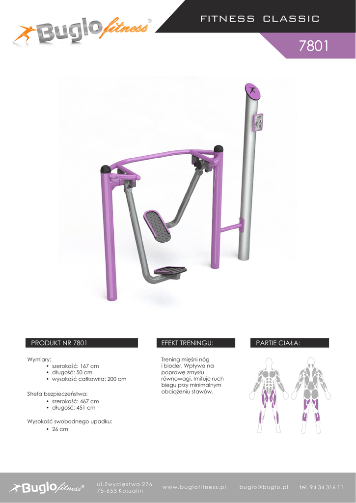 FITNESS CLASSIC 7801 PRODUKT NR 7801 EFEKT TRENINGU: Wymiary: • szerokość: 167 cm • długość: 50 cm • wysokość całkowita: 200 cm Strefa bezpieczeństwa: • szerokość: 467 cm • długość: 451 cm PARTIE CIAŁA: Trening mięśni nóg i bioder. Wpływa na poprawę zmysłu równowagi. Imituje ruch biegu przy minimalnym obciążeniu stawów. Wysokość swobodnego upadku: • 26 cm u l .uZ lw . Zywcyi ęcsi ę tw s taw2a7267 6 w w ww. b wuwg. lbouf igt n l oe. spsl. p l 7 57- 655- 635K3oKs o z as zl ia nl i n bu bgulgol@ o@ bu bgulgol.op.lp l tel. 94 34 316 11