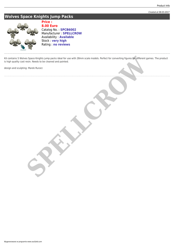 Product Info Created at 08-03-2017 Wolves Space Knights Jump Packs Price : 8.00 Euro Catalog No. : SPCB6002 Manufacturer : SPELLCROW Availability : Available Stock : very high Rating : no reviews Kit contains 5 Wolves Space Knights jump packs ideal for use with 28mm scale models. Perfect for converting figures for different games. The product is high quality cast resin. Needs to be cleaned and painted. SP EL L C R O W design and sculpting: Marek Rurarz Wygenerowano w programie www.oscGold.com