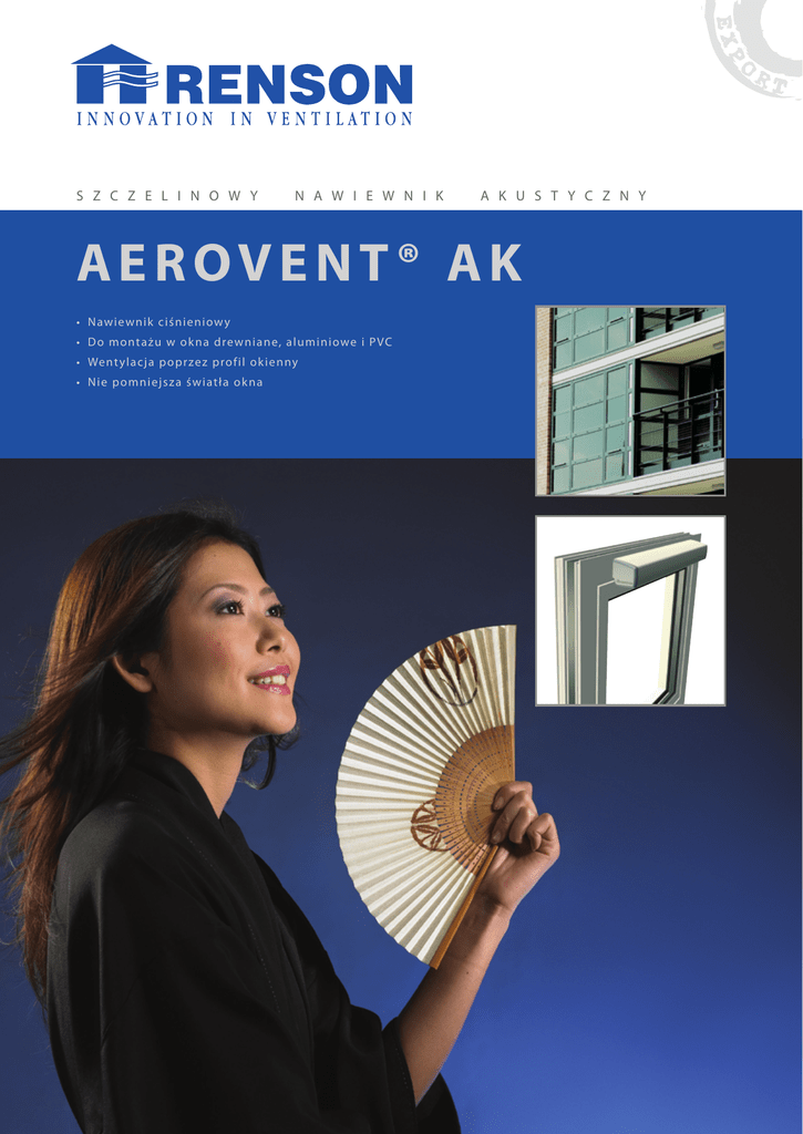 s z c z e l i n o w y n a w i e w n i k a k u s t y c z n y AE ROVE NT® AK • N aw i e w ni k c i ś n i e n i ow y • D o m ont a żu w o k n a d re w n i a n e, a l u m i n i owe i PV C • We nt yl a c j a p o pr ze z p ro f i l o k i e n ny • N i e p om ni e j sz a ś w i atł a o k n a A E ROV E N T ® A K OPIS AEROVENT ® AK jest estetycznym szczelinowym nawiewnikiem akustycznym. Urządzenie to wyposażone jest w ciśnieniową klapkę samoregulującą, która zapewnia stały i równomierny dopływ powietrza, zabezpieczając jednocześnie przed przeciągami. PRODUK T Strona zewnętrzna: Profil aluminiowy, estetyczny montaż na każdym typie profilu okiennego. ① ③ ① Klapka samoregulującą, zapewniająca stały i równomierny dopływ powietrza. Czerpnia wewnętrzna ② ③ Kolory standartowe RAL 9016, 8019 ② Z A S T O S OWA NIE • Do okien drewnianych, aluminiowych i PVC • Do montażu w oknach nowych jak i już istniejących • Sterowanie manualne lub za pomocą sznurka żaluzyjnego DANE TECHNICZNE • Długość profilu zewnętrznego: 414 mm • Długość profilu wewnętrznego: 400 mm • Przepływ powietrza 25m 3 /h (10 Pa - wymiar frezu 330 x 12mm) • Przepływ powietrza 20m 3 /h (10 Pa - wymiar frezu 330 x 8mm) • Tłumienie akustyczne w pozycji otwartej: Dn,e,w 40 (-1,-2) dB(A) • Tłumienie akustyczne w pozycji zamknietej: Dn,e,w 41 (-1,-1) dB(A) (minimalna przepustowość 5m 3 /h) • Odporność na przenikanie wody opadowej (nawiewnik otwarty): 650 Pa • Do montażu do wszystkich głębokości profili © Renson Ventilation NV, Waregem, 2008 Wszelkie prawa zastrzeżone. Żadna część niniejszej publikacji nie może być reprodukowana, przechowywana w zautomatyzowanym systemie wyszukiwawczym ani udostępniana w żadnej postaci i w żaden sposób, w formie elektronicznej czy mechanicznej, w tym w postaci fotokopii, nagrania dźwiękowego i tym podobnych, bez wcześniejszego pisemnego upoważnienie autora. RENSON BELGIUM • IZ 2 Vijverdam • Maalbeekstraat 10 • B-8790 Waregem Tél. +32 (0)56 62 71 11 • Fax +32 (0)56 60 28 51 • [email protected] • www.renson.eu © L2007912 W Polsce do Państwa dyspozycji pozostają nasi przedstawiciele: Janusz Gluza tel. 0 603-722-415, [email protected] Grzegorz Jaworski tel. 0 609-772-228. [email protected] 11/08 Zastrzega się prawo do wprowadzania modyfikacji technicznych