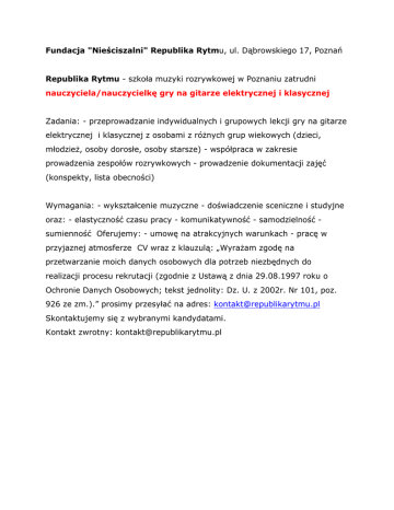 Fundacja "Nieściszalni" Republika Rytmu, ul. Dąbrowskiego 17, Poznań Republika Rytmu - szkoła muzyki rozrywkowej w Poznaniu zatrudni nauczyciela/nauczycielkę gry na gitarze elektrycznej i klasycznej Zadania: - przeprowadzanie indywidualnych i grupowych lekcji gry na gitarze elektrycznej i klasycznej z osobami z różnych grup wiekowych (dzieci, młodzież, osoby dorosłe, osoby starsze) - współpraca w zakresie prowadzenia zespołów rozrywkowych - prowadzenie dokumentacji zajęć (konspekty, lista obecności) Wymagania: - wykształcenie muzyczne - doświadczenie sceniczne i studyjne oraz: - elastyczność czasu pracy - komunikatywność - samodzielność sumienność Oferujemy: - umowę na atrakcyjnych warunkach - pracę w przyjaznej atmosferze CV wraz z klauzulą: „Wyrażam zgodę na przetwarzanie moich danych osobowych dla potrzeb niezbędnych do realizacji procesu rekrutacji (zgodnie z Ustawą z dnia 29.08.1997 roku o Ochronie Danych Osobowych; tekst jednolity: Dz. U. z 2002r. Nr 101, poz. 926 ze zm.).” prosimy przesyłać na adres: [email protected] Skontaktujemy się z wybranymi kandydatami. Kontakt zwrotny: [email protected]