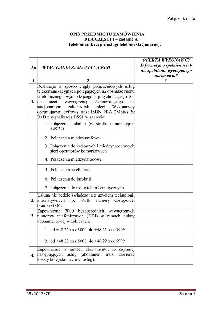 Załącznik nr 1a OPIS PRZEDMIOTU ZAMÓWIENIA DLA CZĘŚCI I – zadanie A Telekomunikacyjne usługi telefonii stacjonarnej. Lp. WYMAGANIA ZAMAWIAJĄCEGO 1. 2. Realizacja w sposób ciągły połączeniowych usług telekomunikacyjnych polegających na obsłudze ruchu telefonicznego wychodzącego i przychodzącego z i 1. do sieci wewnętrznej Zamawiającego na stacjonarnym zakończeniu sieci Wykonawcy obejmującym cyfrowy trakt ISDN PRA 2Mbit/s 30 B+D z sygnalizacją DSS1 w zakresie: 1. Połączenia lokalne (w strefie numeracyjnej +48 22) OFERTA WYKONAWCY Informacja o spełnieniu lub nie spełnieniu wymaganego parametru.* 3. 2. Połączenia międzystrefowe 3. Połączenia do krajowych i międzynarodowych sieci operatorów komórkowych 4. Połączenia międzynarodowe 5. Połączenia satelitarne 6. Połączenia do infolinii 7. Połączenia do usług teleinformatycznych. Usługa nie będzie świadczona z użyciem technologii 2. alternatywnych np: -VoIP, numery dostępowe, bramki GSM. Zapewnienie 2000 bezpośrednich wewnętrznych 3. numerów telefonicznych (DDI) w ramach opłaty abonamentowej w zakresach: 1. od +48 22 xxx 3000 do +48 22 xxx 3999 2. od +48 22 xxx 5000 do +48 22 xxx 5999 Zapewnienie w ramach abonamentu, co najmniej 4. następujących usług (abonament musi zawierać koszty korzystania z nw. usług): 25/2012/ZP Strona 1 1. Połączenia w ramach sieci firmowej Zamawiającego obejmującej wszystkie numery telefoniczne stacjonarne użytkowane w ramach łącza ISDN 30 B+D oraz wszystkie numery telefonów komórkowych Zamawiającego obsługiwanych przez Wykonawcę 2. CLIP prezentacja wywołującego numeru łącza 3. CLIR - blokada prezentacji numeru łącza wywołującego Zapewnienie punktu styku z własną siecią 5. w pomieszczeniu wskazanym przez Zamawiającego w oparciu o urządzenia Wykonawcy Wykonawca przeprowadzi testy połączeń i sygnalizacji pomiędzy urządzeniami Wykonawcy 6. i Zamawiającego potwierdzone obustronnie podpisanym protokołem zdawczo-odbiorczym usługi. Umowa nie zawiera pakietów bezpłatnych minut 7. i rabatów za wykonane połączenia Rozliczanie opłat za połączenia odbywać się będzie w oparciu o naliczanie sekundowe bez opłaty za 8. inicjację połączenia ze stałą dobową ceną i jednakową do wszystkich operatorów w każdej grupie połączeń, niezależnie od dnia tygodnia. Wykonawca w ramach opłaty abonamentowej przekazywać będzie comiesięczne bilingi w wersji 9. elektronicznej, w formacie plików tekstowych rozdzielnie dla obydwu zakresów numeracji, zawierające: 1. Datę i czas połączenia, czas trwania 2. Numer wywołujący z informacją o DDI 3. Numer wywoływany 4. Koszt połączenia Wykonawca zastosuje opłaty za pozostałe połączenia i usługi – niewymienione w ofercie, wg powszechnie 10. stosowanych najniższych cen dla innych użytkowników. Stawki wszystkich opłat dla Zamawiającego nie większe niż oferowane w aktualnych cennikach Wykonawcy. W przypadku wprowadzenia przez 11. Wykonawcę nowego cennika zawierającego niższe ceny połączeń niż oferowane w przetargu, Wykonawca na wniosek Zamawiającego i po ewentualnych negocjacjach musi zmienić ceny 25/2012/ZP Strona 2 połączeń dla Zamawiającego na korzystniejsze. Wykonawca zapewni świadczenie usług z zachowaniem wartości wskaźników, jakości 12. określonych w normach i zaleceniach opracowanych przez telekomunikacyjne organizacje normalizacyjne. Wykonawca zapewni całodobowe przyjmowanie zgłoszeń o awariach wraz z informacją zwrotną do 13. Zamawiającego o szacowanym terminie usunięcia awarii. Wykonawca nieodpłatnie zapewni zestawienie drogi 14. alternatywnej w przypadku uszkodzenia łącza podstawowego. 15. Wykonawca numerów. zapewni możliwość zastrzegania * - Jeśli oferowany parametr spełnia wymogi Zamawiającego należy wpisać „SPEŁNIA” w kolumnie nr 3, w przeciwnym wypadku „NIE SPEŁNIA”. ……................................................... /podpis uprawnionego przedstawiciela Wykonawcy/ 25/2012/ZP Strona 3