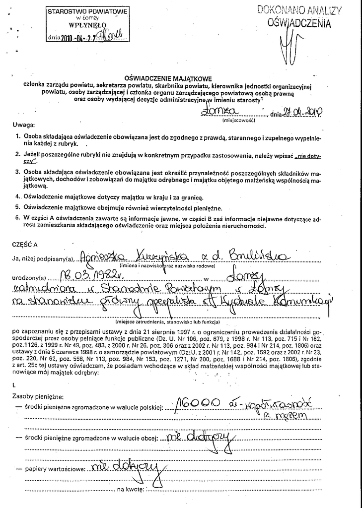 r-tryir, A mn ArdAlza,:if • STAROSTWO POWIATOWE w torn2y . . - OSWADCZEN WPLYNgLO dnia7010-44-17. OSWIADCZENIE MAJATKOVVE cztonka zarzqdu powtatu, sekretarza powiatu, skarbnika powiatu, kierownika jednostki organizacyjnej powiatu, osoby zarzgdzajgcej i cztonka organu zarzadzajgcego powiatowq osobq prawna oraz osoby wydajqcej decyzje administracyjne imieniu starostyl dnia24- .2A9 (miejscowoad) Uwaga: 1. Osoba sktadajqca oiwiadczenie obowiqzana jest do zgodnego z prawda, starannego i zupetnego wypetnienia kaidej z rubryk. . 2. Jeieli poszczegolne rubryki nie znajdujg w konkretnym przypadku zastosowania, naleiy wpisa6 „nie dotvczy". 3. Osoba sktadajqca oSwiadczenie obowiqzana jest okreali6 przynaleinoi6 poszczegolnych sktadnikow majqtkowych, dochodow i zobowigzari do majatku odrgbnego i majqtku objgtego matieriskq wspolnoecia majatkowq. 4. Og wiadczenie majatkowe dotyczy majqtku w kraju i za granicq. 5. Oiwiadczenie majatkowe obejmuje rowniei wierzytelnoaci pienigine. 6. W czeici A owiadczenia zawarte s informacje jawne, w czgaci B zai informacje niejawne dotyczqce adresu zamieszkania sktadajacego oiwiadczenie oraz miejsca potoienia nieruchomoSci. CZESe A J a, niiej A podpisany(a), . tigsrneo zko-- urodzony(a) (imiona i ng (x_a.feau1U44ic)naaz zwisko r nazwisko rodowe) (19-R2-1/4 Lc- .volcruxicona ‘-c ca..fbranotclkekdt_ (miejsce zatrudnienia, stanowiska luta funkcja) pa zapoznaniu sie z przepisami ustawy z dnia 21 sierpnia 1997 r. o ograniczeniu prowadzenia dziatalnoSci gospodarczej przez osoby petniace funkcje publiczne (Dz. U. Ni 106, poz. 679,2 1998 r. Ni 113, poz. 715 i Ni 162, poz.1126, z 1999 r. Ni 49, poz. 483, z 2000 r. Ni 26, poz. 306 oraz z 2002 r. Ni 113, poz. 9841 Ni 214, poz. 1806) oraz ustawy z dnia 5 czerwca 1998 r. o samorzadzie powiatowym (Dz..U. 22001 r. Ni 142, poz. 1592 oraz z 2002 r.Nr 23, poz. 220, Nr 62, poz. 558, Nr 113, poz. 984, Nr 153, poz. 1271, Ni 200, poz. 1688 i Ni 214, poz. 1806), zgodnie z art. 25c tej ustawy oawiadczam, ie posiadam wchodzace w sktad matienskiej wspOlnoSci majatkowej lub stanowiace m6j majatek odrebny: Zasoby pienigine: — Srodki pienigine zgromadzone w walucie polskiej. G000 (4_ Nxr) — Srodki pienieine zgromadzone w walucie — papiery wartoSciowe: . na kwote: ' li. 1. Dom o powierzchni: 2. Mieszkanie o powierzchni: 3. Gospodarstwo mine: rodzaj gospodarstwa: o wartotci: . rodzaj zabudowy tytut prawhy: . \ 17— 0I likk m2, o wartotch m2, o wartotch tytut prawny: tytut prawny: Ing- 4 . powierzchnia• it. W. Elk 00 Z tego tytutu osiqgnqtern(etam) w roku ubiegtym przychOd i dochOd w wysokonci. 4.Inne nieruchomonci: powierzchnia. o wartonci: tytut prawny: Posiadam udziaty w spOtkach handlovvych — naleiy poda6 liczbe i emitenta udziat6w: udziaty te stanowiq pokier wiekszy nii 10% udziatow w spOtce: 1 "C °C4 Q- 1 dal Z tego tytutu osiqgnqtem(etam) w roku ubiegtym dochod w wysokonci: Iv. Posiadam akcje w spotkach handlowych — naleiy poda6 liczbe i emitenta akcji: akcje te stanowiq pakiet wiekszy nit 10% akcji w spOtce: jdn Z tego tytutu osiqgnqtem(etam) w roku ubiegtym doch6d w wysokonci: V. Nabytem(am) (nabyt moj mationek, z wytaczeniem mienia przynaleinego do jego majatku odrebnego) od Skarbu Paiistwa, innej panstwowej osoby prawnej, jednostek samorzadu terytorialnego, ich zwiqzkow lub ad komunalnej osoby prawnej nastepujace mienie, Ictare podlegato zbyciu w drodze przetargu naleiy podat opis mienia i date nabycia, ad kogo: 1. I. `P fowadze dziatalnotd gospodarcze (naleiy podad forme prawn q I Przedmiot dziatalnoact): — osobitcle •— wspolnie z innymi osobami Z tego tytutu osiqgnatem(etam) w roku ubiegtym przyched 1 doch6d w wysokoki: Zaaqdzam dziatalnoeciq gospodarczq lub jestern przedstawicielem, petnomocnikiem takiej dziatalnodci (notch,/ podad forme prawnq i p rzedmiot dziatalnoki). — osobitcie — wspolnie z innymi osobami "lb Z tego tytutu osiqgnqtem(etam) w roku ubiegiym doch6d w wysokokiI. • . W spOtkach handlowych (nazwa, siedziba spotki): jestem cztonkiern zarzqdu Cod kiedy): — jestem cztonkiem rady nadzorczej (ad kiedy): — jestem cztonkiem komisji rewizyjnej (ad kiedy): Mkt, a' Z tego tytutu osiqgnqtem(gtam) w roku ubiegiym dochOd w wysokodci: . W spetdzielniach: — jestem cztonkiem zarzqdu Cod kiedy): ritcduriA — jestem cztonkiem rady nadzorczej a (ad kiedy): — jestem cztonkiem komisji rewizyjnej (ad kiedy): 1 I Ltd' Z tego tytutu osiqgnqtem(gtam) w roku ubiegiym dochod w wysokoki: ' 3. W fundacjach prowadzqcych dziatalno66 gospodarcza• jestem cztonkiem zarzedu (od kiedy): 1119d — jestem cztonkiem rady nadzorczej (od kiedy): . jestem cztonkiem korhisji rewizyjnej (od kiedy): ther- Z tego tytutu osiegnetem(etam) w roku ubiegtym doch6d w wysokoSci: VIII. Inne dochody osiegane z tytutu zatrcudnieni lub innej dziatal '6sszarobkowej lub zaje6, z podaniem kwot uzyskiwanych z kaidego tytutu• 4 IX. Sktadniki mienia ruchomego o wartoSci powyiej 10 000 ztotych (w przypadku pojazdow mechanicznych nateiy poda6 mark, model i rok produkcji): \63 rk6sict z p cm ?ern X. Zobowiezania pienieine o wartoSci powyiej 10 000 ztotych, w tym zaciagniete kredyty i poiyczki oraz warunki, na jakich z st ty udzielone (wobec kogo, w zwiezku z jakim zdarzeniem, w jakiej wysokoSci):