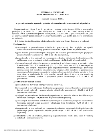 UCHWAŁA NR XI/59/15 RADY MIEJSKIEJ W TORZYMIU z dnia 25 listopada 2015 r. w sprawie ustalenia wysokości podatku od nieruchomości oraz zwolnień od podatku Na podstawie art. 18 ust. 2 pkt 8 i art. 40 ust. 1 ustawy z dnia 8 marca 1990r. o samorządzie gminnym (t.j.z 2015r. Dz. U. poz. 1515) oraz art. 5 ust. 1 i 3, art. 7 ust.3 ustawy z dnia 12 stycznia 1991 r. o podatkachi opłatach lokalnych (t. j. z 2014 r. Dz. U. poz. 849 z późn. zm.), art. 37 ustawy z dnia 9 października 2015r.o rewitalizacji (Dz. U. z 2015r. poz. 1777) uchwala się, co następuje: § 1. Ustala się stawki podatku od nieruchomości na terenie Gminy Torzym w wysokości: 1) od gruntów: a) związanych z prowadzeniem działalności gospodarczej, bez względu na sposób zakwalifikowania w ewidencji gruntów i budynków – 0,82 zł od 1 m² powierzchni, b) pod wodami powierzchniowymi stojącymi lub wodami powierzchniowymi płynącymi jezior i zbiorników sztucznych – 4,58 zł od 1 ha powierzchni, c) pozostałych, w tym zajętych na prowadzenie odpłatnej statutowej działalności pożytku publicznego przez organizacje pożytku publicznego – 0,34 zł od 1 m2 powierzchni, d) niezabudowanych objętych obszarem rewitalizacji, o którym mowa w ustawie z dnia 9 października 2015 r. o rewitalizacji (Dz. U. z 2015 roku poz. 1777), i położonych na terenach, dla których miejscowy plan zagospodarowania przestrzennego przewiduje przeznaczenie pod zabudowę mieszkaniową, usługową albo zabudowę o przeznaczeniu mieszanym obejmującym wyłącznie te rodzaje zabudowy, jeżeli od dnia wejścia w życie tego planu w odniesieniu do tych gruntów upłynął okres 4 lat, a w tym czasie nie zakończono budowy zgodnie z przepisami prawa budowlanego – 3 zł od 1 m2 powierzchni. 2) od budynków lub ich części : a) mieszkalnych: 0,70 zł od 1 m2 powierzchni użytkowej, b) związanych z prowadzeniem działalności gospodarczej oraz od budynków mieszkalnych lub ich części zajętych na prowadzenie działalności gospodarczej - 20,80 zł od 1 m2 powierzchni użytkowej, c) zajętych na prowadzenie działalności gospodarczej w zakresie obrotu kwalifikowanym materiałem siewnym - 10,56 zł od 1 m2 powierzchni użytkowej, d) związanych z udzielaniem świadczeń zdrowotnych w rozumieniu przepisów o działalności leczniczej, zajętych przez podmioty udzielające tych świadczeń– 4,58 zł od 1 m2 powierzchni użytkowej, e) pozostałych, w tym zajętych na prowadzenie odpłatnej statutowej działalności pożytku publicznego przez organizacje pożytku publicznego - 6,52 zł od 1 m2 powierzchni użytkowej. 3) od budowli - 2 % ich wartości, określonej na podstawie art. 4 ust.1 pkt 3 i ust. 3-7 ustawy o podatkach i opłatach lokalnych. Id: 357DAA93-CA2C-43D1-AE32-0D1C9C1E4485. Podpisany Strona 1 § 2. Wprowadza się inne zwolnienia w podatku od nieruchomości, oprócz wymienionych w art. 7 ust. 1 ustawy o podatkach i opłatach lokalnych i zwalnia się z podatku od nieruchomości, nieruchomości i ich części wykorzystywane na cele ochrony przeciwpożarowej. § 3. Traci moc uchwała nr II /6/14 Rady Miejskiej w Torzymiu z dnia 10 grudnia 2014r. w sprawie ustalenia wysokości podatku od nieruchomości oraz zwolnień od podatku. § 4. Wykonanie uchwały powierza się Burmistrzowi. § 5. Uchwała wchodzi w życie po upływie 14 dni od dnia ogłoszenia w Dzienniku Urzędowym Województwa Lubuskiego, nie wcześniej jednak niż z dniem 1 stycznia 2016 r. Przewodniczący Rady Zbigniew Wołoncewicz Id: 357DAA93-CA2C-43D1-AE32-0D1C9C1E4485. Podpisany Strona 2