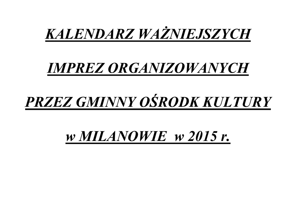 KALENDARZ WAŻNIEJSZYCH IMPREZ ORGANIZOWANYCH PRZEZ GMINNY OŚRODK KULTURY w MILANOWIE w 2015 r. Lp. 1. 2 3 4 5 6 Nazwa Planowanych działań Koncert Kolęd i Pastorałek - 25 styczeń 2015r. Halowy turniej Piłki Nożnej o Puchar Wójta Gminy styczeń 2015r. Ferie zimowe dla dzieci Dzień Kobiet – 8 marzec 2015r. XVI Powiatowy Przegląd Teatrów Dziecięcych i Młodzieżowych- 12 marzec 2015 r. XV Przegląd Amatorskich Zespołów Wokalnych, Instrumentalnych i Wokalno-Instrumentalnych – 16 kwiecień 2015r. Opis Organizator Gminny Ośrodek Kultury w Milanowie. Współorganizator GBP w Milanowie Osoba odpowiedzialna: Małgorzata Osipiak. Koncert w wykonaniu lokalnych zespołów muzycznych, którego celem jest pielęgnowanie tradycji świątecznego kolędowania. Impreza odbywa się co roku w innej miejscowości gminy. Organizator GOK Milanów, w turnieju biorą udział zaproszone drużyny, impreza sportowa cykliczna skierowana dla dorosłych i młodzieży, mająca na celu popularyzację sportowego spędzania wolnego czasu i zdrowego stylu życia. Organizator GOK w Milanowie, Gminna Komisja ds. Rozwiązywania Problemów Alkoholowych. Osoba odpowiedzialna Jacek Pogorzelec , Małgorzata Osipiak. Różnego rodzaju zajęcia z zakresu rysunku, tańca, teatru, zajęcia sportoworekreacyjne między innymi wyjazdy na lodowisko, na basen i narty, do teatru, kina, ponadto różnego rodzaju turnieje i konkursy. Organizator -Gminny Ośrodek Kultury, GBP w Milanowie i inne organizacje działające na terenie gminy. Osoba odpowiedzialna: Małgorzata Osipiak Impreza cykliczna, dla kobiet mieszkanek Gminy Milanów. Impreza powiatowa. Prezentująca dorobek artystyczny grup teatralnych działających na terenie powiatu parczewskiego. Organizator Gminny Ośrodek Kultury w Milanowie ul. Kościelna 3A , współorganizator GBP w Milanowie. Osoba odpowiedzialna: Małgorzata Osipiak. Impreza cykliczna, powiatowa; prezentacja solistów i zespołów wykonujących różnego rodzaju muzykę, stwarzająca możliwość skorzystania z fachowego instruktażu, przygotowująca dzieci i młodzież do Wojewódzkiego Festiwalu Piosenki Dziecięcej i Młodzieżowej. 7. 8. 9. 10. 11. 12. 13. 14. 3 Maja Gminne Święto sportu -festyn z okazji Dnia Dziecka – 1 czerwiec 2015r. Gminny Ośrodek Kultury, ul. Kościelna 3 A. Osoba odpowiedzialna : Małgorzata Osipiak, Impreza patriotyczna- lokalna, uczczenie rocznicy Konstytucji 3 Maja. Organizator GOK Milanów, ul. Kościelna 3 A. Osoba odpowiedzialna Jacek Pogorzelec. Impreza lokalna, sportowo-rekreacyjna. Letni Turniej Piłki Nożnej – czerwiec 2015r. GOK Milanów, w turnieju biorą udział zaproszone drużyny, impreza sportowa cykliczna skierowana dla dorosłych i młodzieży, mająca na celu popularyzację sportowego spędzania wolnego czasu i zdrowego stylu życia. VIII KAPELIADA – 21 czerwiec Organizator GOK , współorganizatorzy :Gimnazjum, KGW z terenu Gminy Milanów, GBP w Milanowie Osoba odpowiedzialna Małgorzata Osipiak. Impreza cykliczna o zasięgu regionalnym mająca na celu prezentacje dorobku artystycznego kapel i śpiewaków ludowych. Obóz sportowy dla dzieci i młodzieży – czerwiec/lipiec 2015 Festyn rekreacyjny z okazji Dni Milanowa 19 lipiec 2015r. Międzynarodowy Plener Malarski im. Zbigniewa Nasiłowskiego- Milanów 2015. - lipiec Dożynki Gminne – 30 sierpień 2015 r. zajęcia sportowe i edukacyjne dla dzieci i młodzieży spędzającej wakacje w domu (zajęcia prowadzone przez GOK przez okres 10-14 dni), przez wykwalifikowaną kadrę połączone z wycieczkami mającymi na celu poznawanie zabytków ziemi lubelskiej. Organizator; GOK Milanów, Wójt i Rada Gminy Milanów. Współorganizator GBP w Milanowie Impreza plastyczna, integracyjna Impreza plenerowa, cykliczna, prezentująca trud pracy rolniczej. Osoba odpowiedzialna- Małgorzata Osipiak , Jacek Pogorzelec. Organizator Gminny Ośrodek Kultury w Milanowie, oraz KGW działające na terenie gminy. 15. 16. 17. 18. 19. Eliminacje XX Jesiennego Konkursu Recytatorskiego- Święto Pieczonego Ziemniaka – 18 październik 2015r. Konkurs skierowany do dzieci, młodzieży i osób dorosłych. Organizator Powiatowa Biblioteka Publiczna Centrum Kultury w Parczewie . Eliminacje gminne GOK w Milanowie. Organizator; GOK , KGW. Osoby odpowiedzialne ; Małgorzata Osipiak. Impreza o zasięgu lokalnym; plenerowa impreza połączona z degustacją potraw ziemniaczanych. Święto Niepodległości-11 listopad 2015r. Organizator: GOK Milanów, Szkoły z terenu Gminy Milanów. Osoba odpowiedzialna: Małgorzata Osipiak.. Obchody święta narodowego połączone z koncertem okolicznościowym. Andrzejkowe Spotkania z Folklorem- 29 listopad 2015r. Organizator- Gok Milanowie ul. Kościelna 3A, współorganizator - Gimnazjum w Milanowie, GBP w Milanowie. Osoba odpowiedzialna: Małgorzata Osipiak . Impreza o zasięgu regionalnym , obrzędowa, nawiązująca do ludowych tradycji nocy andrzejkowej Wieczory poezji- grudzień Organizator: Gminny Ośrodek Kultury, Gimnazjum i Szkoła Podstawowa w Milanowie oraz GBP w Milanowie. Osoba odpowiedzialna: Małgorzata Osipiak Wieczorki poezji mające na celu prezentacje dorobku pisarskiego miejscowych poetów ludowych. 20. 21. Kiermasz Bożonarodzeniowy - grudzień Bal Sylwestrowy – 31 grudzień 2015 Organizator GOK Milanów, współorganizator: Gimnazjum i szkoły podstawowe z terenu Gminy Milanów, GBP w Milanowie. Występy i koncerty charytatywne podczas, których odbywa się zbiórka darów na paczki dla dzieci z najbiedniejszych rodzin. Oraz kiermasz wypieków i ozdób choinkowych. Ponadto wspólne przygotowywanie potraw wigilijnych i ozdób choinkowych oraz wspólna zabawa