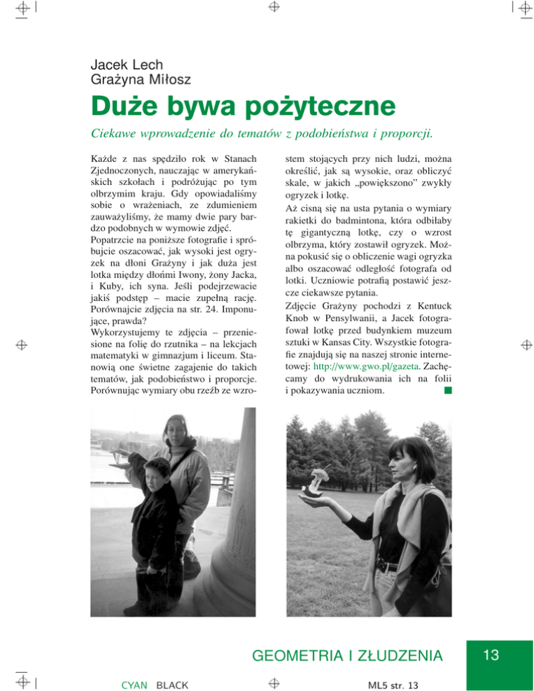 Jacek Lech Grażyna Miłosz Duże bywa pożyteczne Ciekawe wprowadzenie do tematów z podobieństwa i proporcji. Każde z nas sp˛edziło rok w Stanach Zjednoczonych, nauczajac ˛ w amerykańskich szkołach i podróżujac ˛ po tym olbrzymim kraju. Gdy opowiadaliśmy sobie o wrażeniach, ze zdumieniem zauważyliśmy, że mamy dwie pary bardzo podobnych w wymowie zdj˛eć. Popatrzcie na poniższe fotografie i spróbujcie oszacować, jak wysoki jest ogryzek na dłoni Grażyny i jak duża jest lotka mi˛edzy dłońmi Iwony, żony Jacka, i Kuby, ich syna. Jeśli podejrzewacie jakiś podst˛ep – macie zupełna˛ racj˛e. Porównajcie zdj˛ecia na str. 24. Imponujace, ˛ prawda? Wykorzystujemy te zdj˛ecia – przeniesione na foli˛e do rzutnika – na lekcjach matematyki w gimnazjum i liceum. Stanowia˛ one świetne zagajenie do takich tematów, jak podobieństwo i proporcje. Porównujac ˛ wymiary obu rzeźb ze wzro- stem stojacych ˛ przy nich ludzi, można określić, jak sa˛ wysokie, oraz obliczyć skale, w jakich „powi˛ekszono” zwykły ogryzek i lotk˛e. Aż cisna˛ si˛e na usta pytania o wymiary rakietki do badmintona, która odbiłaby t˛e gigantyczna˛ lotk˛e, czy o wzrost olbrzyma, który zostawił ogryzek. Można pokusić si˛e o obliczenie wagi ogryzka albo oszacować odległość fotografa od lotki. Uczniowie potrafia˛ postawić jeszcze ciekawsze pytania. Zdj˛ecie Grażyny pochodzi z Kentuck Knob w Pensylwanii, a Jacek fotografował lotk˛e przed budynkiem muzeum sztuki w Kansas City. Wszystkie fotografie znajduja˛ si˛e na naszej stronie internetowej: http://www.gwo.pl/gazeta. Zach˛ecamy do wydrukowania ich na folii i pokazywania uczniom. GEOMETRIA I ZŁUDZENIA CYAN BLACK ML5 str. 13 13
