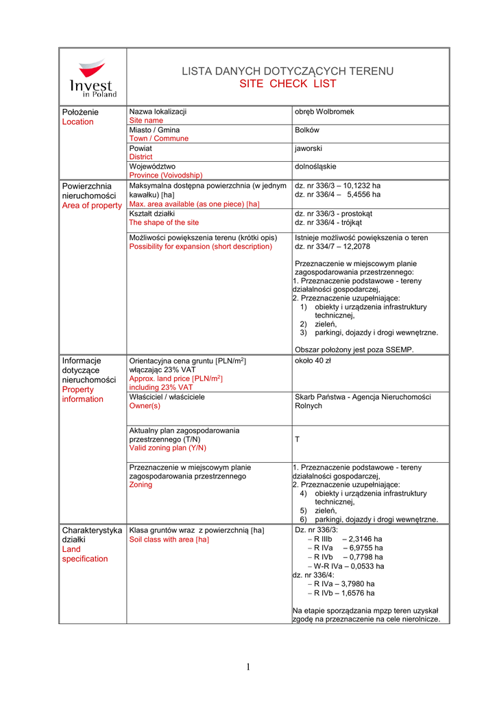 LISTA DANYCH DOTYCZĄCYCH TERENU SITE CHECK LIST Położenie Location Nazwa lokalizacji Site name Miasto / Gmina Town / Commune Powiat District Województwo Province (Voivodship) Maksymalna dostępna powierzchnia (w jednym Powierzchnia kawałku) ha nieruchomości Area of property Max. area available (as one piece) ha Kształt działki The shape of the site Możliwości powiększenia terenu (krótki opis) Possibility for expansion (short description) obręb Wolbromek Bolków jaworski dolnośląskie dz. nr 336/3 – 10,1232 ha dz. nr 336/4 – 5,4556 ha dz. nr 336/3 - prostokąt dz. nr 336/4 - trójkąt Istnieje możliwość powiększenia o teren dz. nr 334/7 – 12,2078 Przeznaczenie w miejscowym planie zagospodarowania przestrzennego: 1. Przeznaczenie podstawowe - tereny działalności gospodarczej, 2. Przeznaczenie uzupełniające: 1) obiekty i urządzenia infrastruktury technicznej, 2) zieleń, 3) parkingi, dojazdy i drogi wewnętrzne. Informacje dotyczące nieruchomości Property information PLN/m2 Orientacyjna cena gruntu włączając 23% VAT Approx. land price PLN/m2 including 23% VAT Właściciel / właściciele Owner(s) Obszar położony jest poza SSEMP. około 40 zł Skarb Państwa - Agencja Nieruchomości Rolnych Aktualny plan zagospodarowania przestrzennego (T/N) Valid zoning plan (Y/N) T Przeznaczenie w miejscowym planie zagospodarowania przestrzennego Zoning Charakterystyka Klasa gruntów wraz z powierzchnią ha Soil class with area ha działki Land specification 1. Przeznaczenie podstawowe - tereny działalności gospodarczej, 2. Przeznaczenie uzupełniające: 4) obiekty i urządzenia infrastruktury technicznej, 5) zieleń, 6) parkingi, dojazdy i drogi wewnętrzne. Dz. nr 336/3: R IIIb – 2,3146 ha R IVa – 6,9755 ha R IVb – 0,7798 ha W-R IVa – 0,0533 ha dz. nr 336/4: R IVa – 3,7980 ha R IVb – 1,6576 ha Na etapie sporządzania mpzp teren uzyskał zgodę na przeznaczenie na cele nierolnicze. 1 Różnica poziomów terenu m Differences in land level m 15 m (300 m npm – 315 m npm) Obecne użytkowanie Present usage rolnicze Zanieczyszczenia wód powierzchniowych i gruntowych (T/N) Soil and underground water pollution (Y/N) Poziom wód gruntowych m Underground water level m brak danych Czy były prowadzone badania geologiczne terenu (T/N) Were geological research done (Y/N) N Ryzyko wystąpienia zalań lub obsunięć terenu (T/N) Risk of flooding or land slide (Y/N) N Przeszkody podziemne (T/N) Underground obstacles (Y/N) Ograniczenia budowlane N N Przeszkody występujące na powierzchni terenu (T/N) Ground and overhead obstacles (Y/N) Istniejące ograniczenia ekologiczne (T/N) Ecological restrictions (Y/N) N Budynki i zabudowania na terenie (T/N) Buildings / other constructions on site (Y/N) N N Wskaźnik zabudowy terenu maksimum – 0,50 Procent dopuszczalnej zabudowy Building coverage % Building restrictions Ograniczenia wysokości budynków m Building height limit m Strefa buforowa m Maksymalna wysokość budynków – 10,00m. Wysokość ta może być przekroczona instalacjami technologicznymi o 50% Ewentualna uciążliwość związana z działalnością prowadzoną w obrębie poszczególnych działek nie może wykraczać poza granice tych działek i naruszać standardów jakościowych środowiska ustalonych dla terenów sąsiednich. Buffer zone m 1. Wprowadza się następujące zasady kształtowania ładu przestrzennego i krajobrazu kulturowego: 1) zabudowę kubaturową, za wyjątkiem budynków portierni o powierzchni do 50m 2, należy sytuować respektując oznaczone na rysunku planu nieprzekraczalne linie zabudowy oraz wymaganą orientacje budynków, 2) na całych terenach dopuszcza się sytuowanie: a) dojść, dojazdów i otwartych parkingów, b) zieleni, c) obiektów i urządzeń infrastruktury technicznej służących obsłudze terenu a także lokalnych i magistralnych sieci infrastruktury technicznej, 3) ewentualne place składowe oraz budynki Inne, jeśli występują Others if any 2 gospodarcze i wiaty należy sytuować w głębi działek w stosunku do drogi krajowej nr 5, 4) na każdej działce wymaga się stosowania jednorodnych rozwiązań w zakresie posadzek urbanistycznych, 5) wyklucza się lokalizację wolnostojących garaży, 2. Ustala się następujące wymagania architektoniczne dotyczące projektowanej zabudowy: 1) typ zabudowy – wolnostojąca lub zwarta, 2) maksymalna wysokość budynków – 10,00m. Wysokość ta może być przekroczona instalacjami technologicznymi o 50%, 3) dachy – o kącie nachylenia połaci maksimum 120, jednakowym we wszystkich budynkach sytuowanych w obrębie działki, 4) we wszystkich budynkach sytuowanych w obrębie działki wymaga się stosowania ujednoliconych rozwiązań w zakresie wykończenia i kolorystyki elewacji, 5) wprowadza się wymóg różnicowania w odstępach 12,00-30,00m formy elewacji widocznych od strony drogi KD/D i drogi krajowej nr 5, szczególnie poprzez takie zabiegi jak zastosowanie uskoków, ryzalitów, różnicowanie materiałów wykończeniowych, kolorystyki oraz wprowadzanie przeszkleń, 3. Ustala się następujące wskaźniki wykorzystania terenu: 1) wskaźnik zabudowy terenu maksimum 0,50, 2) wskaźnik intensywności zabudowy maksimum 1,00, 4. Ustala się następujące zasady ochrony dziedzictwa kulturowego i zabytków: 1) w obrębie terenów DG nie występują obiekty lub obszary zabytkowe lub związane z dziedzictwem kulturowym, 2) w przypadku odkrycia podczas robót ziemnych przedmiotów, co do których istnieje przypuszczenie, że mogą być zabytkami należy stosować przepisy ustawy o ochronie zabytków i opiece nad zabytkami, 5. Ustala się następujące wymagania dla ogrodzeń od strony przestrzeni publicznej: 1) wysokość - maksimum 2,30m przy równoczesnym wymogu jednakowej wysokości wzdłuż całego terenu, 2) zakaz stosowania ogrodzeń z typowych przęseł betonowych, 3) wymagana powierzchnia prześwitów – minimum 70%, 6. W przestrzeni publicznej prowadza się zakaz lokal
