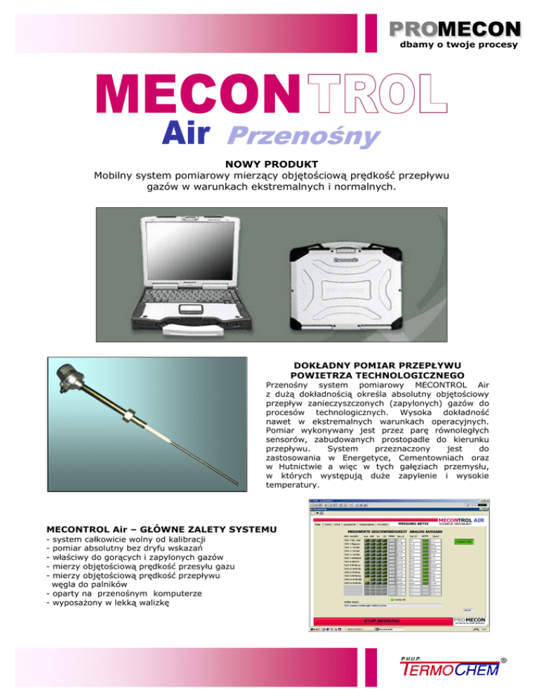 dbamy o twoje procesy NOWY PRODUKT Mobilny system pomiarowy mierzący objętościową prędkość przepływu gazów w warunkach ekstremalnych i normalnych. DOKŁADNY POMIAR PRZEPŁYWU POWIETRZA TECHNOLOGICZNEGO Przenośny system pomiarowy MECONTROL Air z dużą dokładnością określa absolutny objętościowy przepływ zanieczyszczonych (zapylonych) gazów do procesów technologicznych. Wysoka dokładność nawet w ekstremalnych warunkach operacyjnych. Pomiar wykonywany jest przez parę równoległych sensorów, zabudowanych prostopadle do kierunku przepływu. System przeznaczony jest do zastosowania w Energetyce, Cementowniach oraz w Hutnictwie a więc w tych gałęziach przemysłu, w których występują duże zapylenie i wysokie temperatury. MECONTROL Air – GŁÓWNE ZALETY SYSTEMU - system całkowicie wolny od kalibracji pomiar absolutny bez dryfu wskazań właściwy do gorących i zapylonych gazów mierzy objętościową prędkość przesyłu gazu mierzy objętościową prędkość przepływu węgla do palników - oparty na przenośnym komputerze - wyposażony w lekką walizkę dbamy o twoje procesy ZASTOSOWANIE Kotły pyłowe (pomiar powietrza pierwotnego, powietrza wtórnego oraz przepływu mieszanki pyłopopwietrznej węgla) Cementownie (powietrze obejściowe (bypass air), wylot z młyna, bilans powietrza do chłodnic klinkieru) Stalownie, Huty (piec koksowniczy, piec hutniczy, system powietrza wylotowego) Huty szkła (gazy wylotowe, gazy spalinowe i recyrkulacyjne etc.) DANE TECHNICZNE System pomiarowy MECONTROL Air Liczba kanałów do pomiaru wolumentarnego przepływu: Liczba kanałów do pomiaru wolumentarnego przepływu gazu STP: Liczba kanałów do pomiaru prędkości przepływu: Czas pomiaru: 4 lub 8 2 lub 4 4 lub 8 6 sekund Wejście Sygnał sensorów MECONTROL Air: 4 do 8 par Sensory temperaturowe: 2 x PT100 Sensory ciśnieniowe: skalowane 4-20 mA Sensory Długość: 600 lub dłuższe na zapytanie Montaż: Dławicowy Ochrona: IP 65 Zakres temperatur: 0 – 60oC Zakres stosowalności Temperatura gazu: 0 – 1100OC Prędkość liniowa gazu: 5 – 60 m/s 10 – 50 m/s w przypadku węgla i innych cząstek Prędkość cząstek stałych w gazie: stałych Przenośny komputer procesowy Model: Panasonic® TOUGHBOOKTM wyposażony w ekran dotykowy Procesor CPU: Intel® PentiumTM M Pamięć operacyjna RAM: 256 MB Dysk twardy HDD: 40 GB Interfejsy danych: Ethernet, USB 2.0, 2x4 pin Walizka Wymiary: 700 x 500 x 450 mm Waga: 20 kg Przyłącze: 100 – 240 V, 50/60 Hz WYŁĄCZNY PRZEDSTAWICIEL NA TERENIE POLSKI: Biuro: PL 95-015 Głowno ul. Bielawska 3 tel./fax. +48 42 640 56 05, 640 56 96 http://www.termochem.com.pl http://mecontrol.termochem.com.pl mailto: [email protected] PL 95-015 Głowno ul. Łowicka 12
