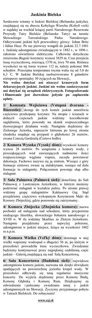 Jaskinia Bielska Serdecznie witamy w Jaskini Bielskiej (Belianska jaskyňa), znajdującej się na zboczu Kobylego Wierchu (Kobylí vrch) w najdalej na wschód leżącej partii Narodowego Rezerwatu Przyrody Tatry Bielskie (Belianske Tatry) na terenie Słowackiego Tatrzańskiego Parku Narodowego. Odkrywcami jaskini byli przewodnicy górscy: Johan Britz i Július Husz. Po raz pierwszy wstąpili do jaskini 22.7.1881 r. Jaskinię udostępniono zwiedzającym w 1882 r., w 1896 r. założono oświetlenie elektryczne. Całkowita dotychczas zmierzona długość korytarzy wynosi 3829 m. Czas przejścia trasą wycieczkową, mierzącą 1370 m, trwa 70 min. Różnica wysokości na tej trasie wynosi 112 m, należy pokonać 866 schodów. Przeciętna temperatura roczna waha się od 5,0 do 6,3 °C. W Jaskini Bielskej zaobserwowano 8 gatunków nietoperzy spomiędzy 30 żyjących na Słowacji,. Nie wolno dotykać ani niszczyć krasowych form dekoracyjnych jaskini. Jaskini nie wolno zanieczyszczać ani dotykać się urządzeń elektrycznych. Fotografowanie i filmowanie jest dozwolone jedynie po zapłaceniu opłaty. 1/ Komnata Wejściowa (Vstupná dvorana Rázcestie): dostęp do tych komór jaskini umożliwia częściowo przekopany korytarz. Na stropie i ścianach w dolnych częściach jaskini widzimy kociołkowate zagłębienia, które powstały na skutek rozpuszczalnego (korozyjnego) działania wody. Następnie dojdziemy do Zielonego Jeziorka, naprzeciw któremu po lewej stronie chodnika znajduje się przepaść o głębokości 26 metrów, zwana Czarcią Gardzielą (Čertove hrdlo). 2/ Komora Wysoka (Vysoký dóm): wysokość komory wynosi 28 metrów. Po ustąpieniu z komory wody, z przesiąkających wód zawierających nadmierne ilości rozpuszczonego węglanu wapnia, zaczęła powstawać dekoracja. Fachowo nazywa się ją sintrem. Wiszące z góry formacje sintrowe zwane są stalaktytami, rosnące od dołu formacje to stalagmity. Połączeniem powstaje słup albo stalagnat. 3/ Sala Palmowa (Palmová sieň): dotarliśmy do Sali Palmowej z Lustrzanym Jeziorkiem, w którym możemy podziwiać stalagmit w kształcie palmy. Po stronie prawej widzimy grupę stalagmitów Kaktusowy Gaj. Stąd przejdziemy częściowo wykopanym Korytarzem Męki do Komory Zbójeckiej, gdzie ponownie się zatrzymamy. 4/ Komora Zbójecka (Zbojnícka komora): nazwa pochodzi od stalagnatu nad schodami, który przypomina siedzącego Jánošíka, słowackiego bohatera narodowego z XVIII w. W tle widzimy Skarbiec ze Złotym Jeziorkiem. Następnie przejdziemy przez najwyżej położone, udostępnione w jaskini miejsce, leżące na wysokości 1002 m n.p.m. 5/ Komora Wielka (Veľký dóm): dominuje w niej wielki wapienny wodospad o długości 56 m, po którym w przeszłości prowadziła trasa wycieczkowa. Zwiedzanie będziemy kontynuować przez najpiękniej ozdobioną część jaskini – Galerię,znajdującą się nad Salą Koncertową. 6/ Sala Koncertowa (Hudobná sieň): największa udostępniona komora jaskini, nazwana tak dzięki dźwiękom spadających na powierzchnię jeziorka kropel wody. W przeszłości odbywały się tutaj regularnie muzyczne koncerty. Do wyjścia dojdziemy przez Komorę Białą, Komorę Głęboką i Komorę Ruin. Dziękujemy za odwiedzenie i polecamy zwiedzanie innej z jaskiń udostępnionych na Słowacji. Życzymy przyjemnego pobytu w Tatrach Bielskich. Do zobaczenia! www.ssj.sk